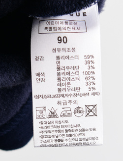 제품소재 (겉감)폴리에스터59%,면38%,폴리우레탄3%(배색)폴리에스터100%(안감)폴리에스터62%,레이온33%,폴리우레탄5%