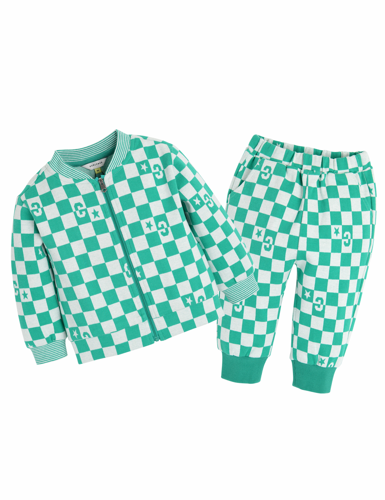 컬러감과 트렌디한 체커보드 패턴이 돋보이는 베이비 집업 상하세트입니다.집업형태로 착용이 용이하며 하의 밑단도립쁘로 잡아주어 편안하게 착용하기 좋은 아이템입니다.