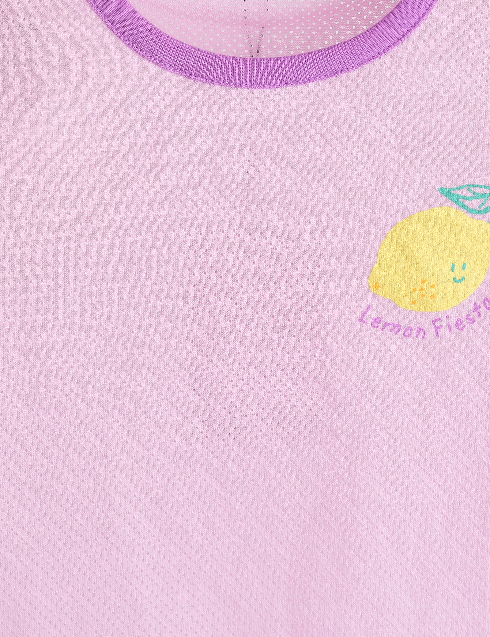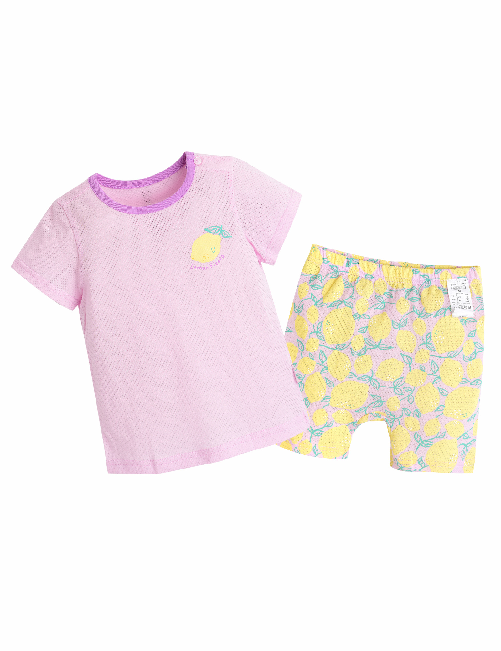귀여운 레몬 나염지에 레몬 그래픽으로포인트를 준 베이비 상하복입니다. 시원한 면메쉬 소재를 사용하여 몸에 달라붙지 않고 시원하게 착용하기 좋습니다.