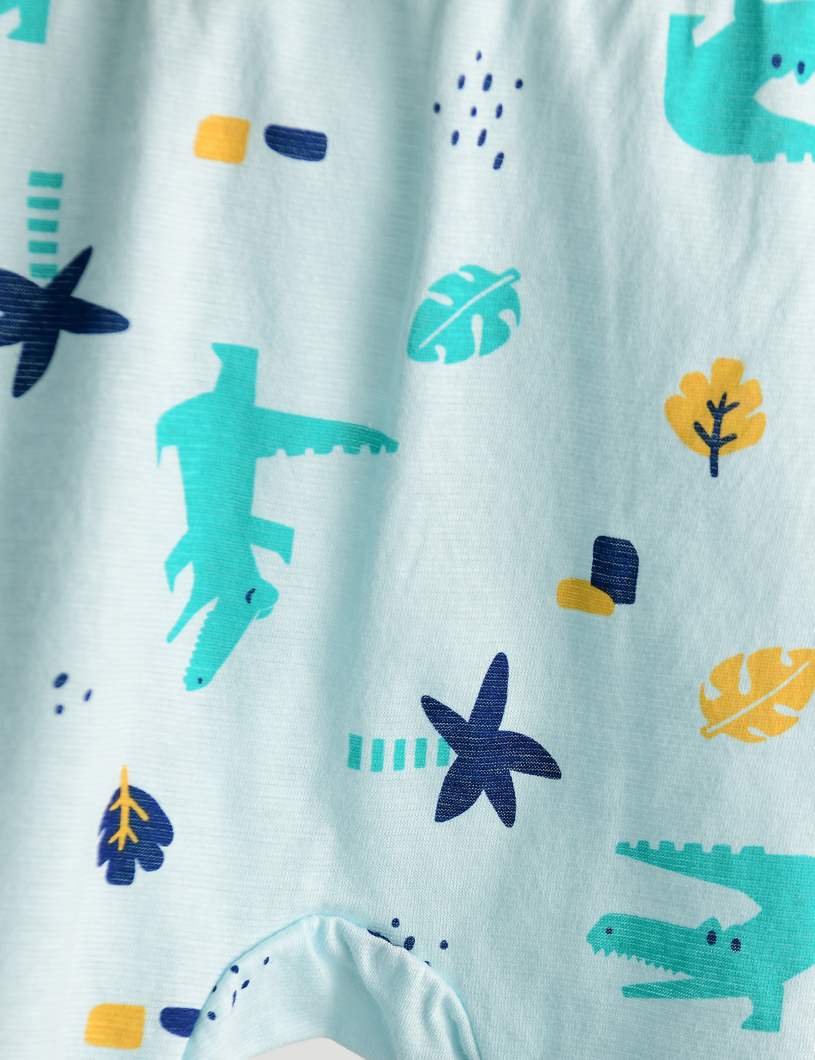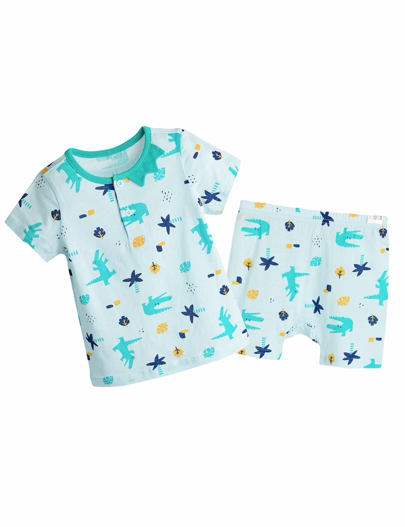 네크라인에 귀여운 장식모티브가 들어간 베이비 상하복입니다. 도형느낌의 악어 나염지를 사용하여 귀여운 느낌을 더했습니다. 자가드 원단을 사용하여 몸에달라붙지 않아 여름철 시원하게 착용하기 좋습니다.