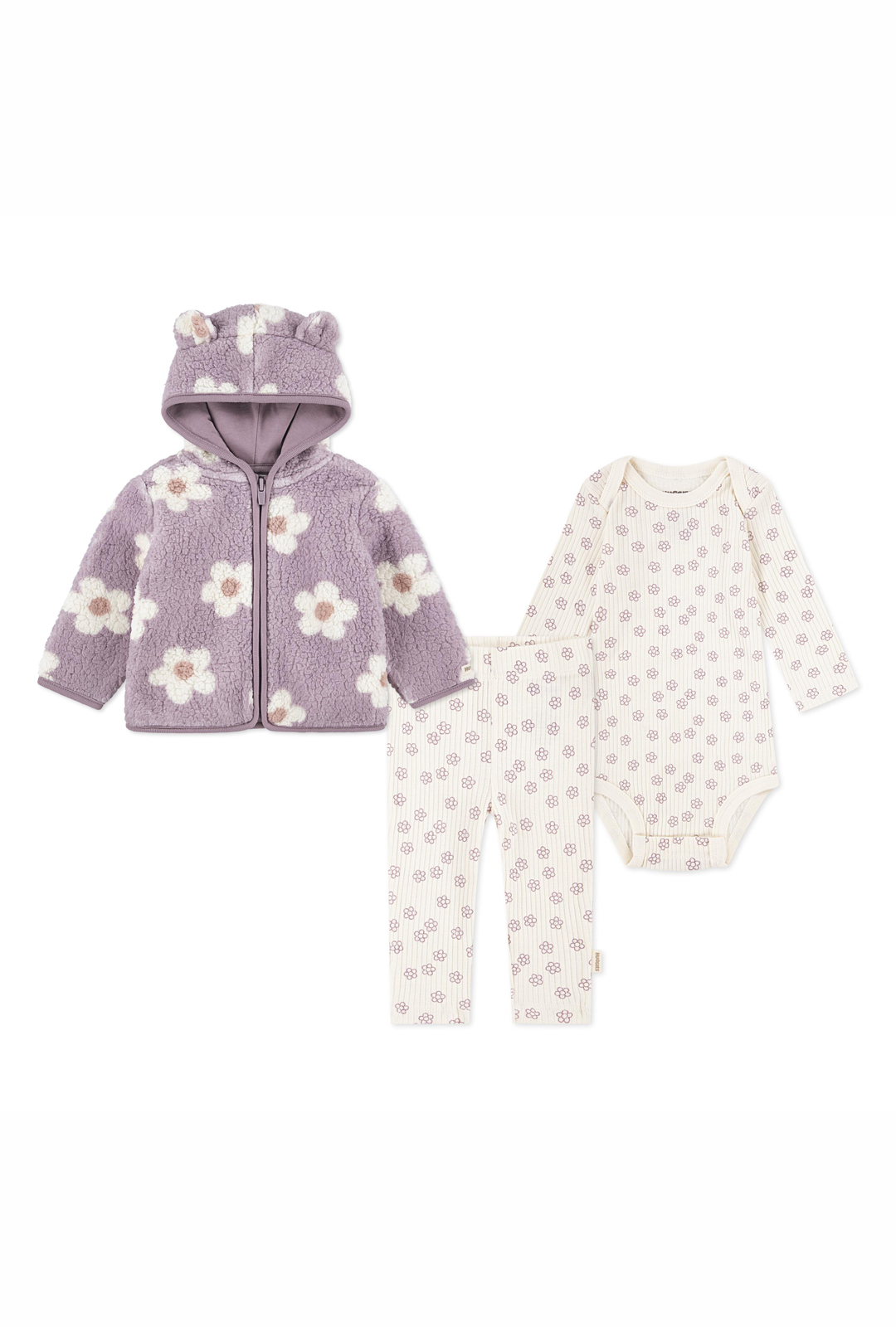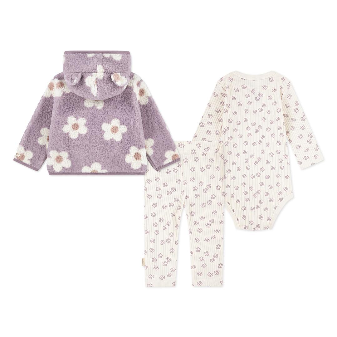 러블리한 플라워 패턴과 곰돌이 귀가 달린 보송보송 후드 집업으로 귀여움을 더한 아기 3종 세트입니다. 플라워 패턴의 바디수트와 팬츠가 함께 구성되어 실내외 어디서든 편안하고 스타일리시하게 착용할 수 있어요. 포근함과 활동성을 동시에 갖춘, 선물용으로도 손색없는 아이템입니다.