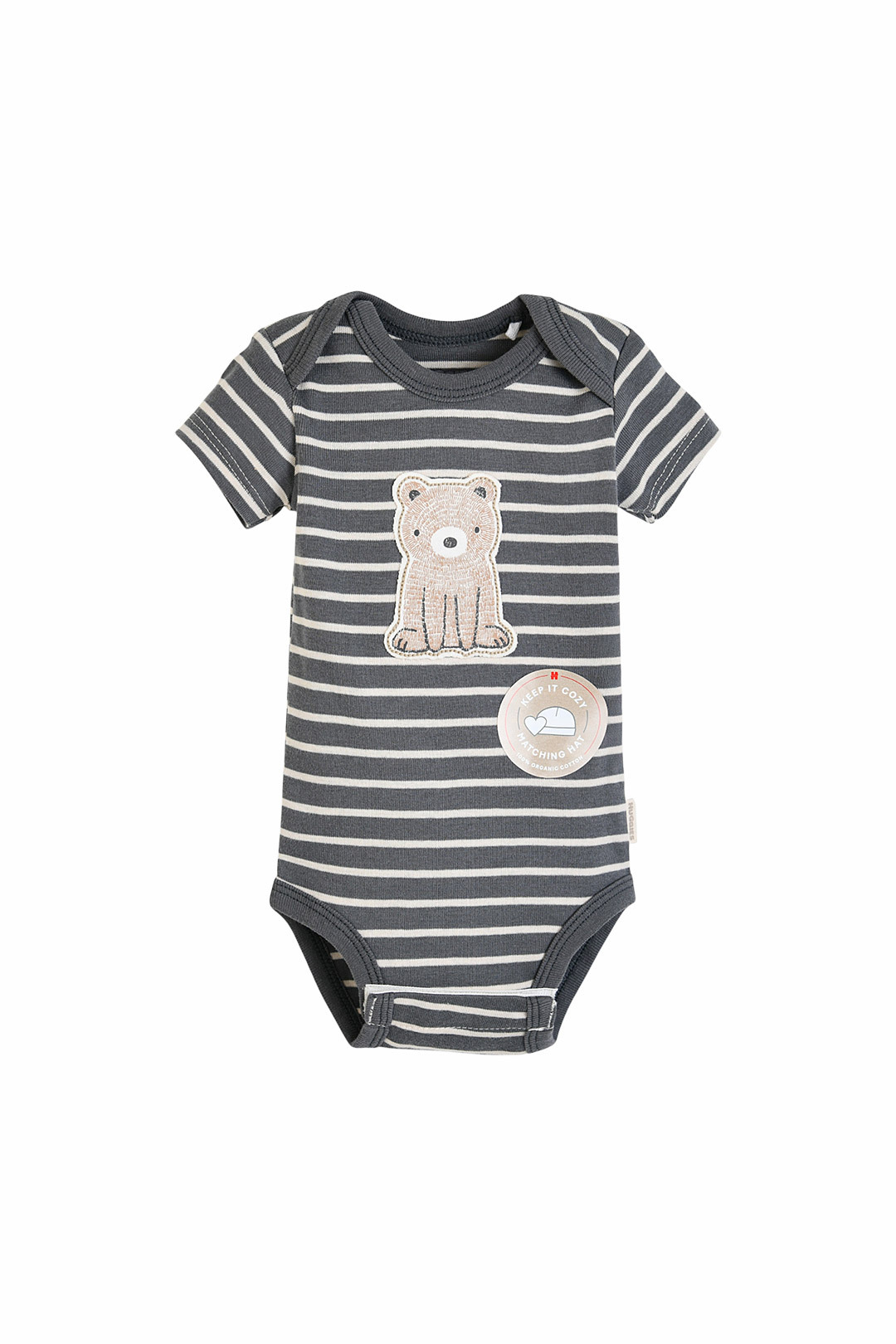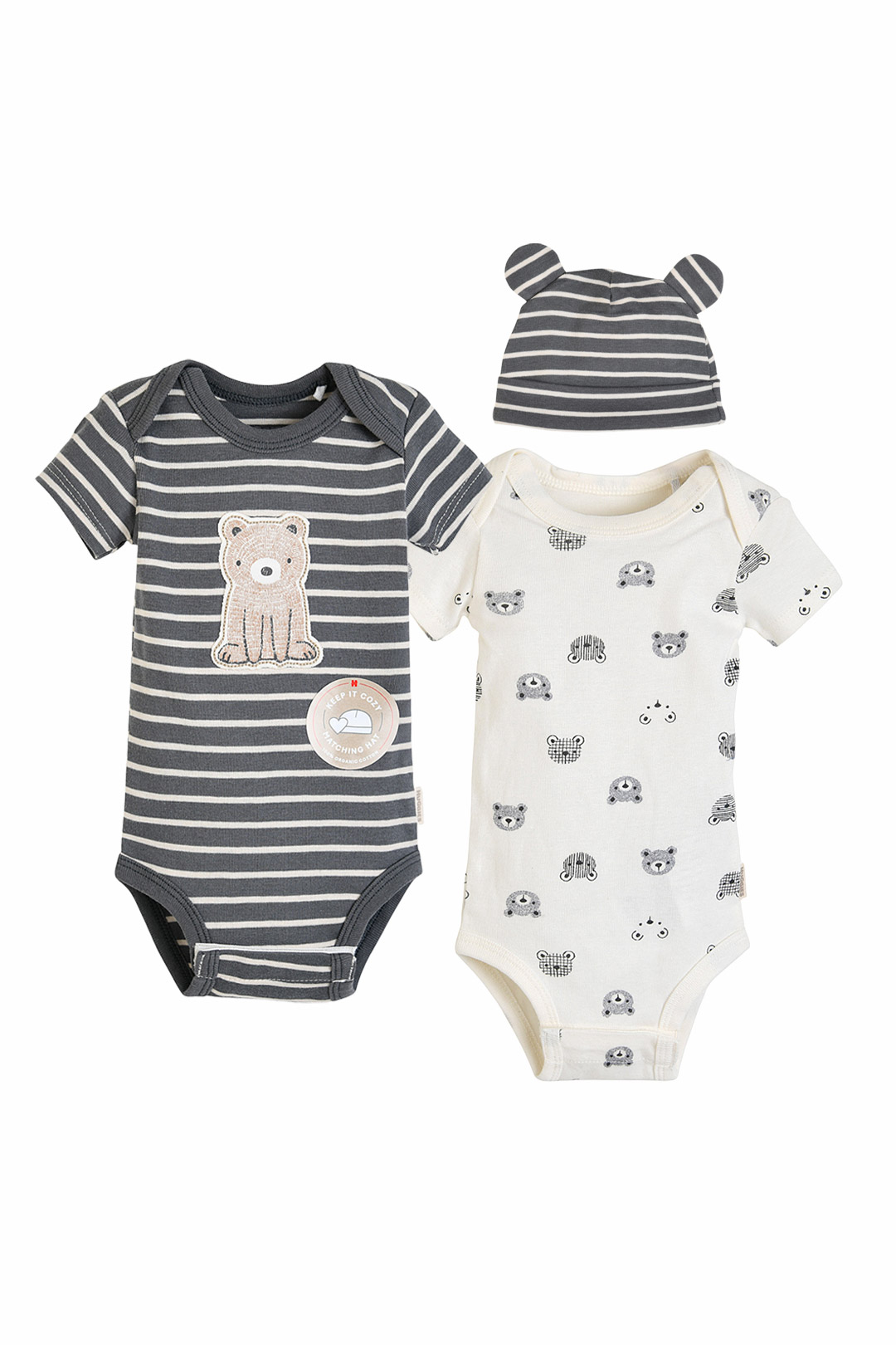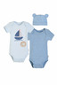100% 오가닉 콤드 코튼 소재를 활용한 반팔 바디수트 2종과 모자세트.