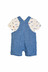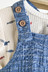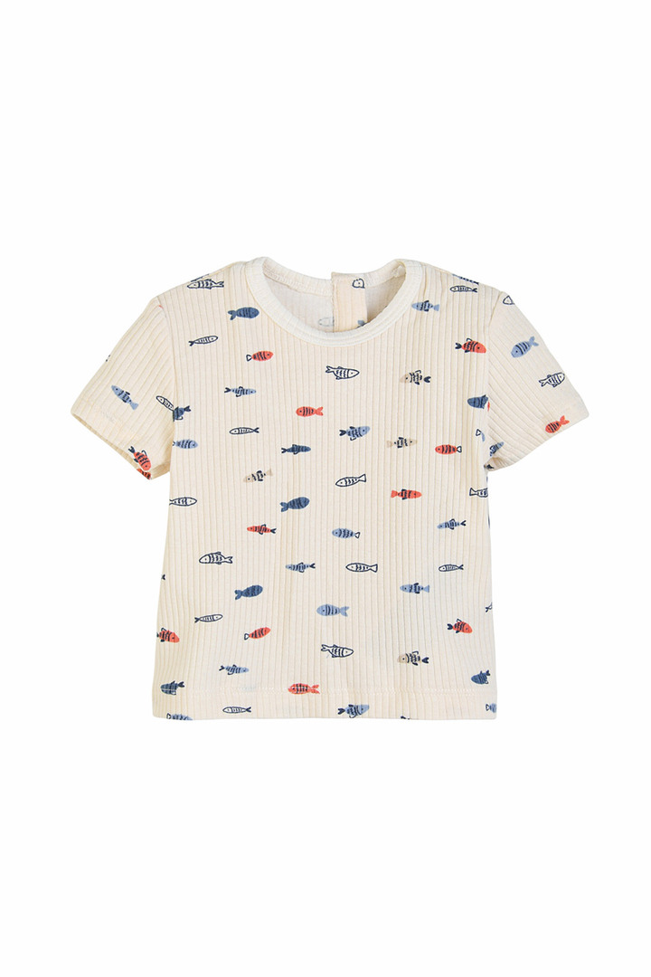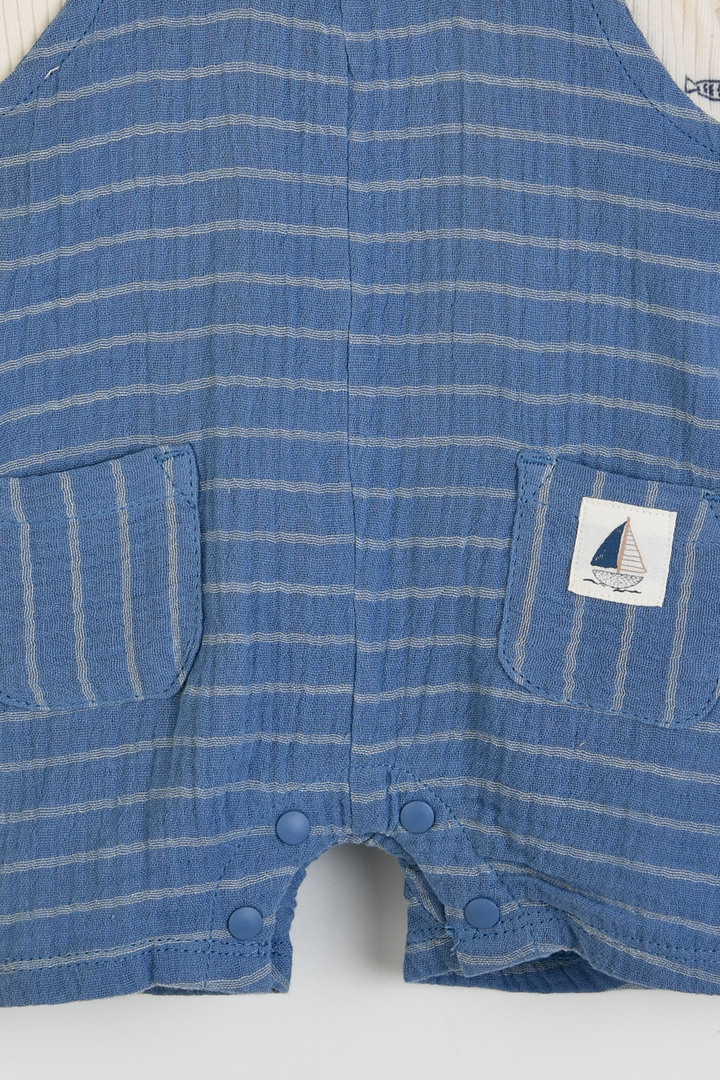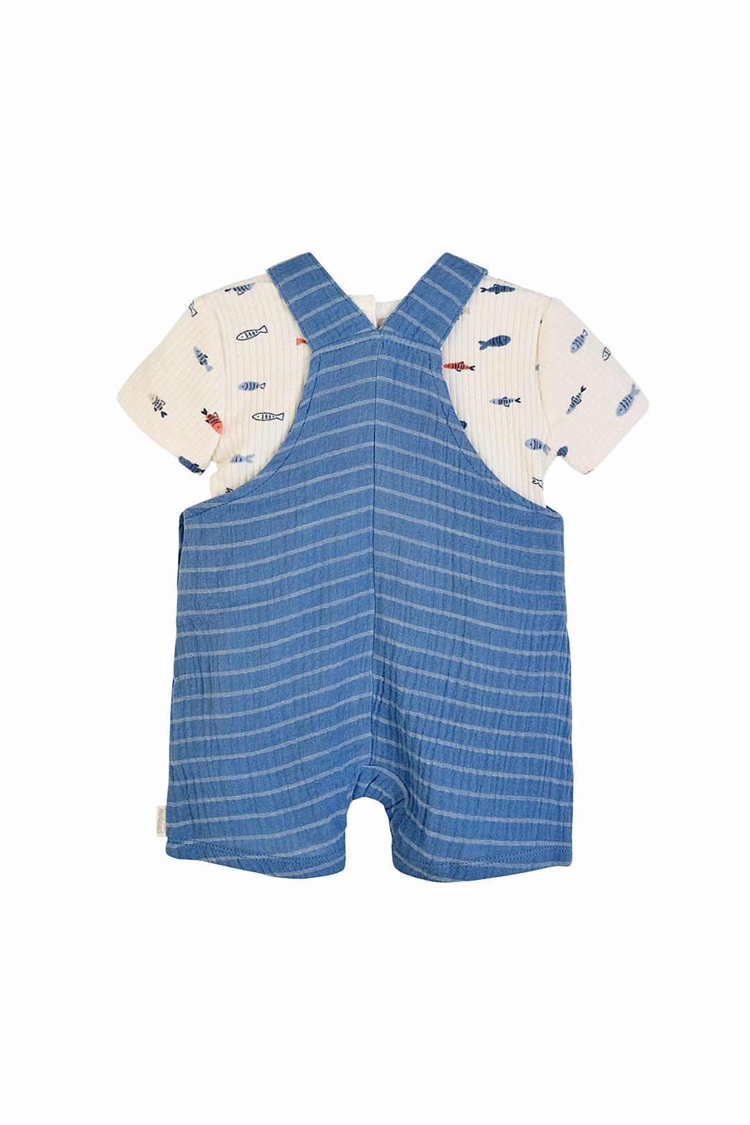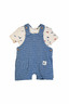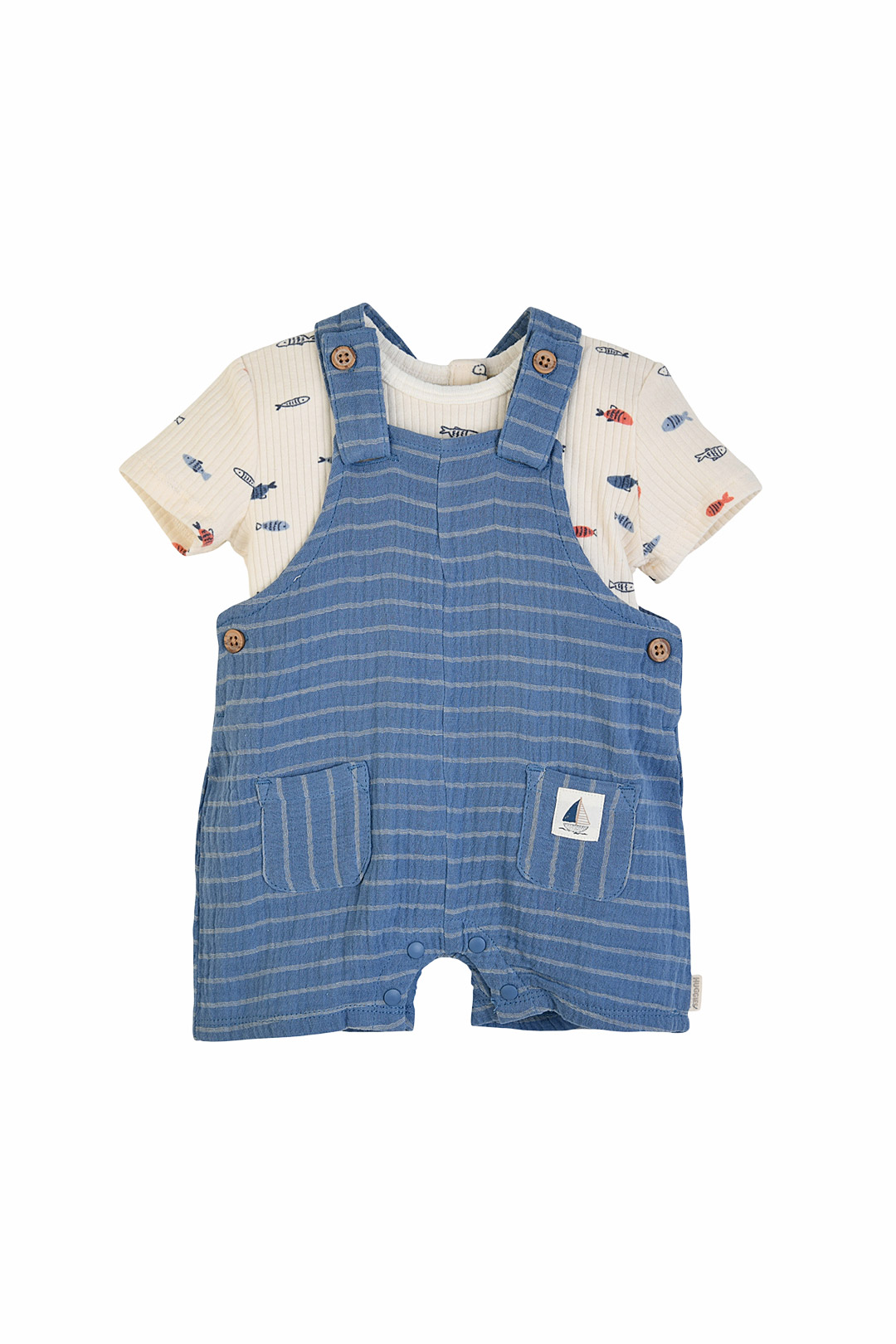 올오버 물고기 나염 그래픽의 귀여운 반팔 티셔츠와 스트라이프의 시원한 느낌의 오버롤이 세트로 구성이 되어 있어 가성비 좋은 아이템입니다. 앞 포켓에는 돗단배 포인트 라벨을 부착하여 귀여운 이미지를 주었습니다.