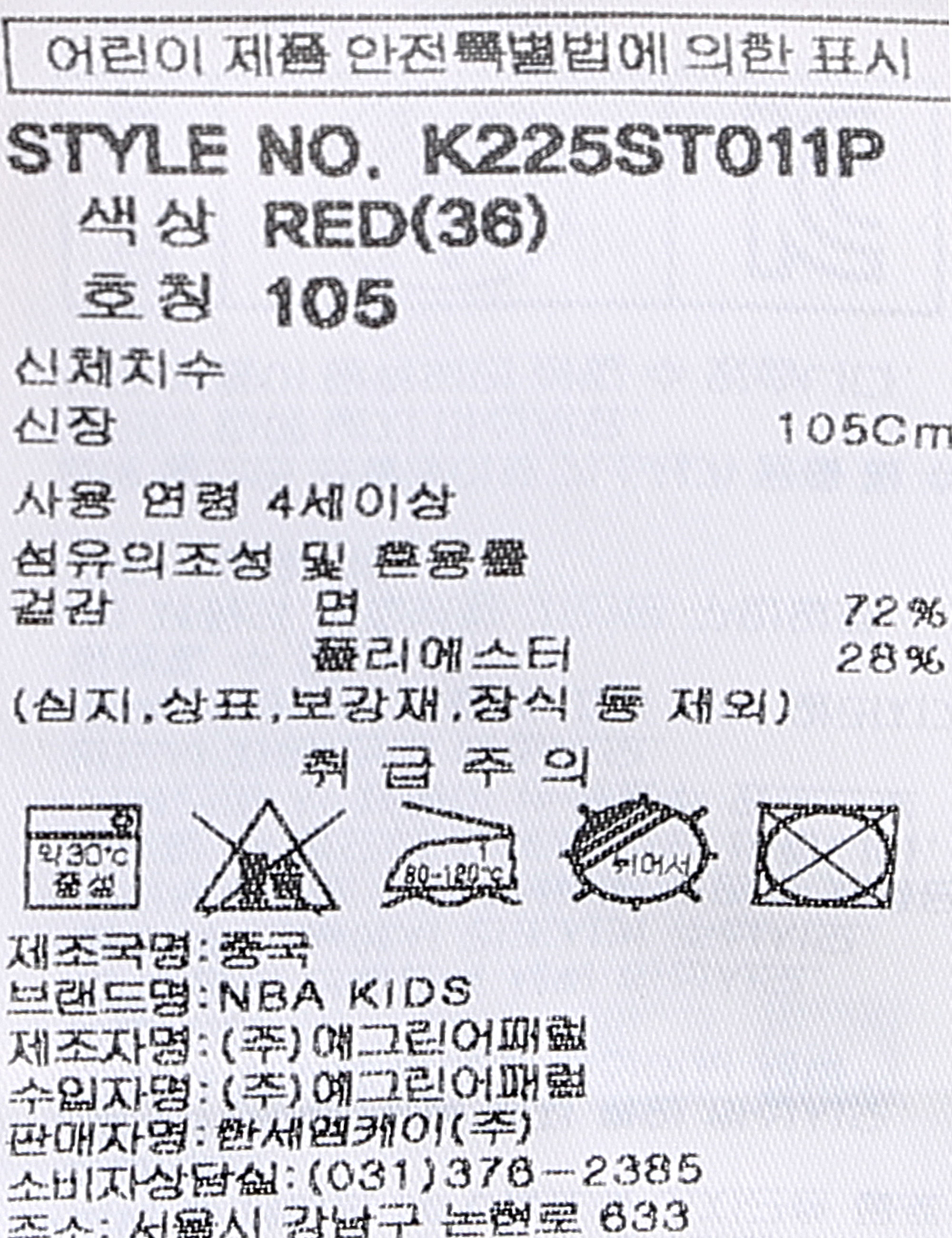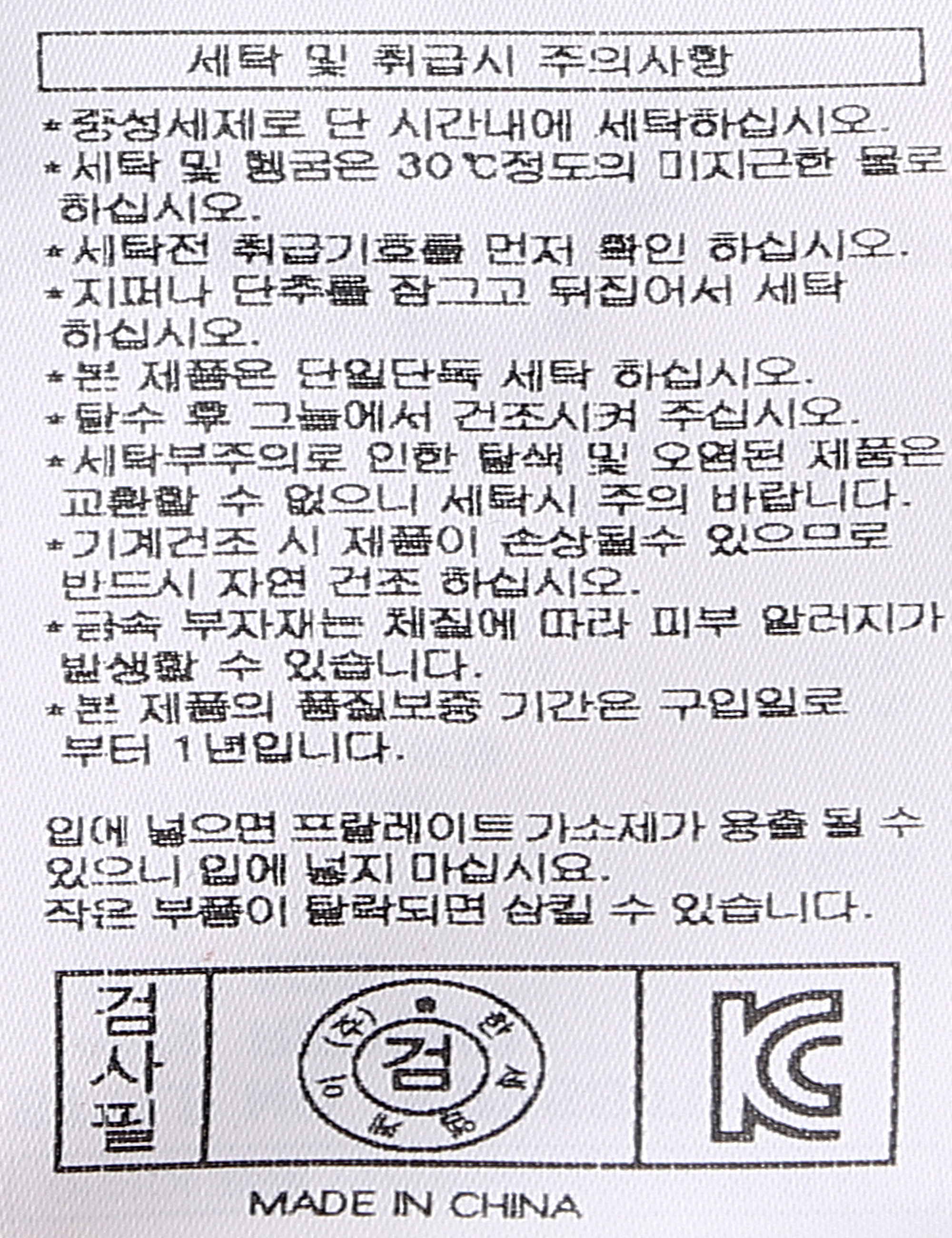 | 세탁방법 및 취급시 주의사항 | 중성세제로 단 시간내에 세탁하십시오.(케어라벨참고) |
