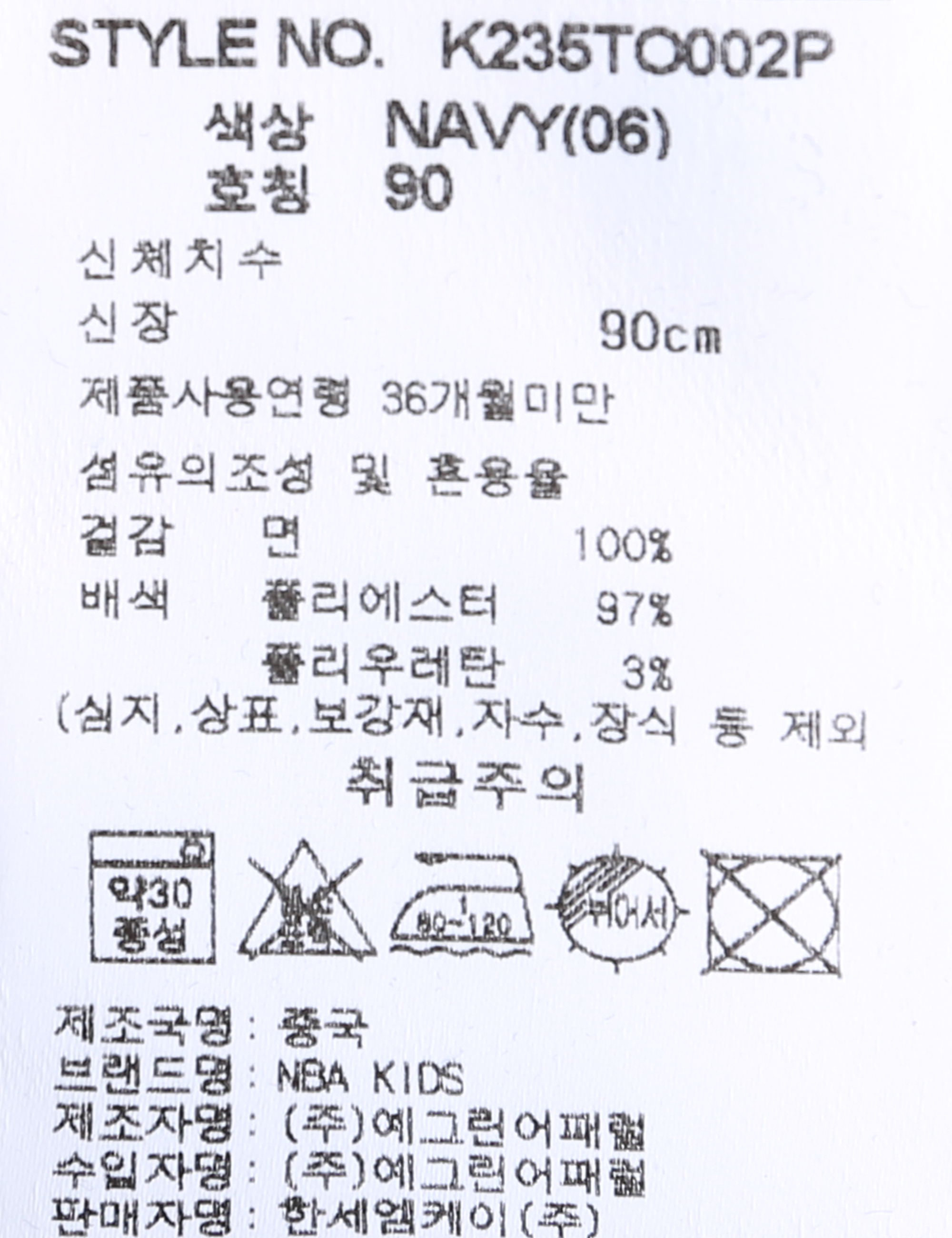 제품소재 [겉감]면100% [배색]폴리에스터97% 폴리우레탄3%