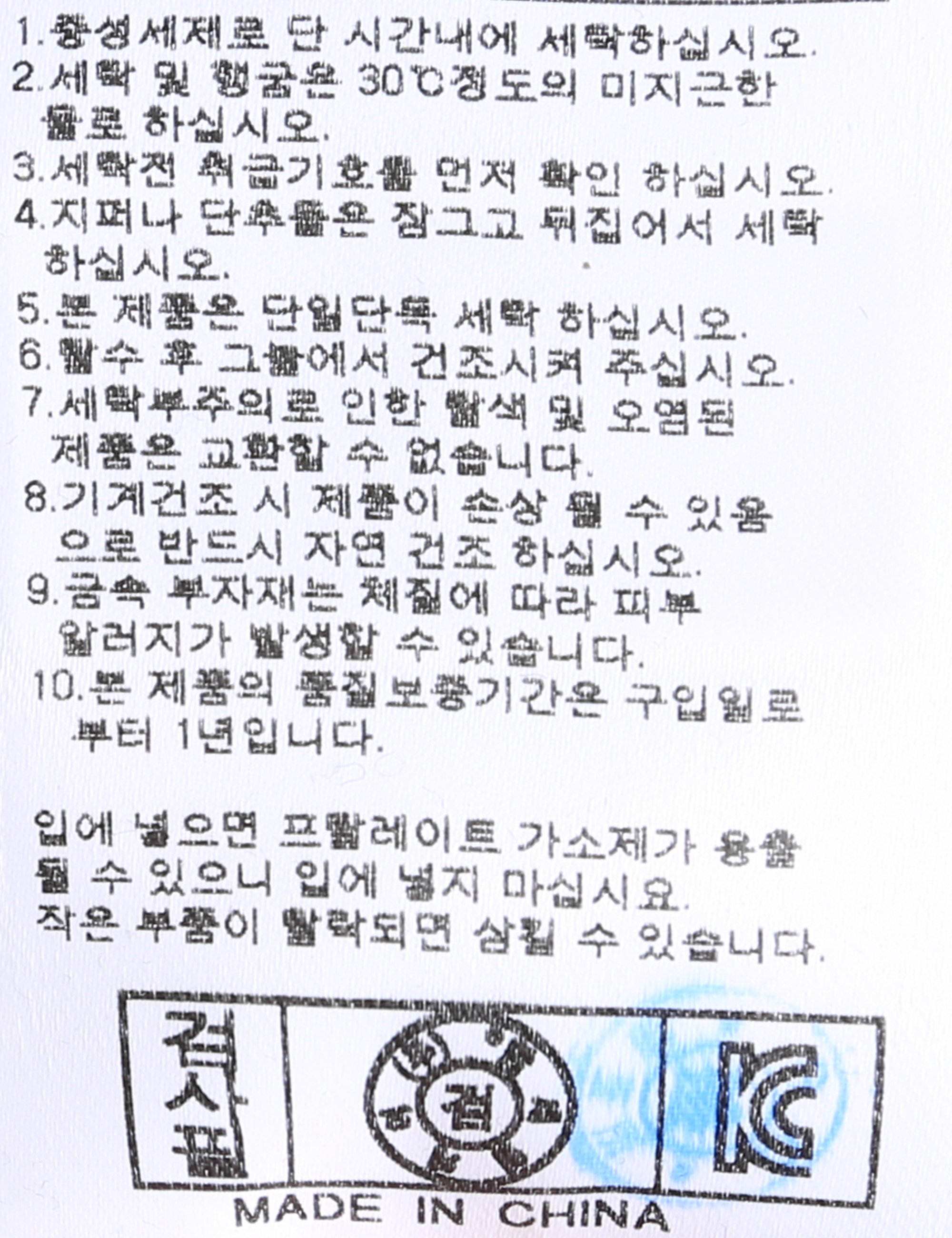 세탁방법 및 취급시 주의사항 중성세제로 단 시간내에 세탁하십시오.(케어라벨참고)