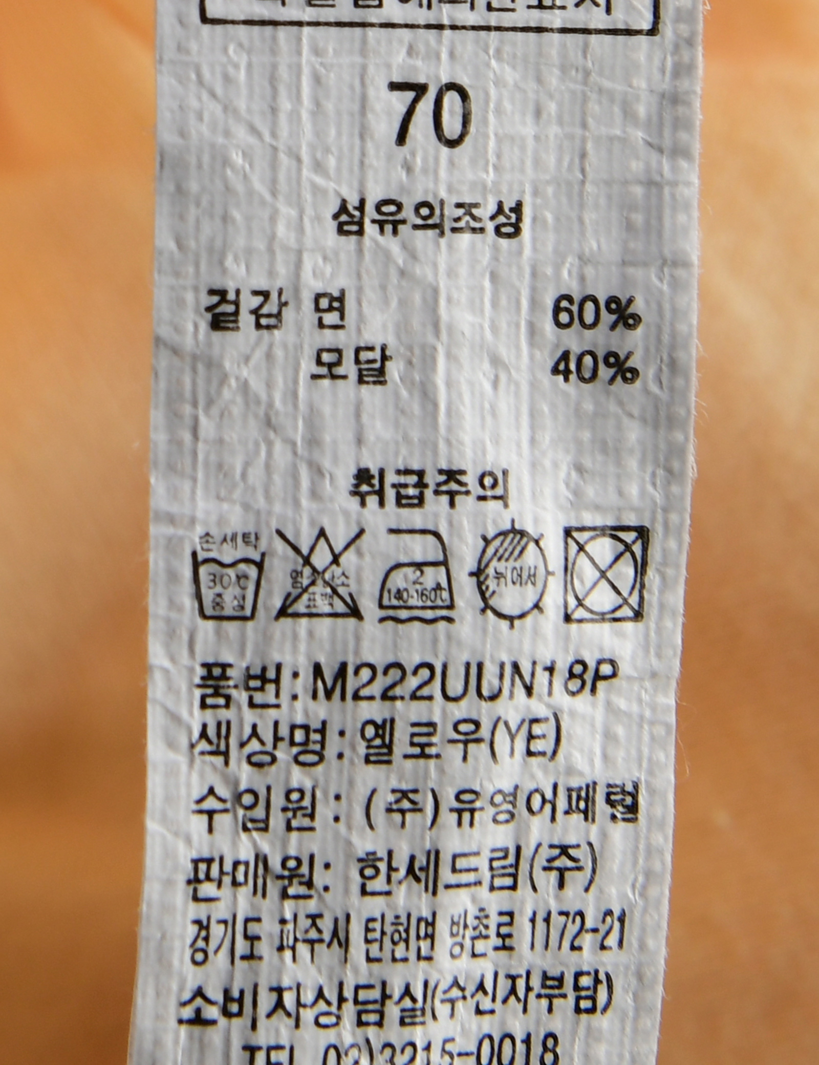| 세탁방법 및 취급시 주의사항 | 본 세품은 손세탁 하십시오(케어라벨 참고) |
