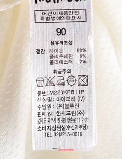 세탁방법 및 취급시 주의사항 1.드라이클리닝을 권장합니다. 2.미지근한 물에 짙은 색상과 흰색은 분리하여 손세탁 하십시오. 3.세탁기 세탁시 손상 될 수 있으니 삼가해주십시오. 4.합성세제,염소표백제는 손상 및 탈색될 우려가 있으니 삼가해주시고 물에 오랜시간(30분이상) 담가두지 마십시오. 5.땀을 흘렸을 경우 오염 및 탈색될 수 있으므로 신속히 세탁과 탈수를 권합니다. 6.옷걸이를 사용하지 마시고 뉘어서 건조하십시오.