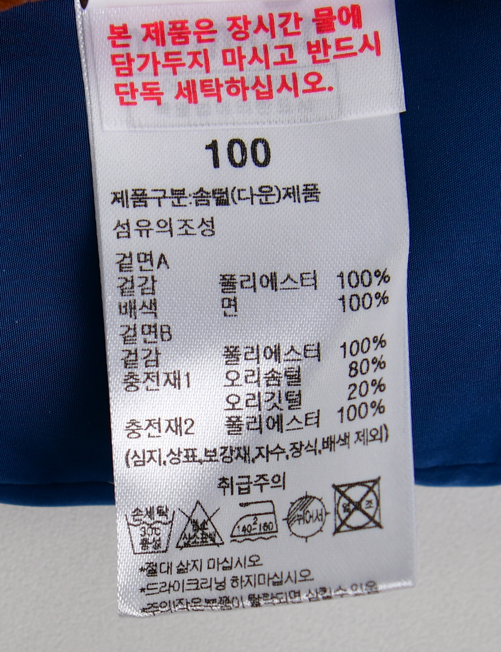 제품소재 (겉감A/겉감B/충전재2)폴리에스터100%(배색)면100%(충전재1)오리솜털80%,오리깃털20%