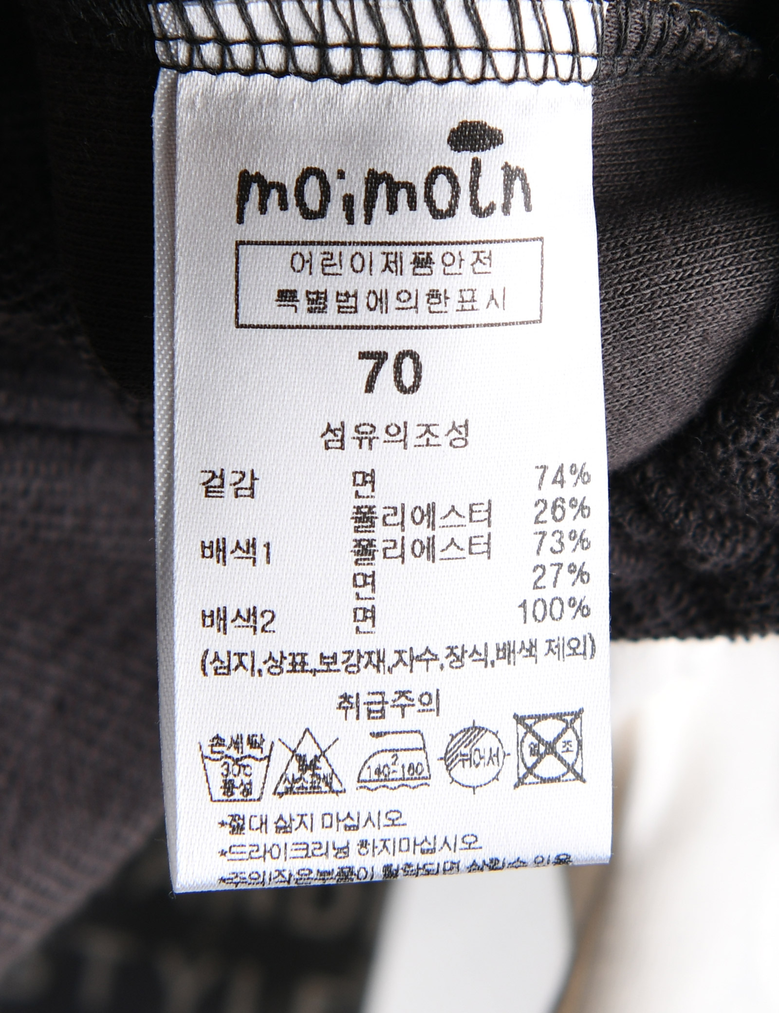 제품소재 (겉감)면74%,폴리에스터26%(배색1)폴리에스터73%,면27%(배색2)면100%
