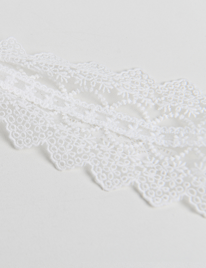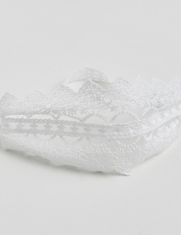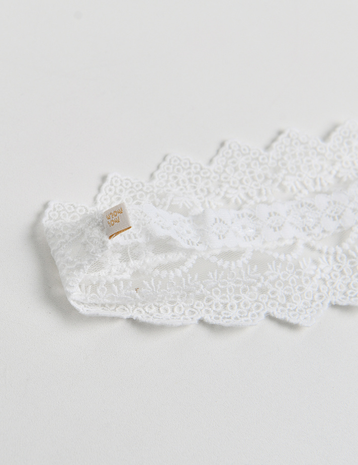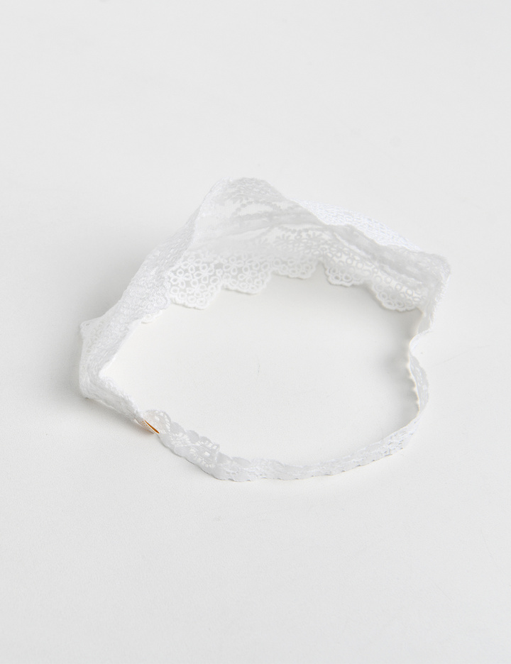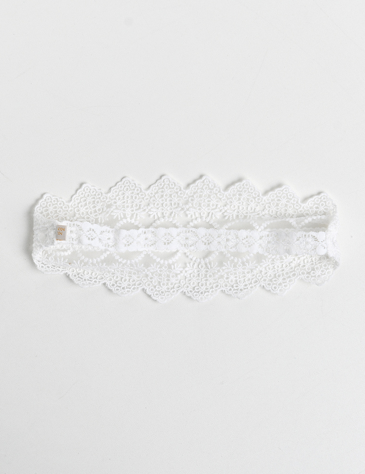 자수 레이스 위로 끈 레이스를 눌러 박아 고급스러운 컬칩 형태의 헤어밴드.
