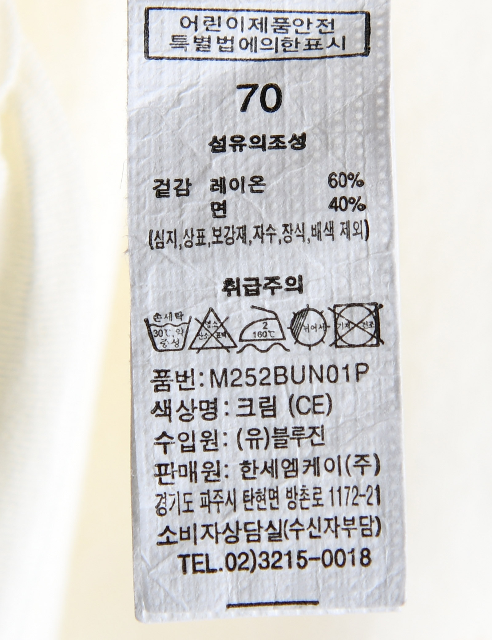 | 세탁방법 및 취급시 주의사항 | 본 세품은 손세탁 하십시오(케어라벨 참고) |