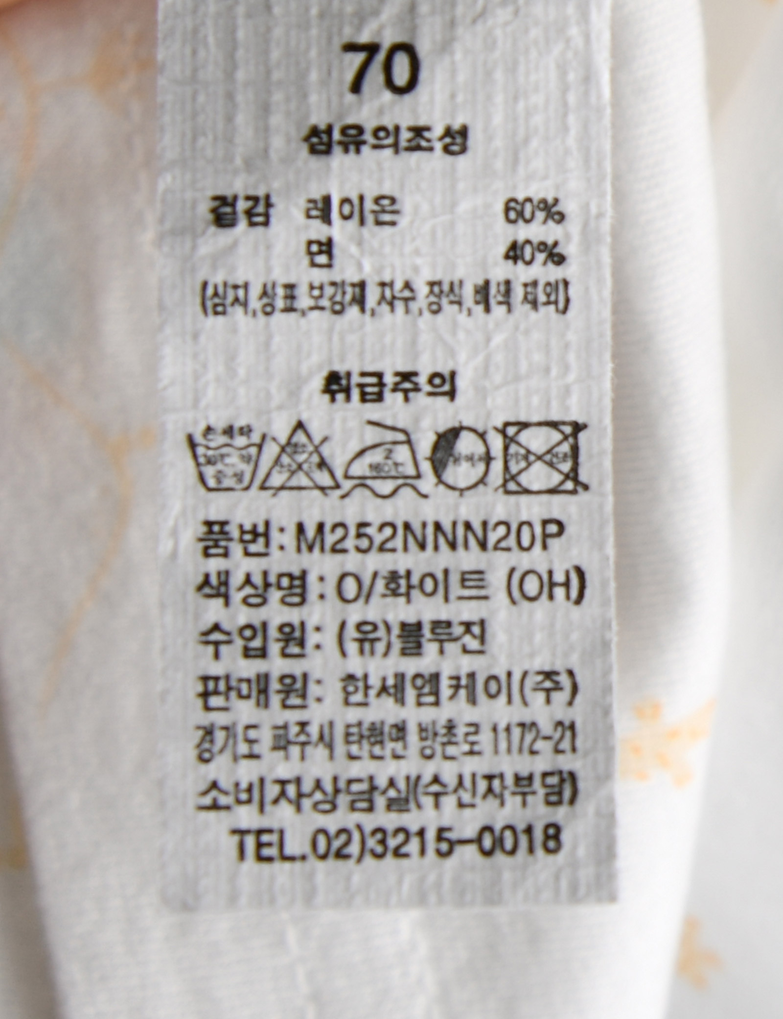 | 세탁방법 및 취급시 주의사항 | 본 세품은 손세탁 하십시오(케어라벨 참고) |