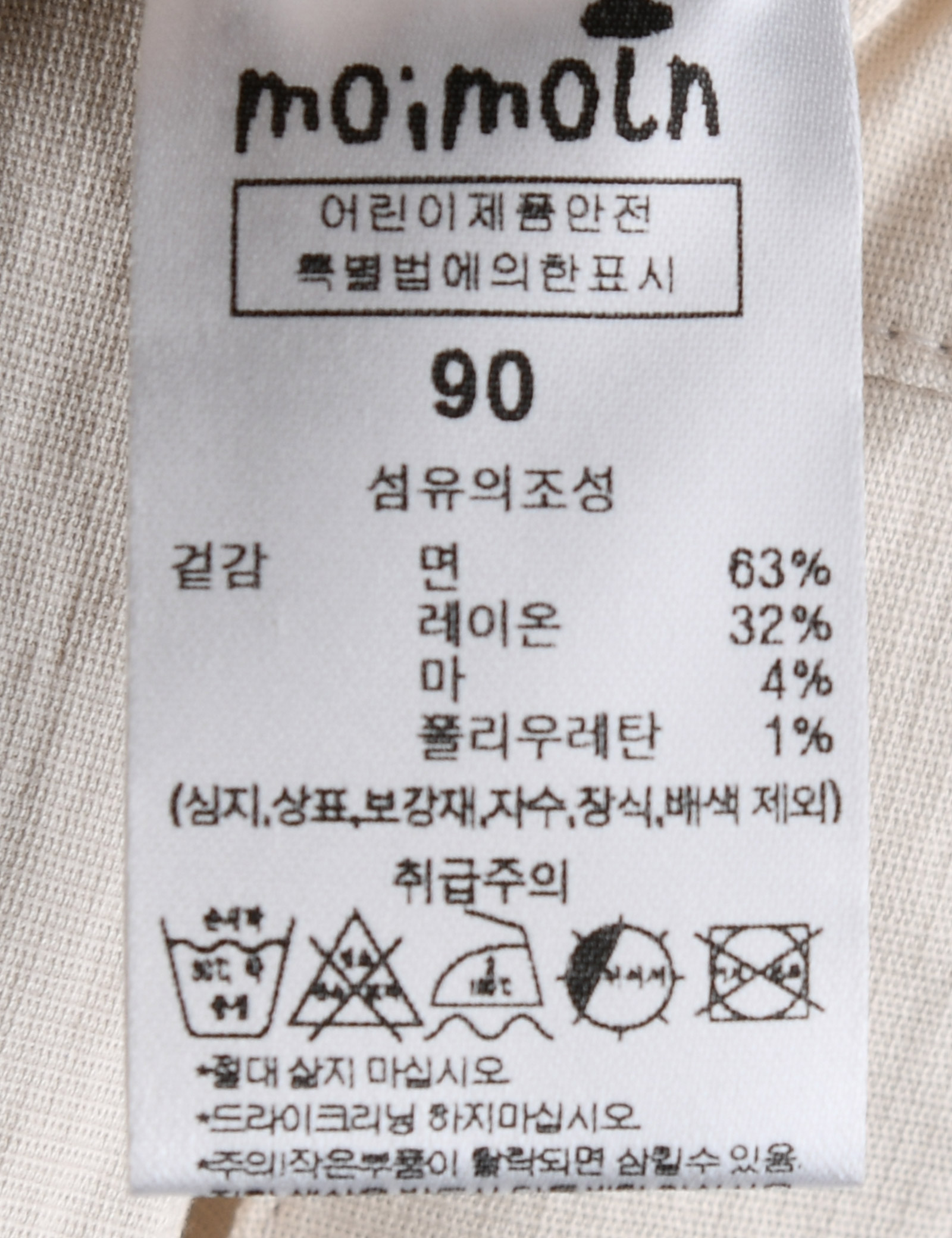 | 세탁방법 및 취급시 주의사항 | 본 세품은 손세탁 하십시오(케어라벨 참고) |