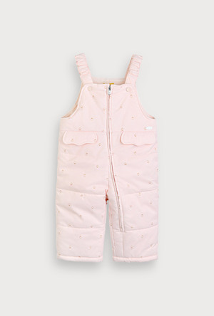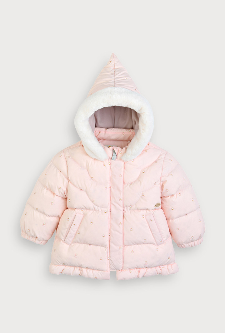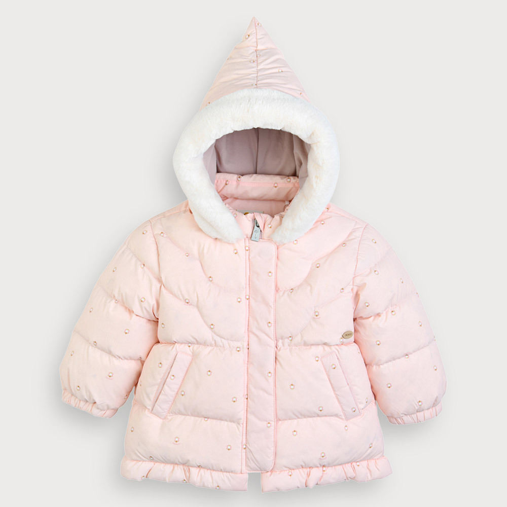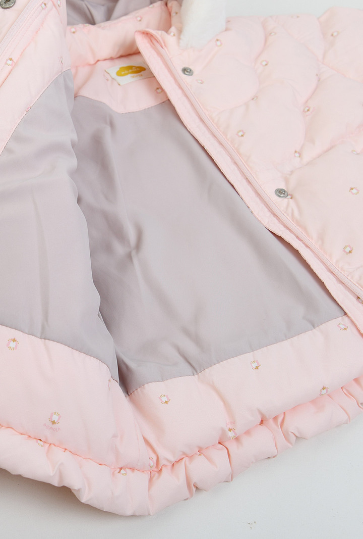 스캘롭 모양 누빔이 유니크하면서도 귀여운한 겨울용 헤비 아우터. 후드털 배색이 한층 더포근한 느낌을 주며,밑단 프릴 장식도 핏에 귀여움을 더해주는 스타일의 덕다운 점퍼. L/핑크계는 보에트패딩오버올(M254OVB15P)과 한벌 착장이 가능하며, 크림계는 어디에나 코디가 가능한 기본 아이템