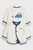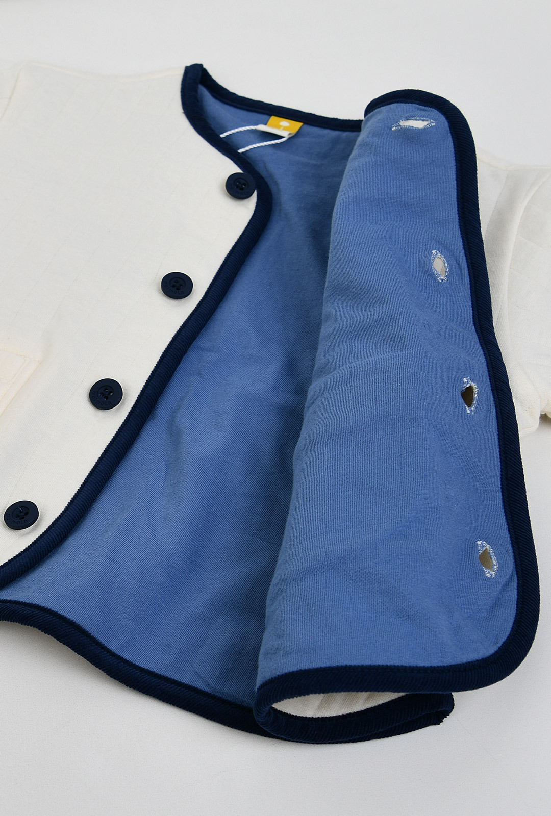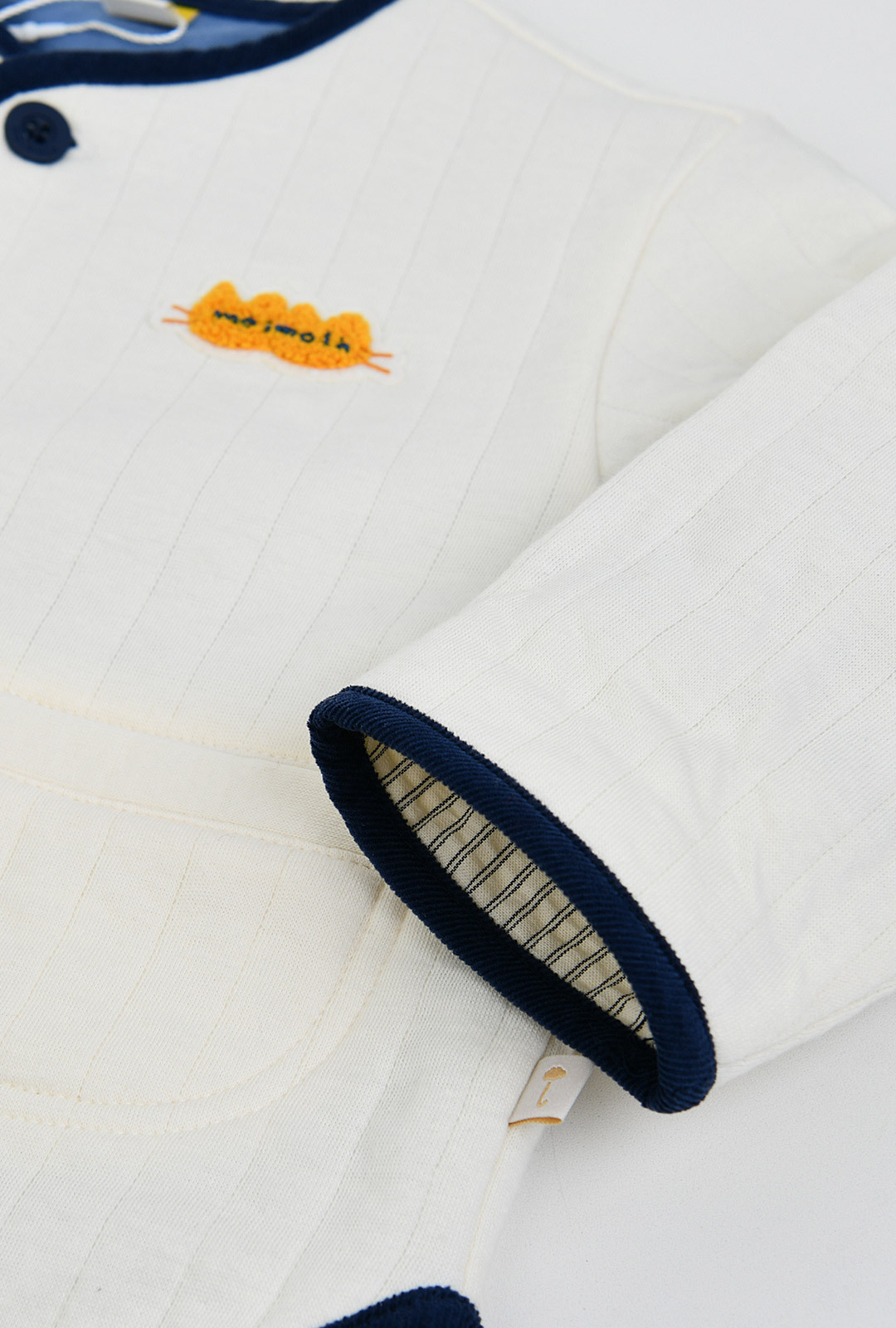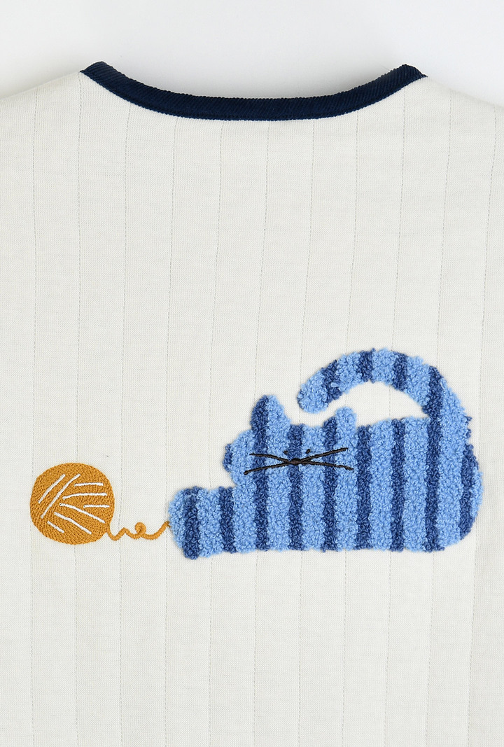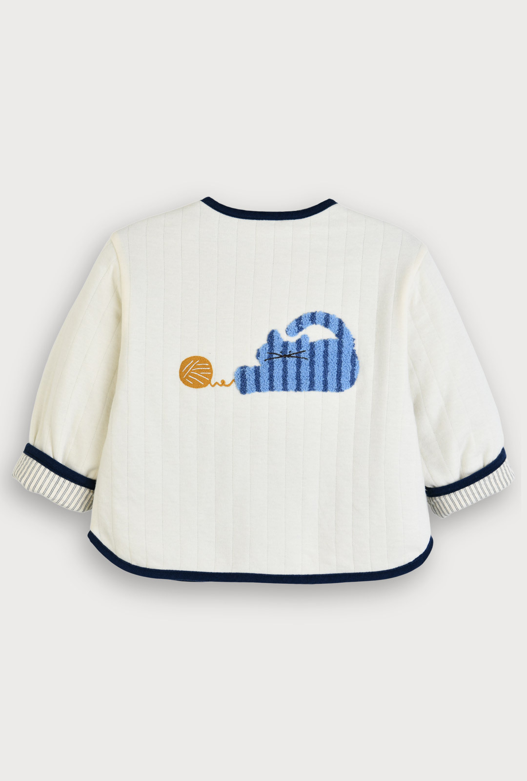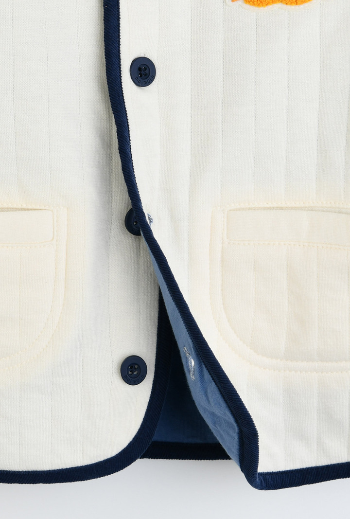 간절기 시즌에 활용하기 좋은부드러운 면 삼중지 소재의깔끔한 아이보리 점퍼.포근한 싱글 원단의 안감으로착용감이 좋으며,등판의 귀여운 고양이 부클자수가포인트 되는 아이템.소매를 걷어 올리면안단의 스트라이프 우븐 배색이보여지는 매력이 있는가디건형 점퍼 아이템