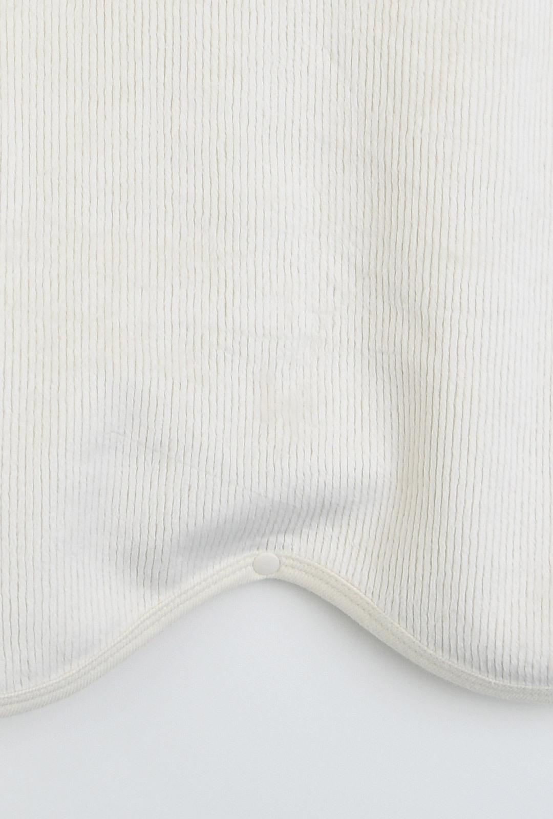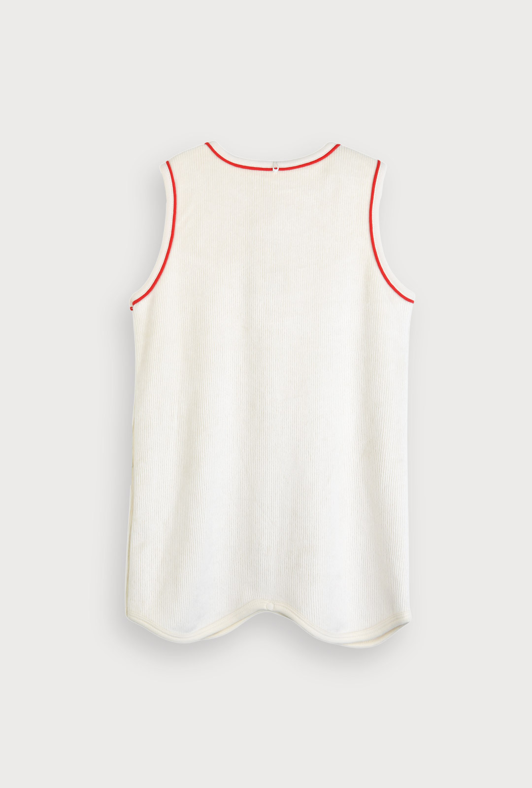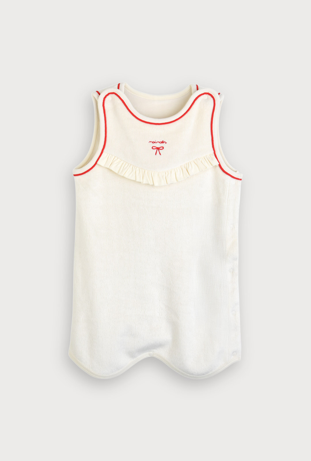 보온성이 좋은 골 벨로아 소재로 수면시 아이의 체온을 따뜻하게 유지시켜주는 아이템. 포근한 솔리드 크림 컬러에 레드 삥 포인트를 주고 가슴에 리본 모티브 자수로 러블리함을 더한 수면조끼