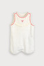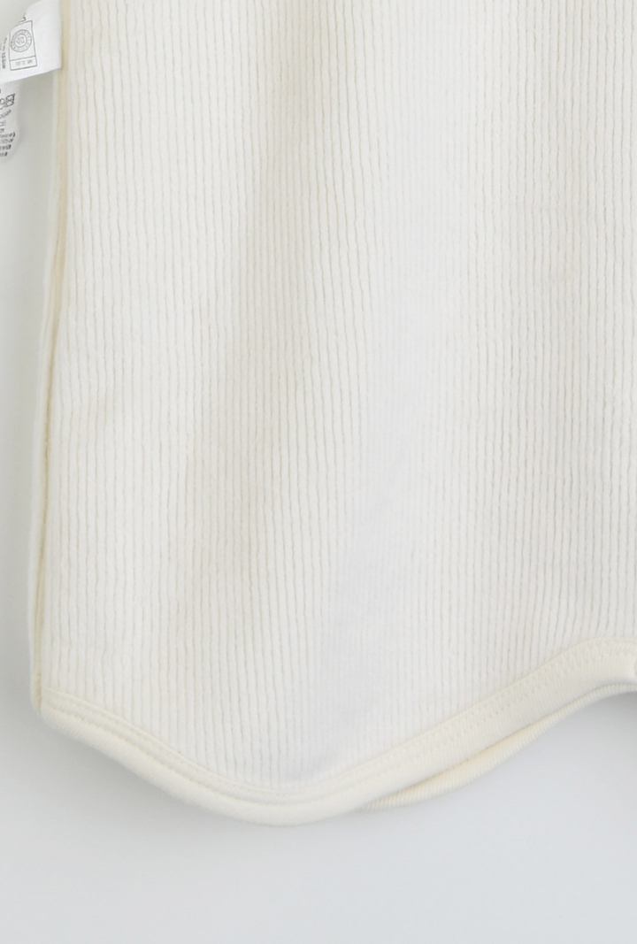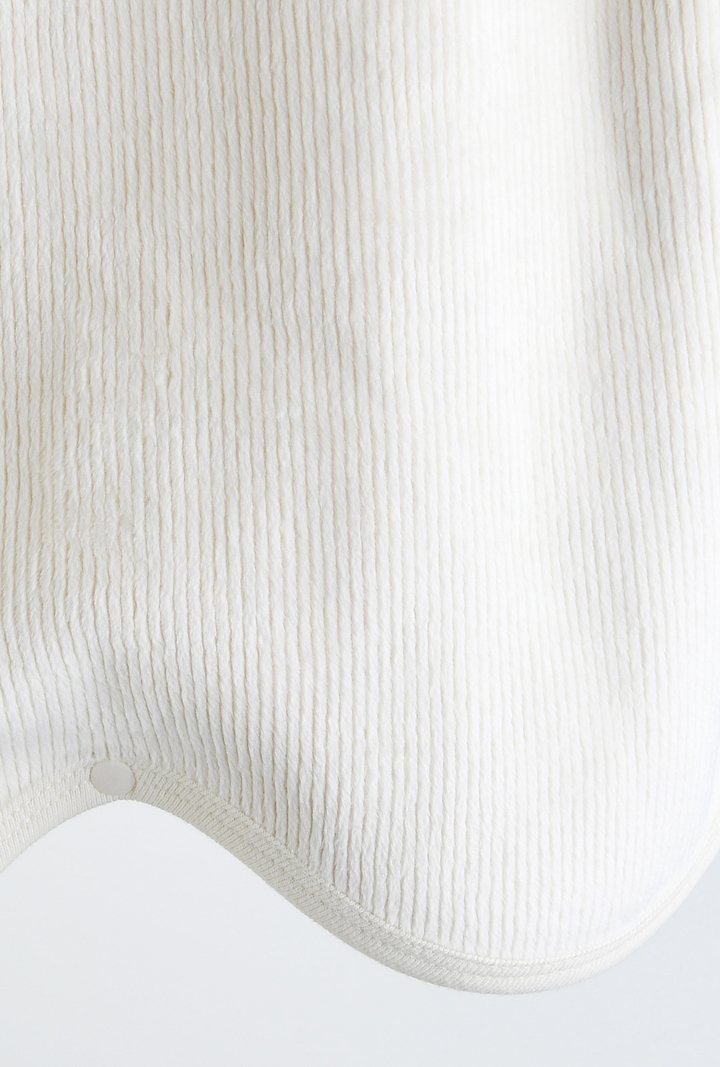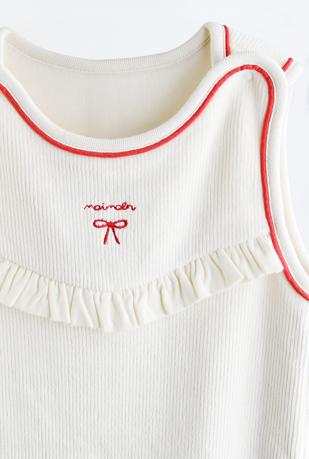 보온성이 좋은 골 벨로아 소재로 수면시 아이의 체온을 따뜻하게 유지시켜주는 아이템. 포근한 솔리드 크림 컬러에 레드 삥 포인트를 주고 가슴에 리본 모티브 자수로 러블리함을 더한 수면조끼