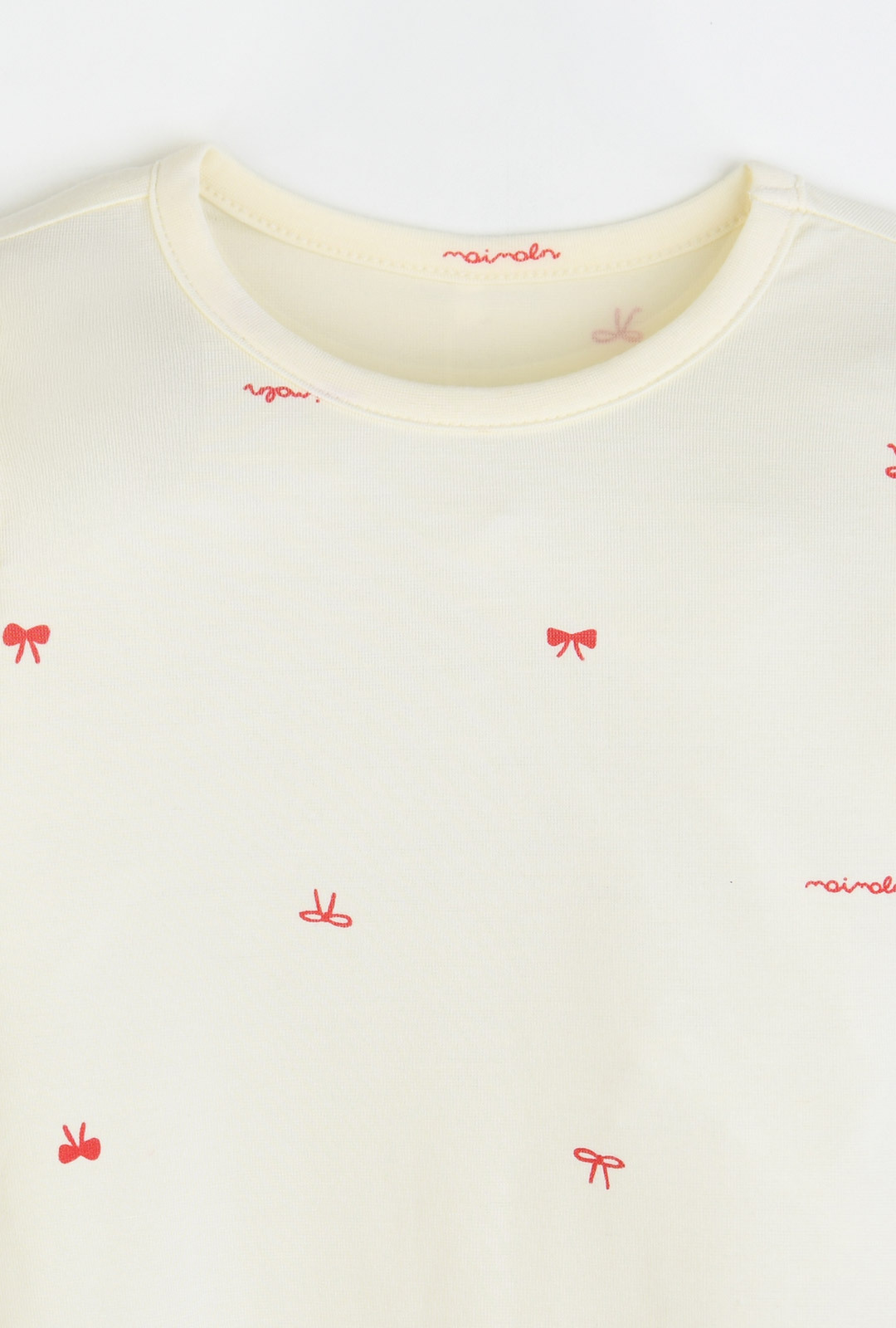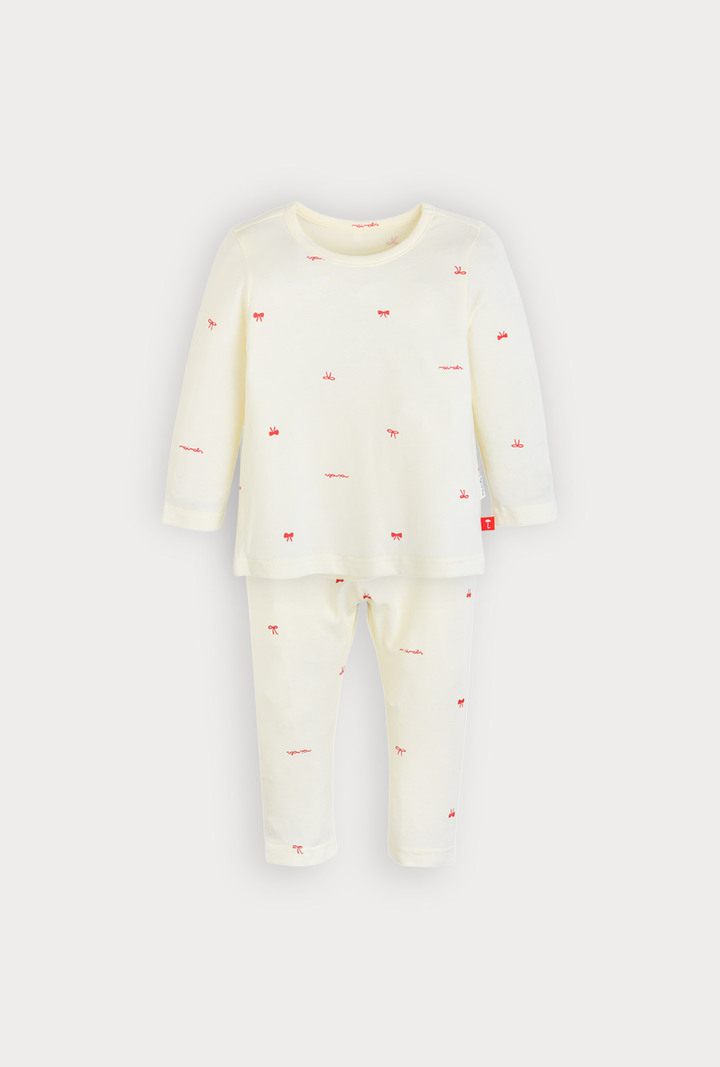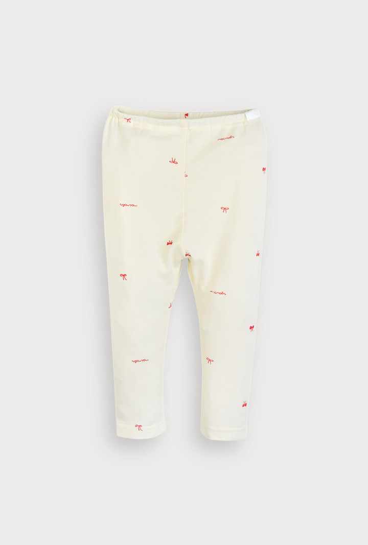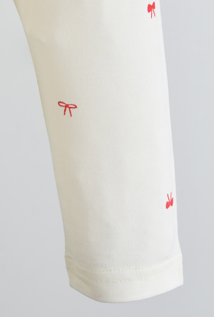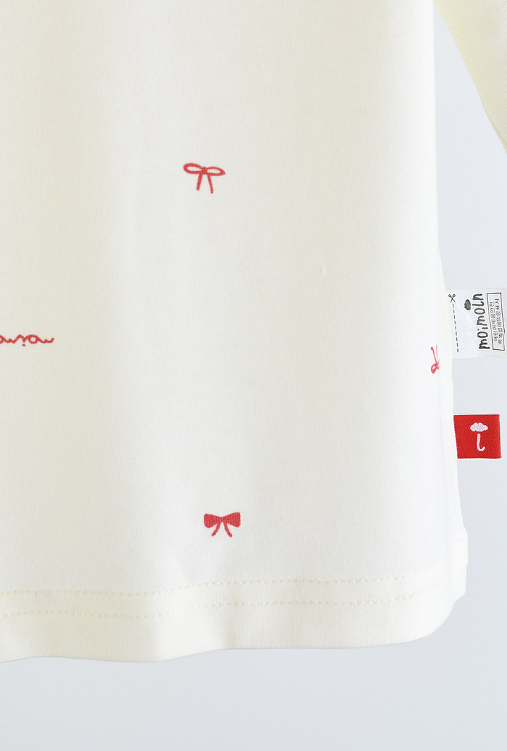 스판기가 있어 활동성이 편안하며, 따뜻한 느낌을 주는 발열 소재로 러블리한 무드의 리본 전판 나염이사랑스러운 실내상하