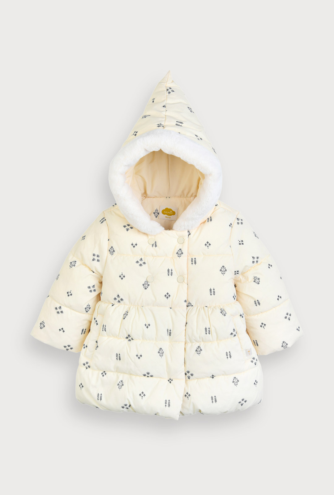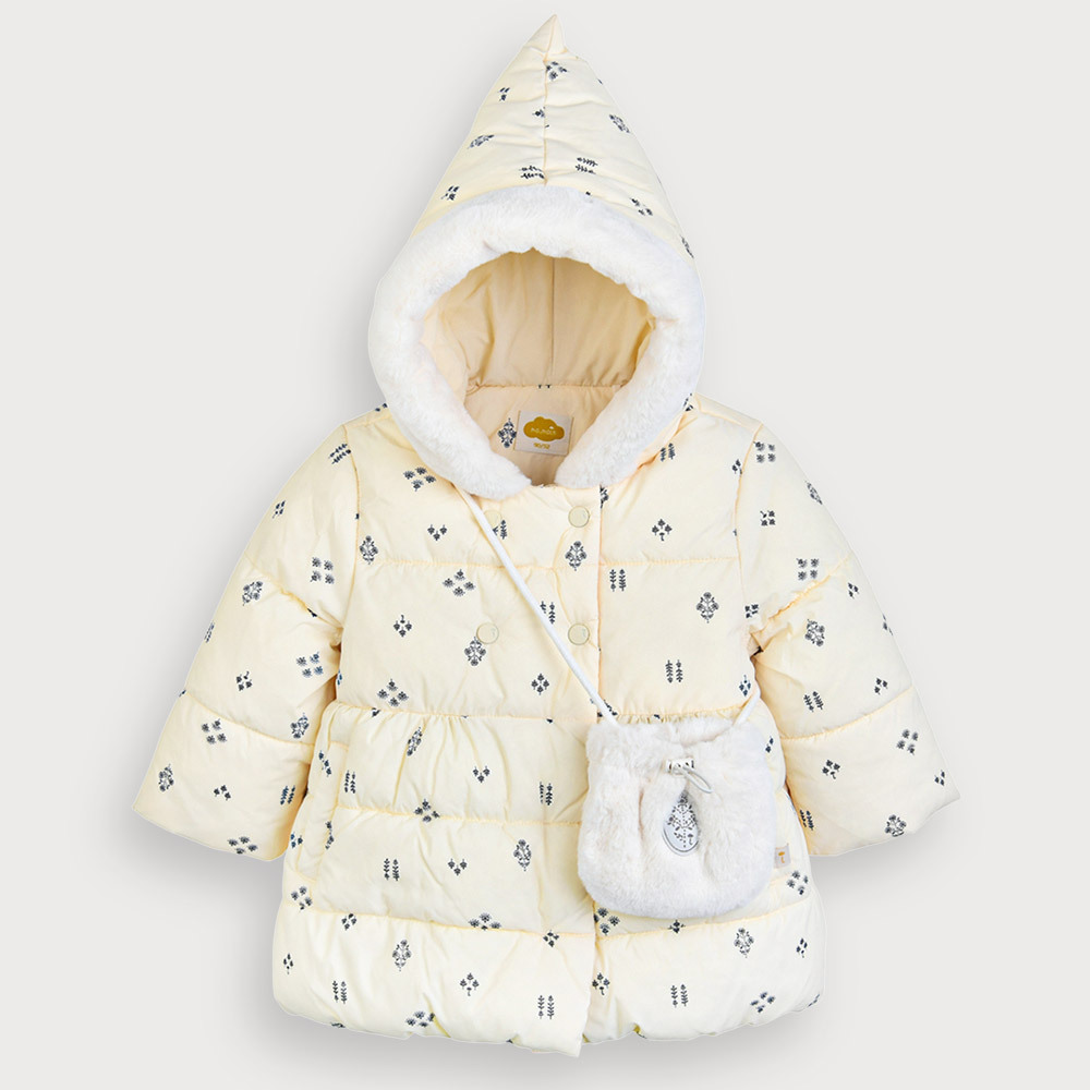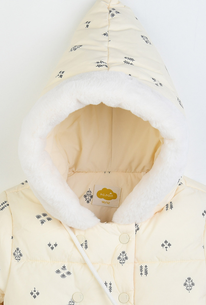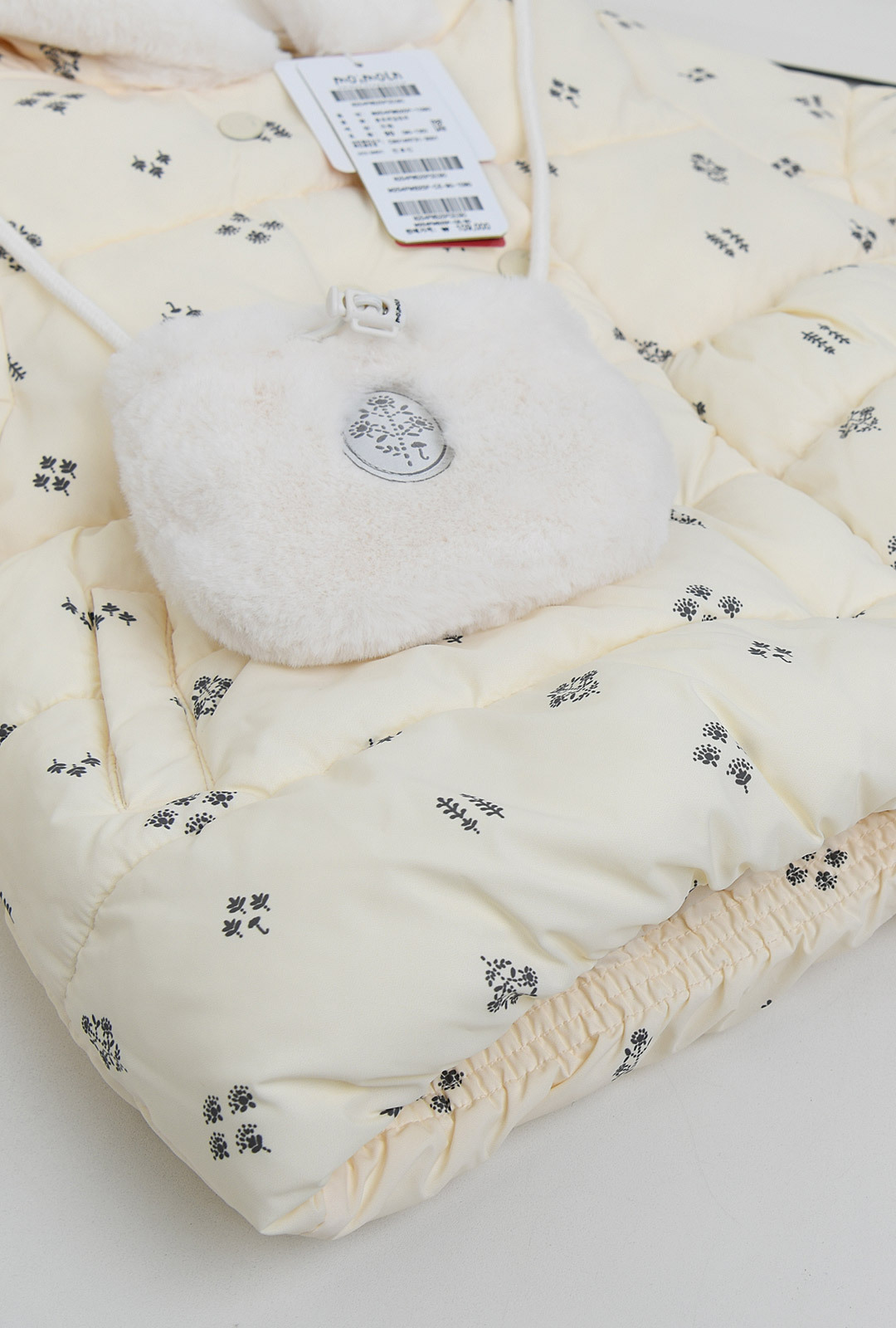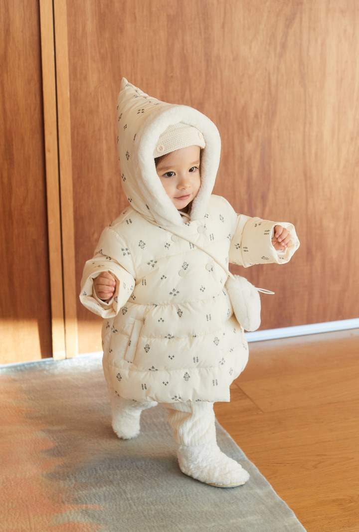 퍼 가방이 세트로 구성된 클래식한 패턴의 롱기장 다운 점퍼. A라인 실루엣에 절개와 셔링으로 볼륨감을 더해 귀여운 핏을 연출할 수 있으며, 소로나 볼패딩을 사용해 가볍고 보온성이 좋은 아이템