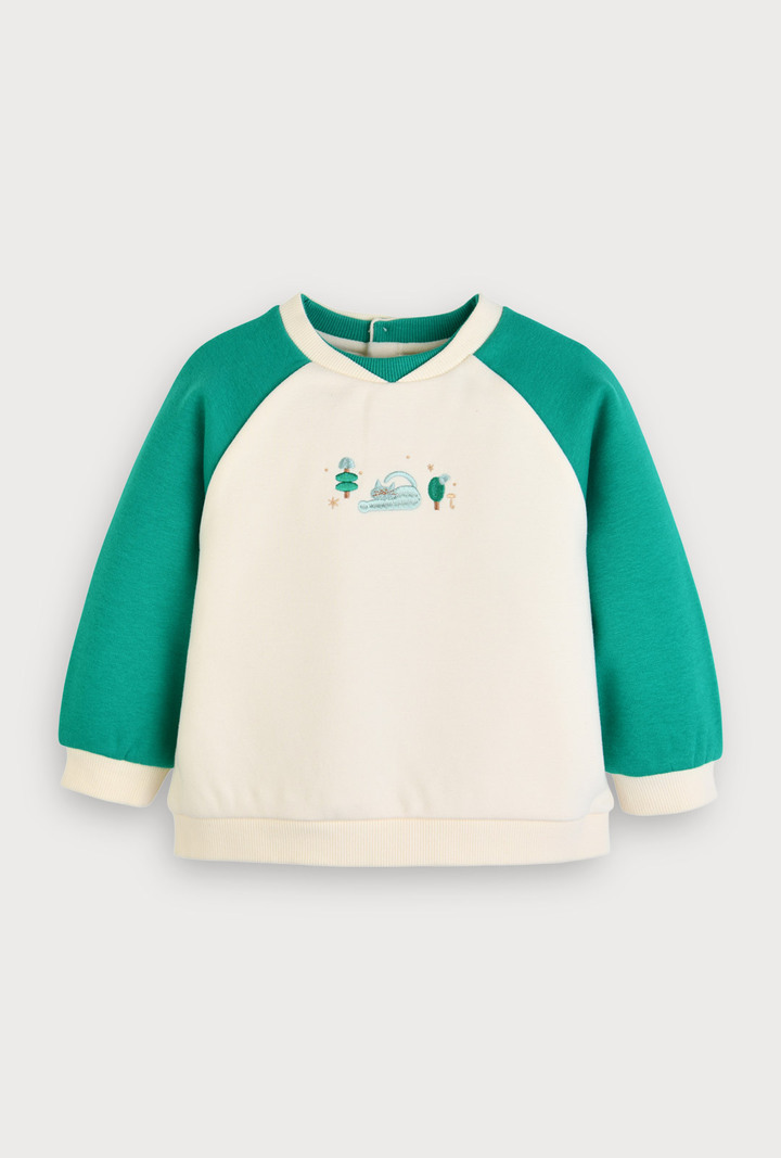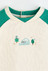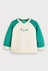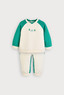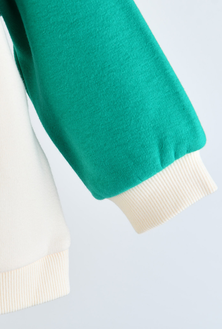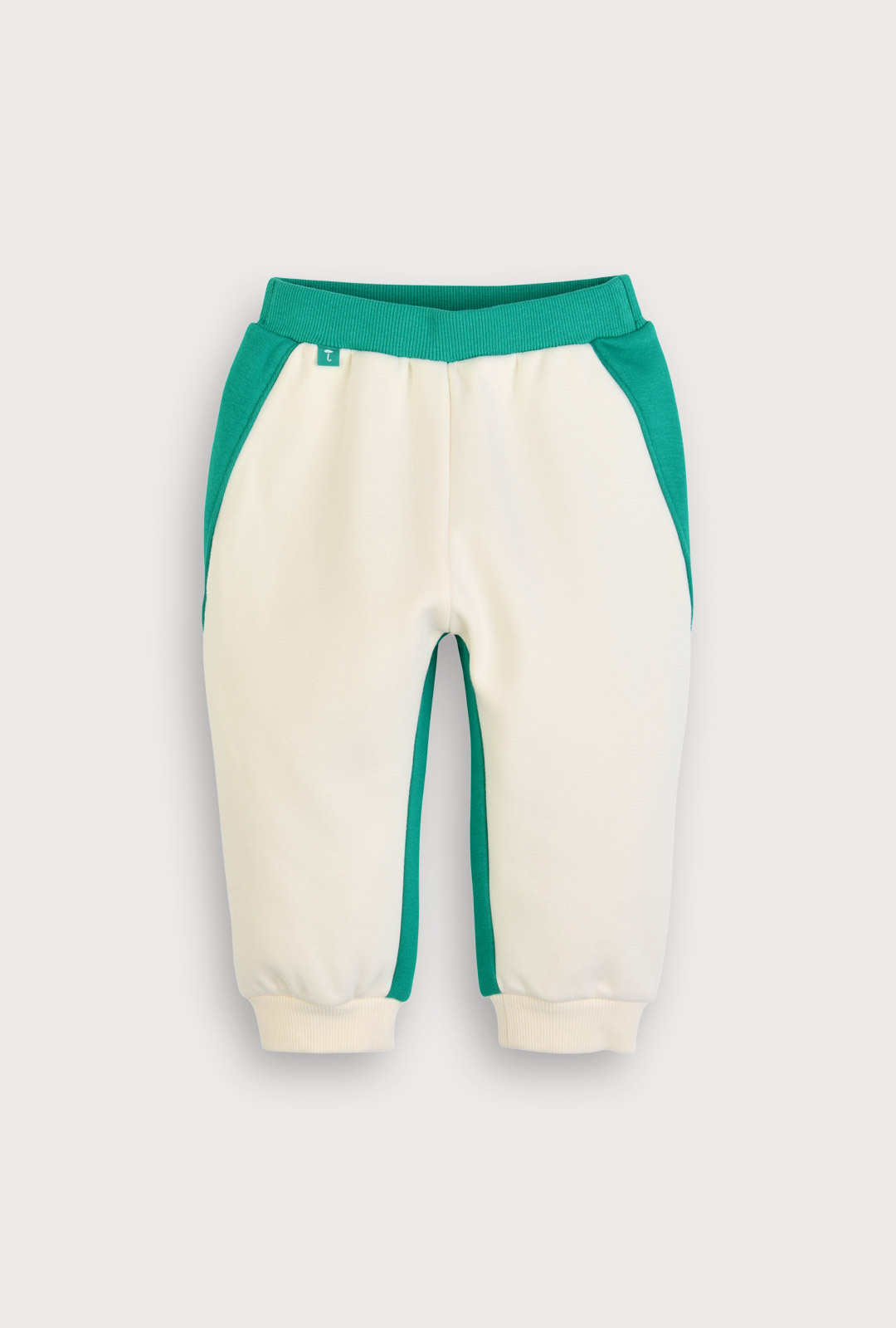 뽀얀 아이보리 컬러에 쨍한 민트 컬러를 배색으로 주어 무난하면서도 돋보이는 느낌을 주는 깨끗하고 유니크한 상하복. 네크 립단을 이중으로 주고바지 앞뒤 배색을 준 점이다른 옷들과 달라보이게 유니크한 느낌을 주고, 가슴 중심에 은은한 컬러로 놓은 고양이 자수가 귀여운 포인트인 아이템