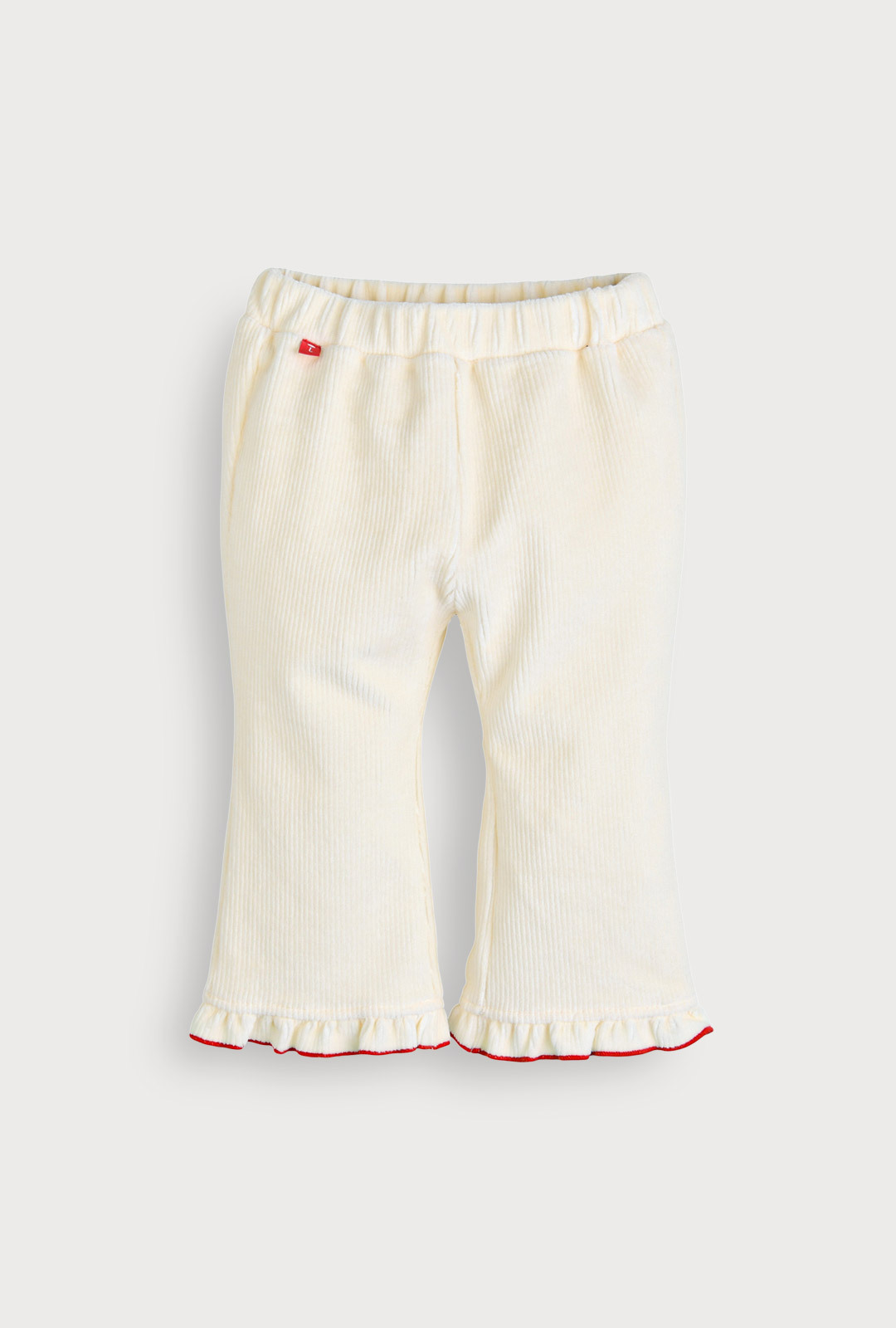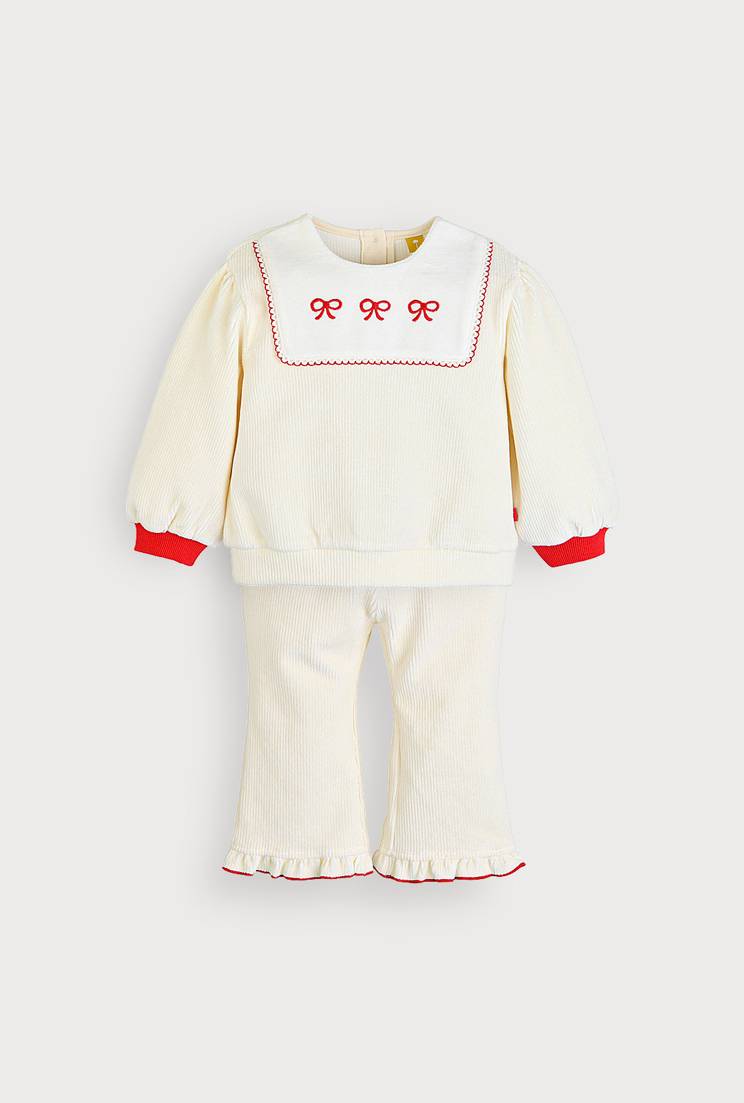 따뜻하고 포근한 골벨로아 소재의 상하복으로 앞 요크에 레드 자수와 스칼럽 자수로 깜찍하게 포인트를 준 디자인.