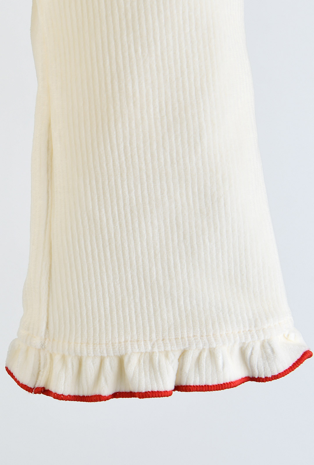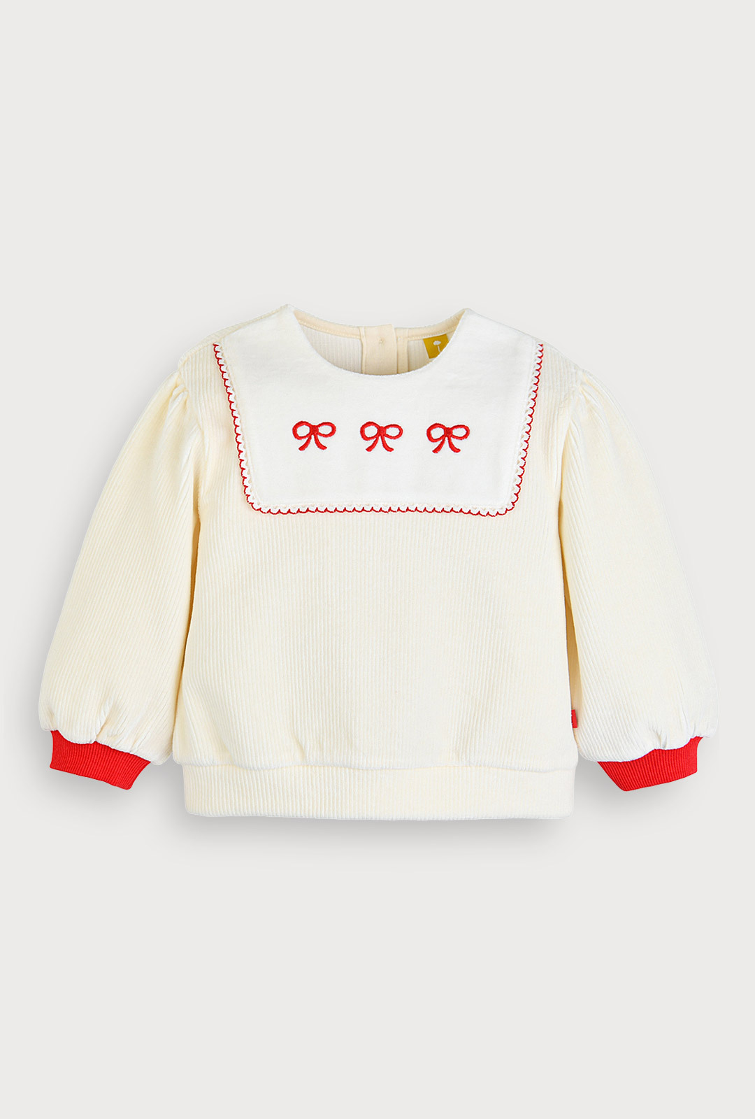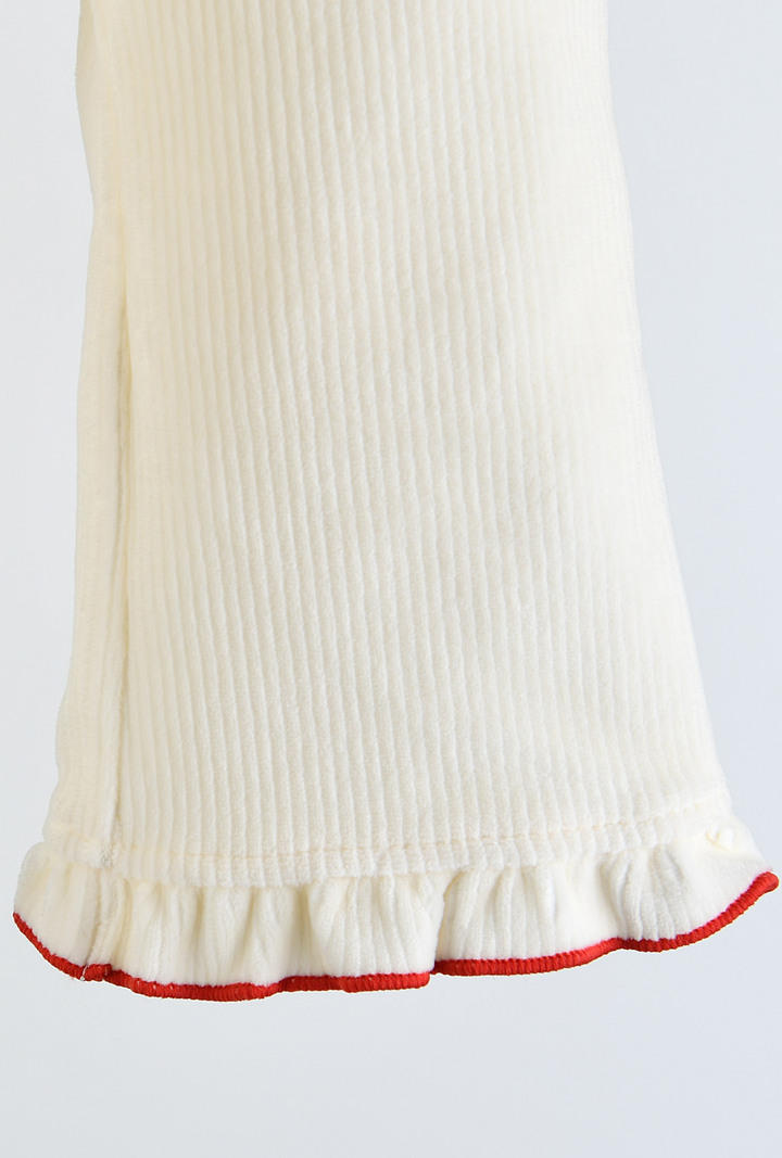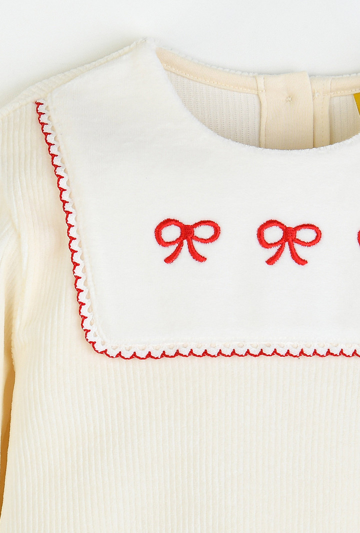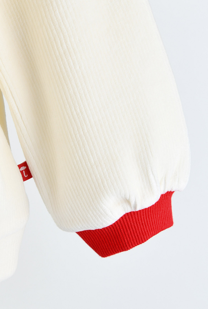 따뜻한 아이보리 벨로아에 리본 자수나 레이스, 소매단을 모두 레드 컬러로 포인트를 주어 크리스마스에도 우리 아이를 돋보이게 해줄 아이템.