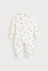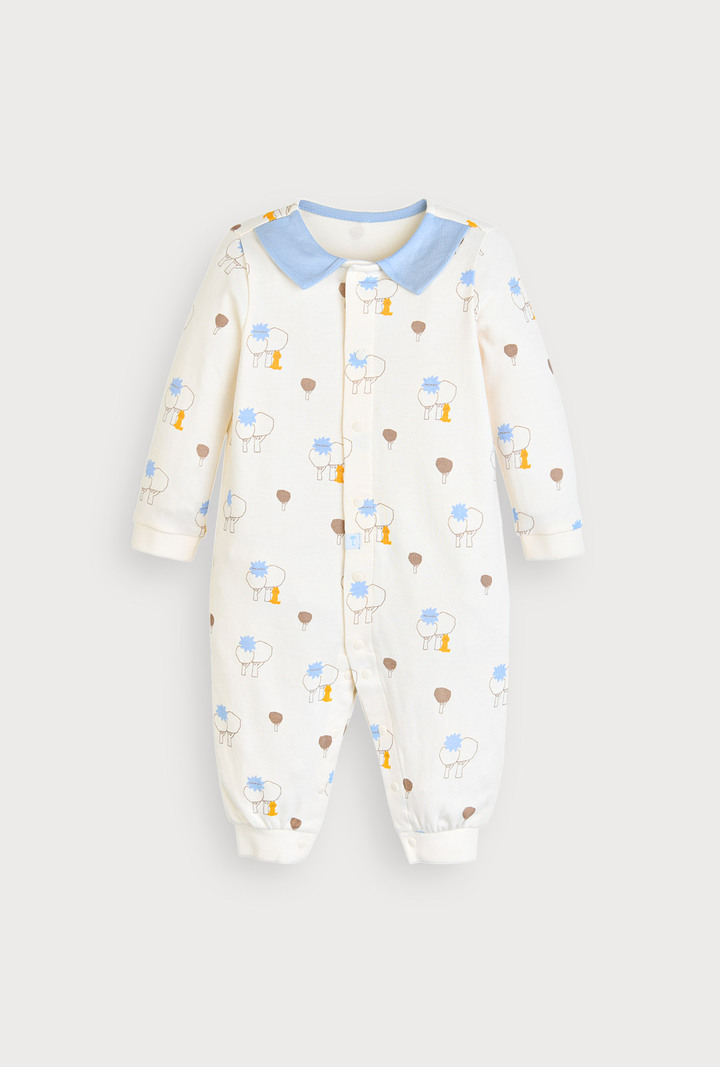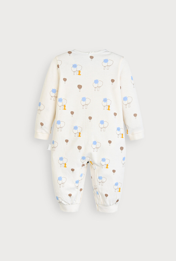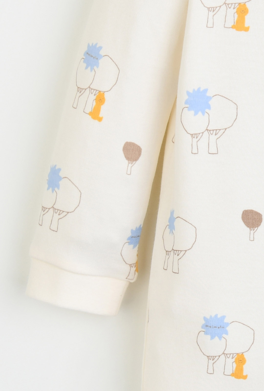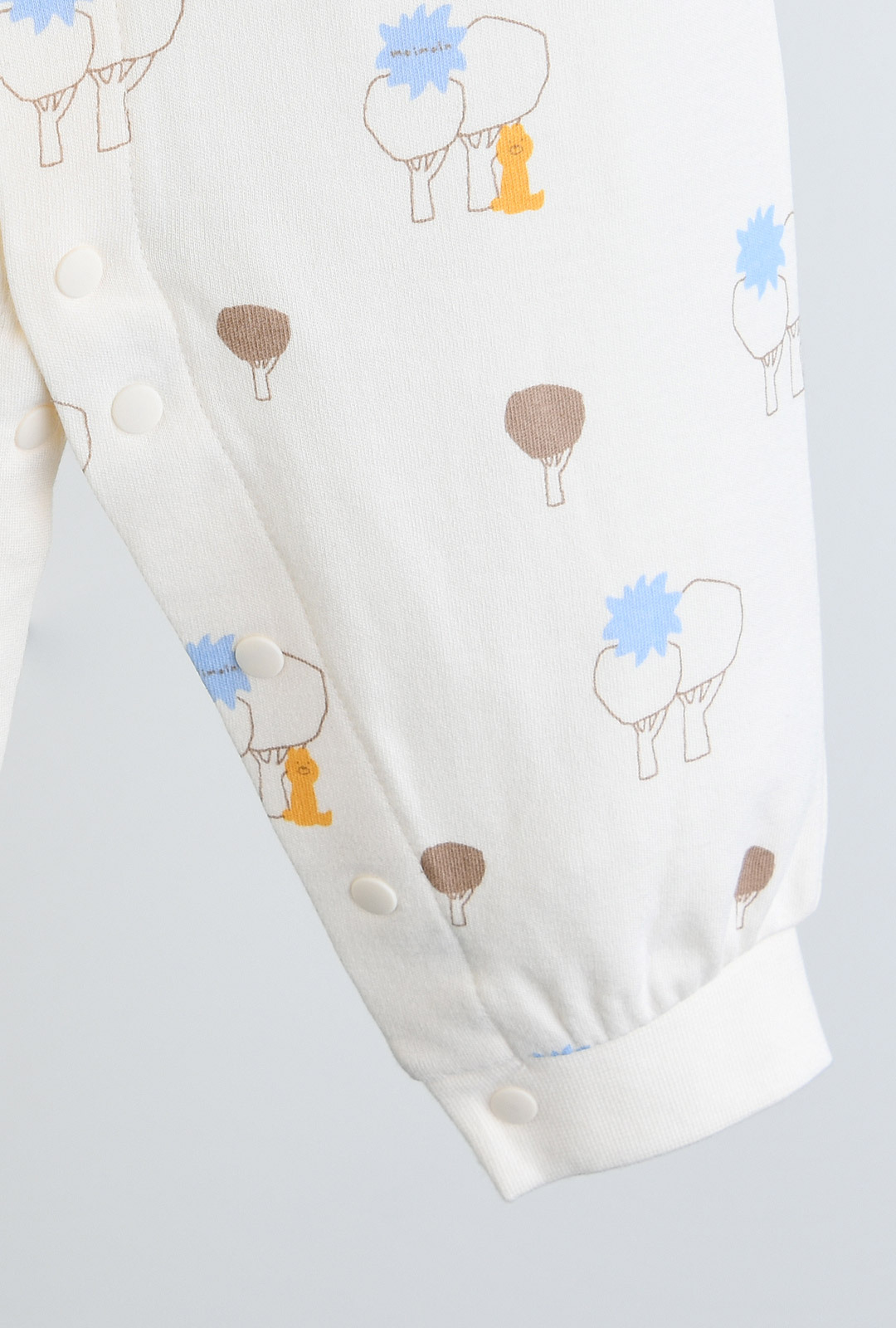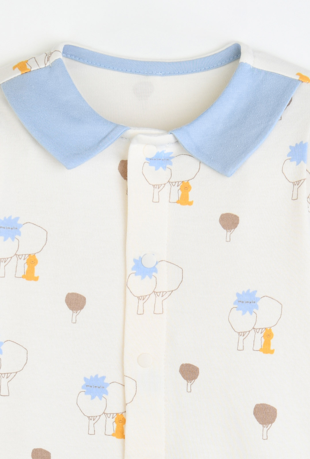 곰과 나무 모티브의 전판 나염이 더해져 귀엽고 따뜻한 분위기를 자아내고, 블루 컬러의 카라로 포인트를 준 우주복