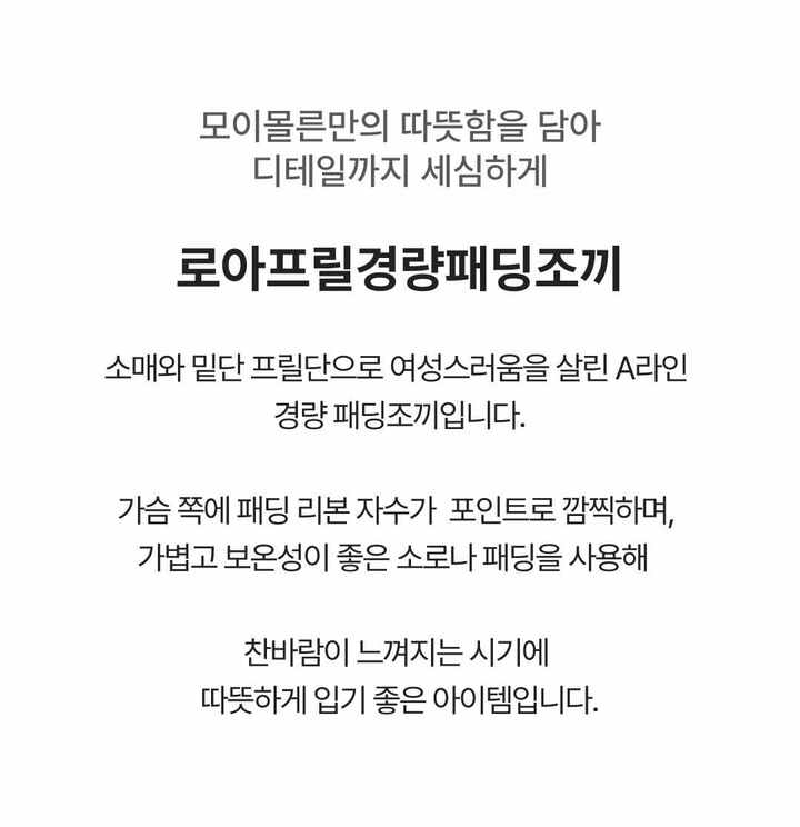| 상품명 | [모이몰른] 로아프릴경량패딩조끼 [겨울] |