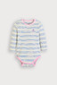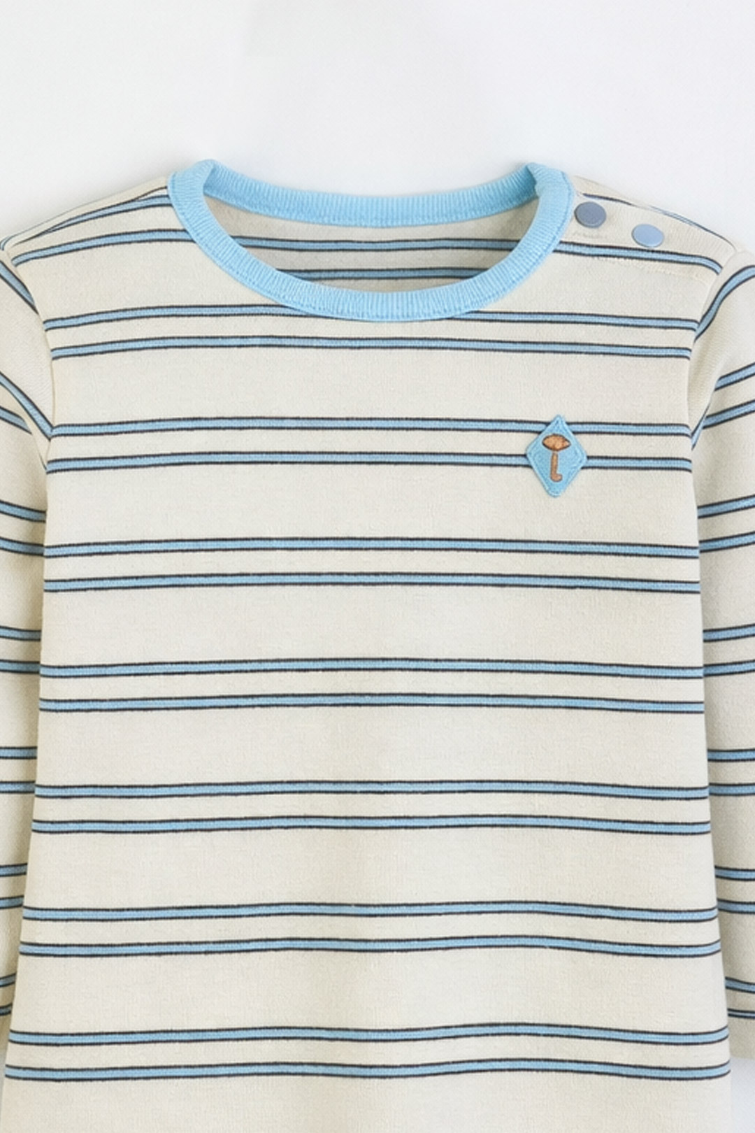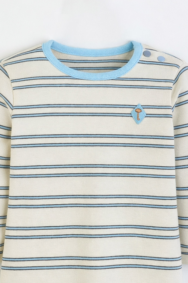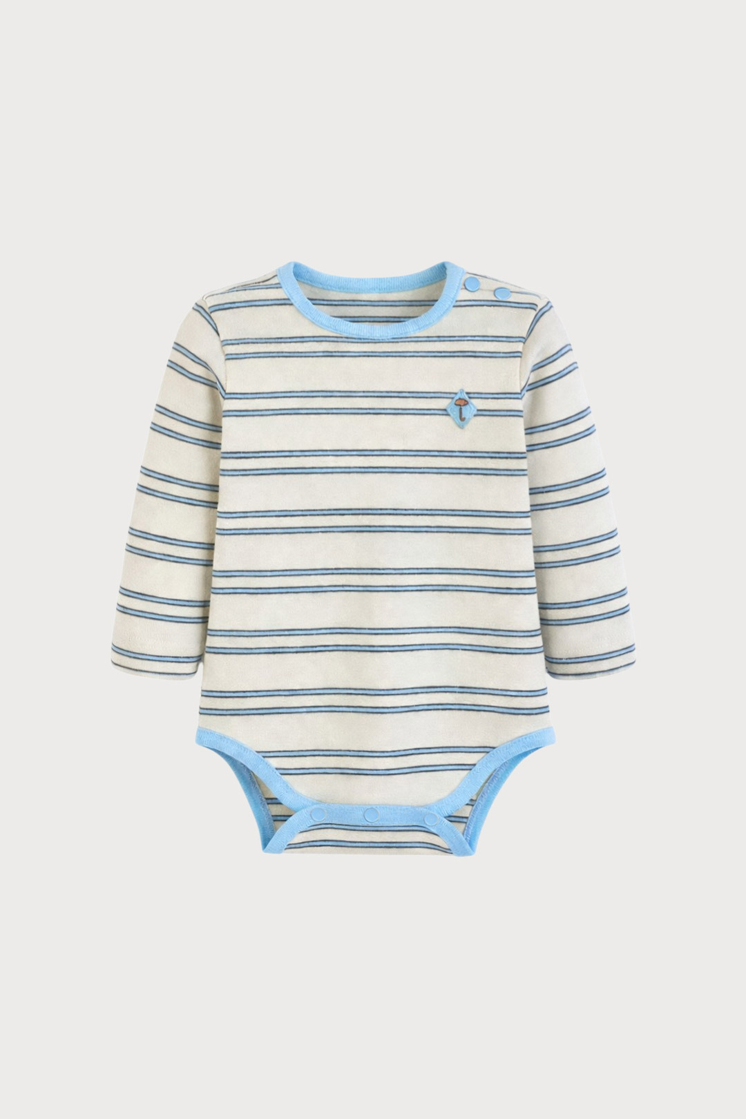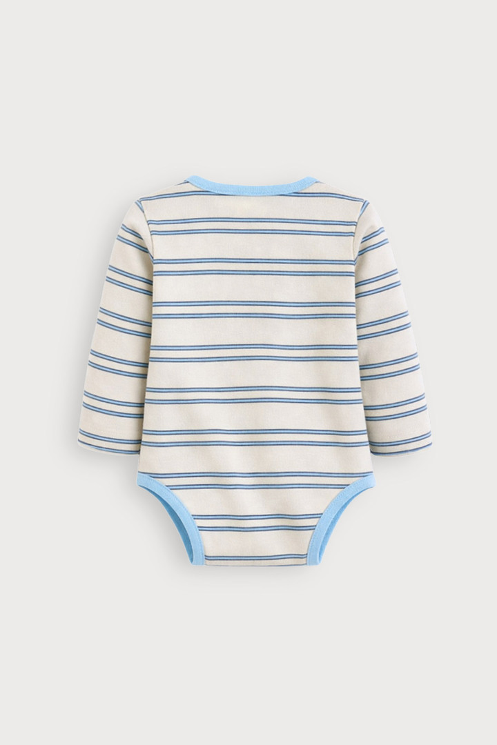 움직임이 많은 아이에게도 자연스럽게밀착되어 활동이 자유롭고,따뜻하게 입을 수 있는멀티 스트라이프 바디수트