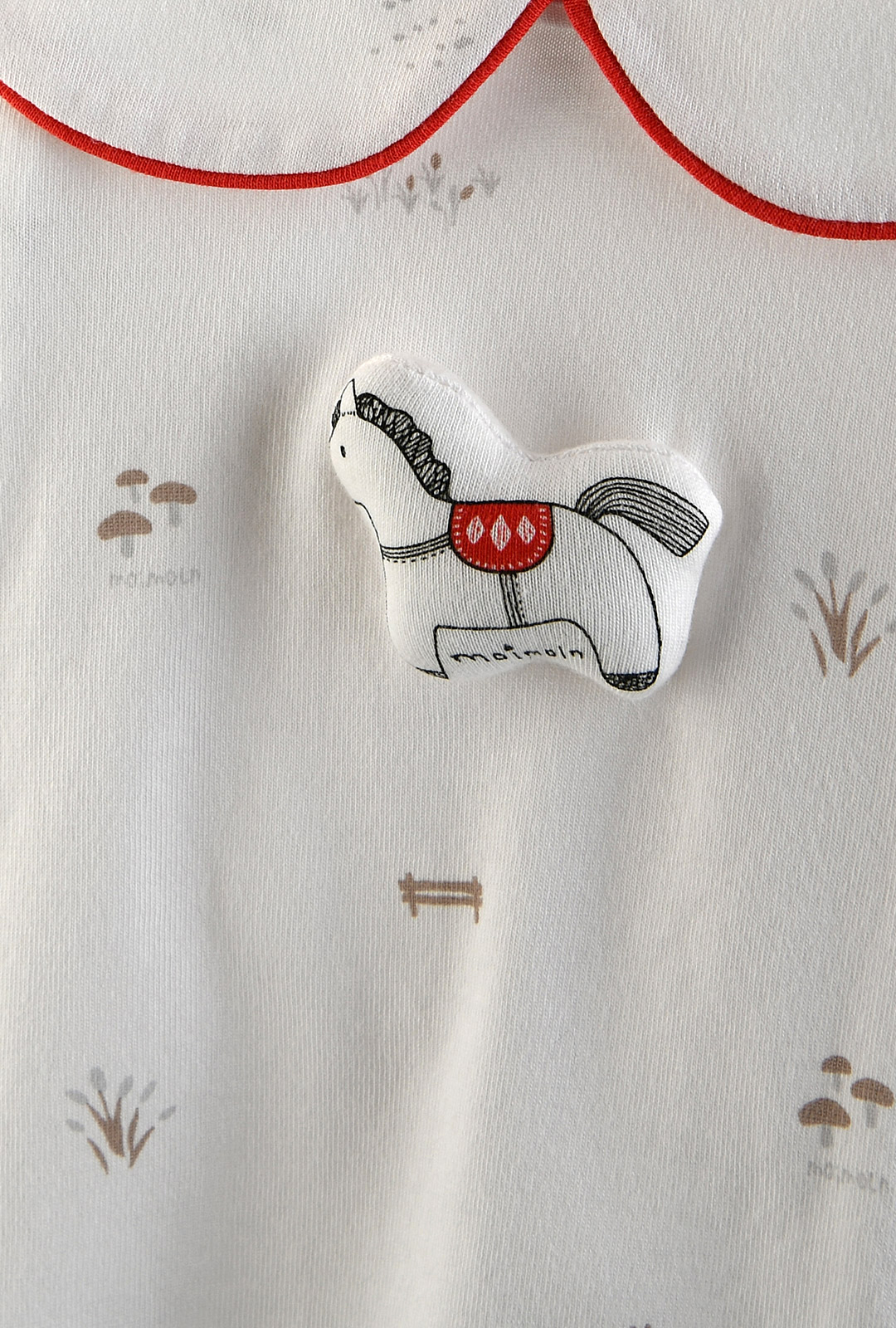 농장 모티브 나염과 레드 파이핑 포인트가 돋보이는 베이비용 밤부 소재 바디수트 모자 세트