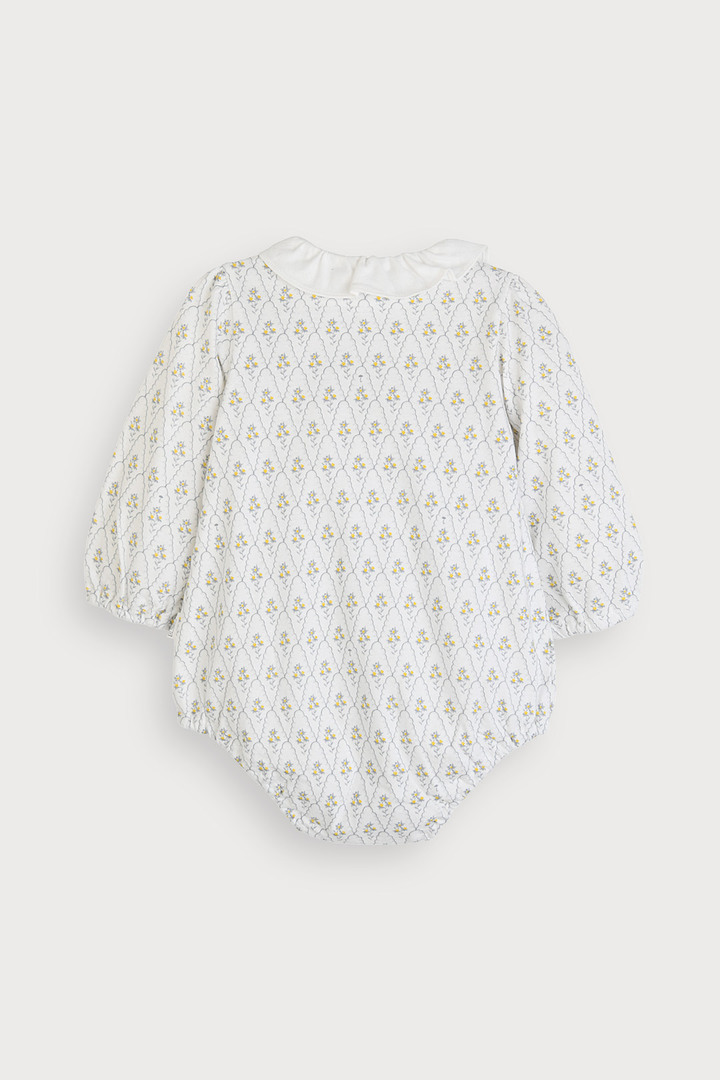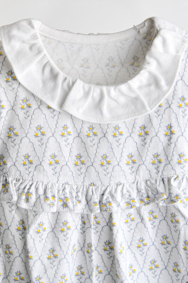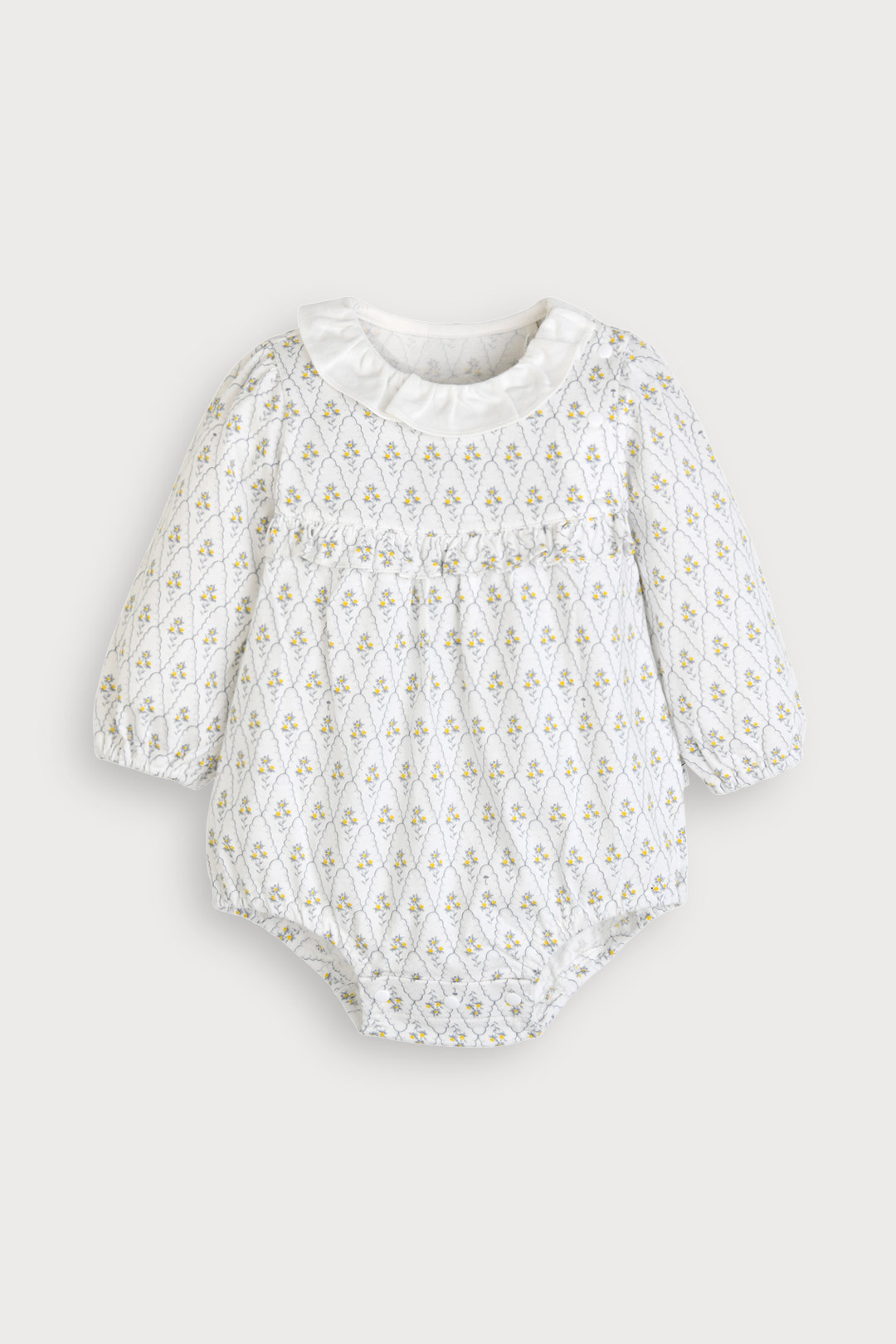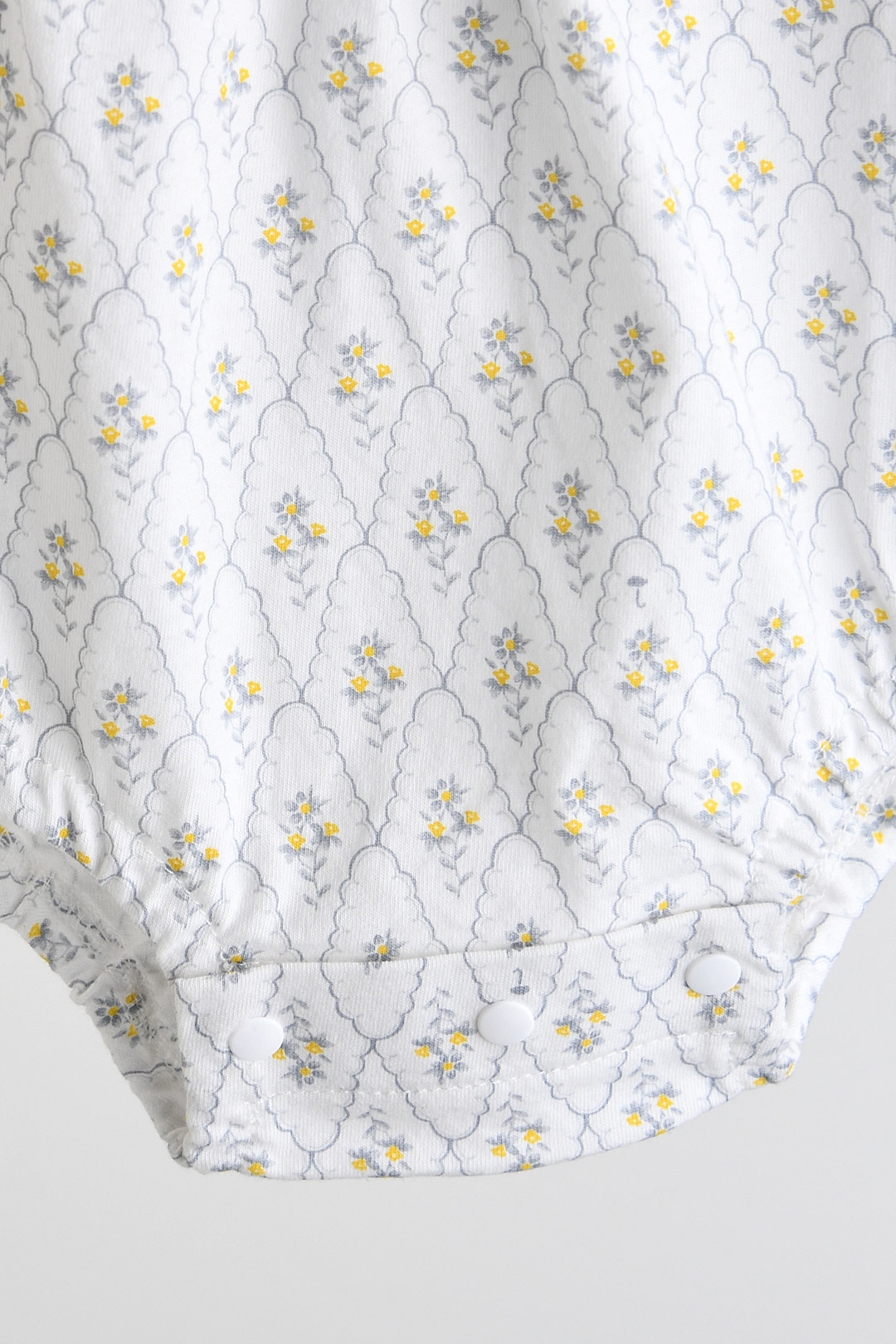 Q1. 어떤 연령대 아이가 입기 좋은가요 A1. 70호부터 90호까지 구성되어 베이비 연령대 아이들이 입기 좋습니다. Q2. 소재는 아이 피부에 괜찮은가요 A2. 부드러운 30수 싱글 면 100% 소재로 아이 피부에 자극 없이 편안합니다. Q3. 디자인 포인트는 무엇인가요 A3. 분위기 있는 그레이 플라워 패턴에 어깨 프릴로 사랑스러움을 더했습니다. Q4. 입히기 편한 디자인인가요 A4. 네, 어깨 부분에 트임(암홀타)이 있어 머리를 넣고 빼기 수월합니다. Q5. 세탁은 어떻게 해야 하나요 A5. 제품의 형태 유지를 위해 손세탁을 권장합니다.