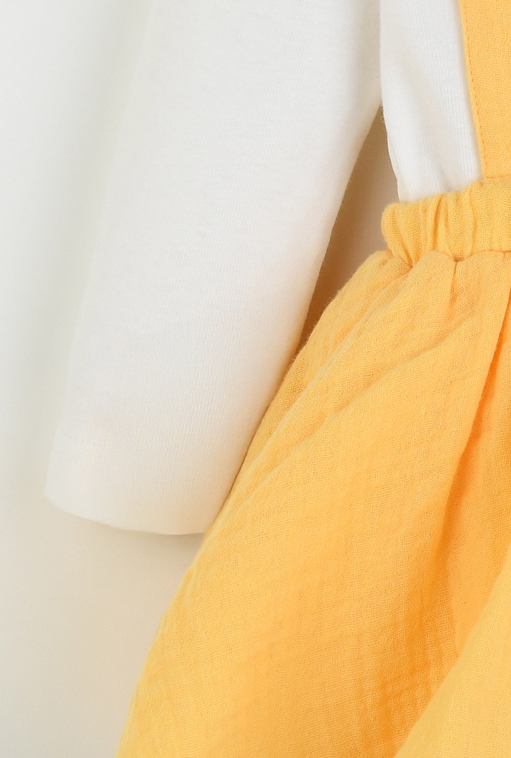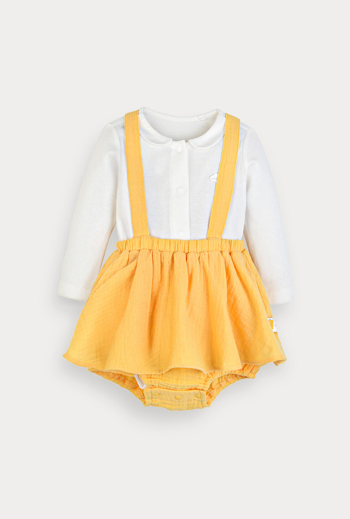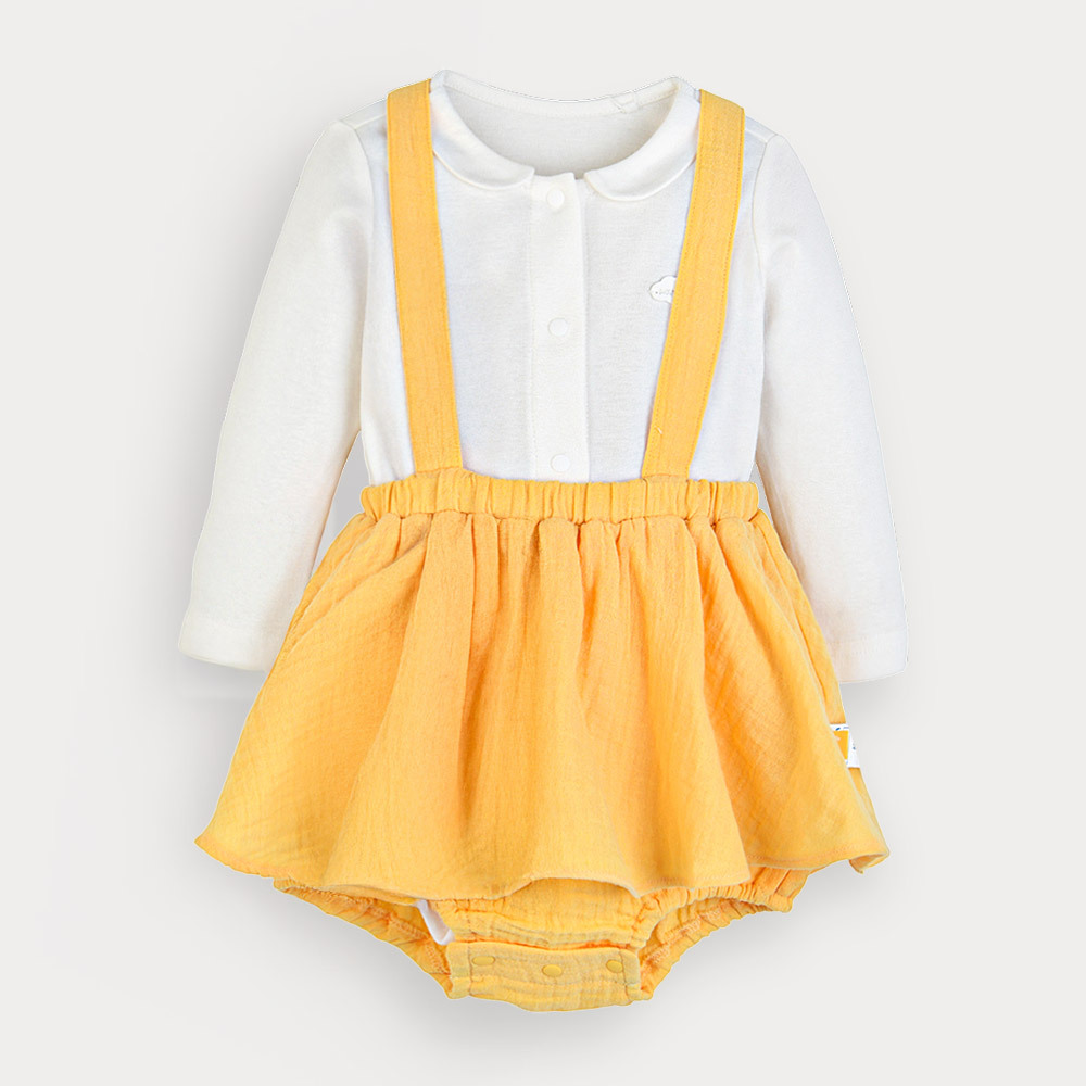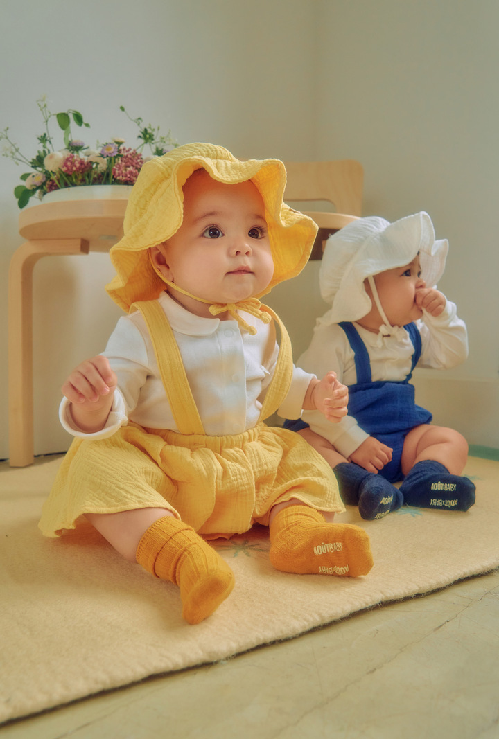 산뜻한 옐로우 컬러의 바디수트와 올오버 세트로 실용성을 더한 베이비 아이템