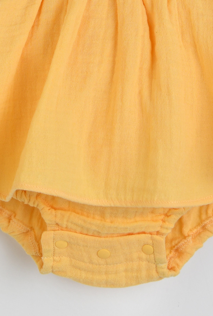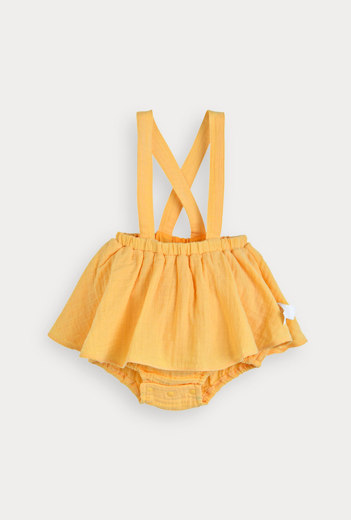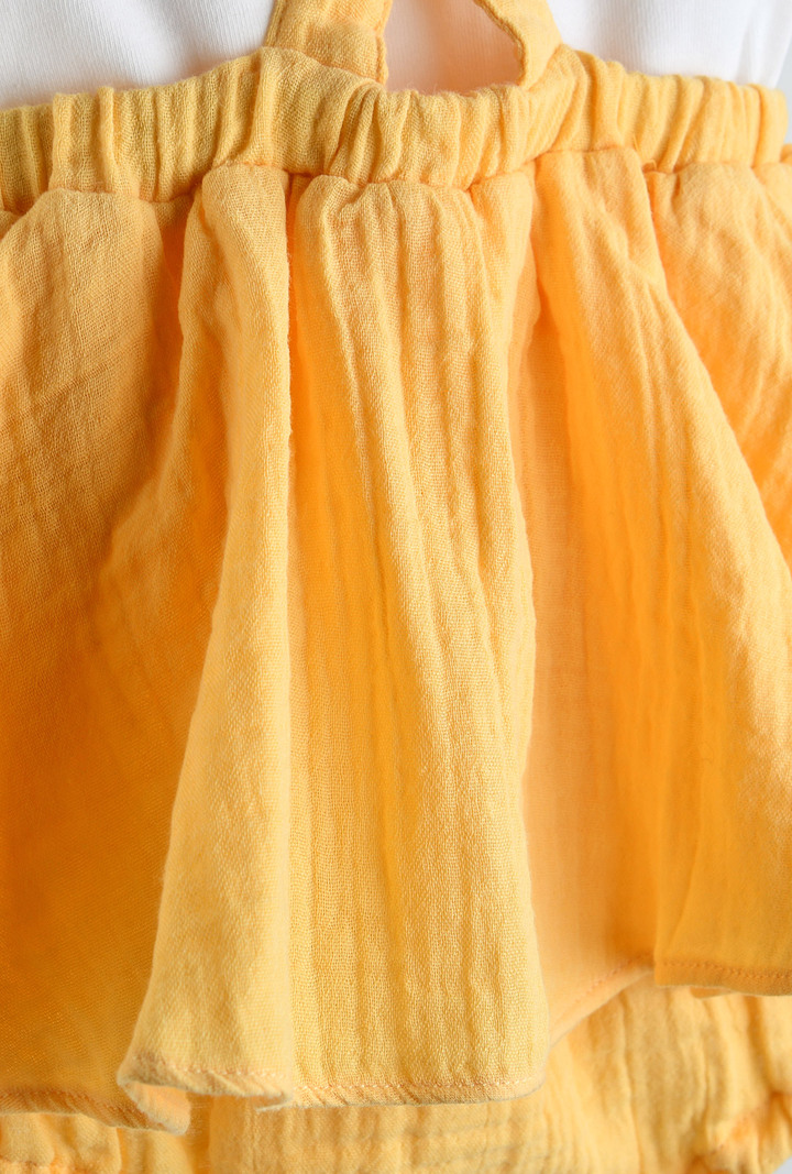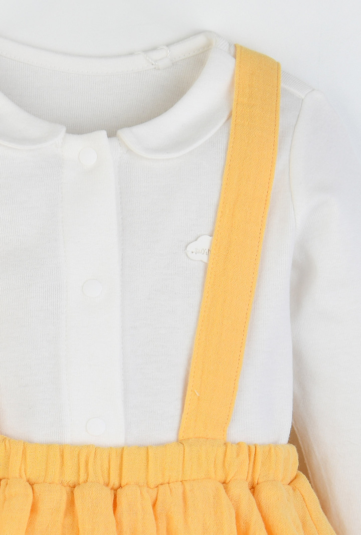 산뜻한 옐로우 컬러의 바디수트와 올오버 세트로 실용성을 더한 베이비 아이템