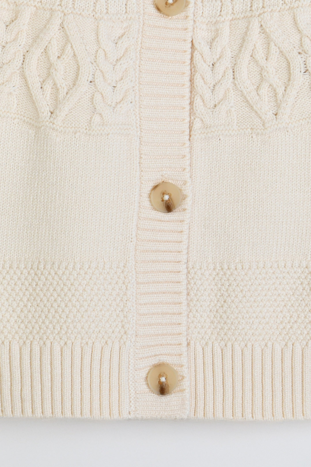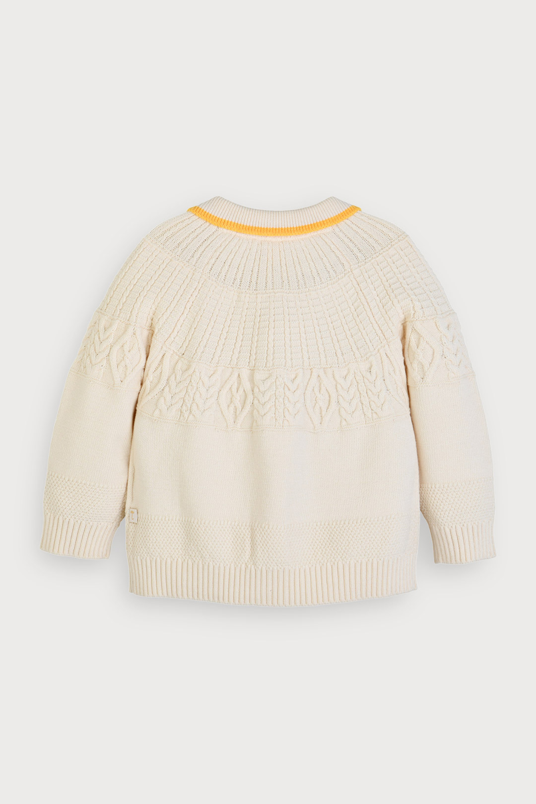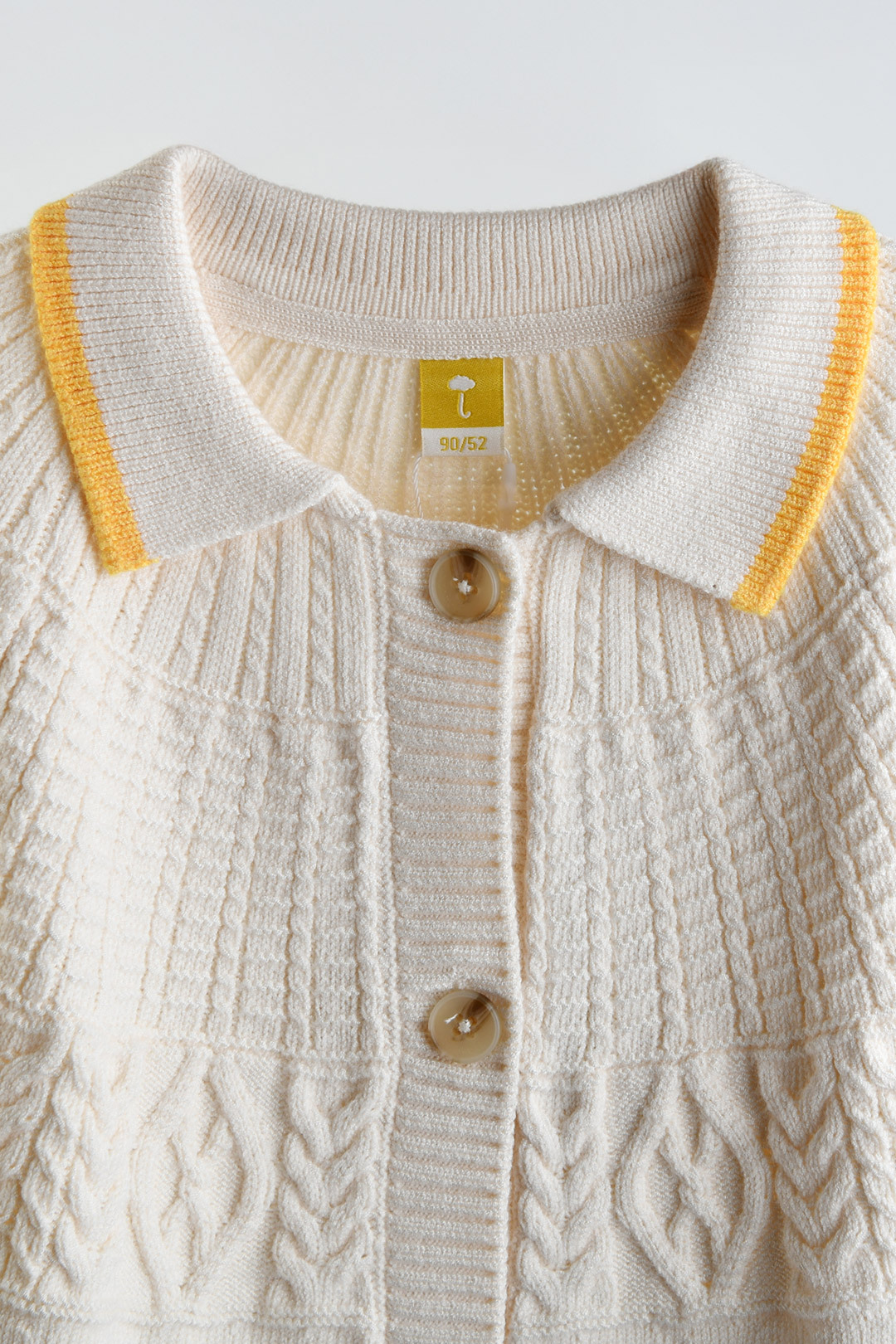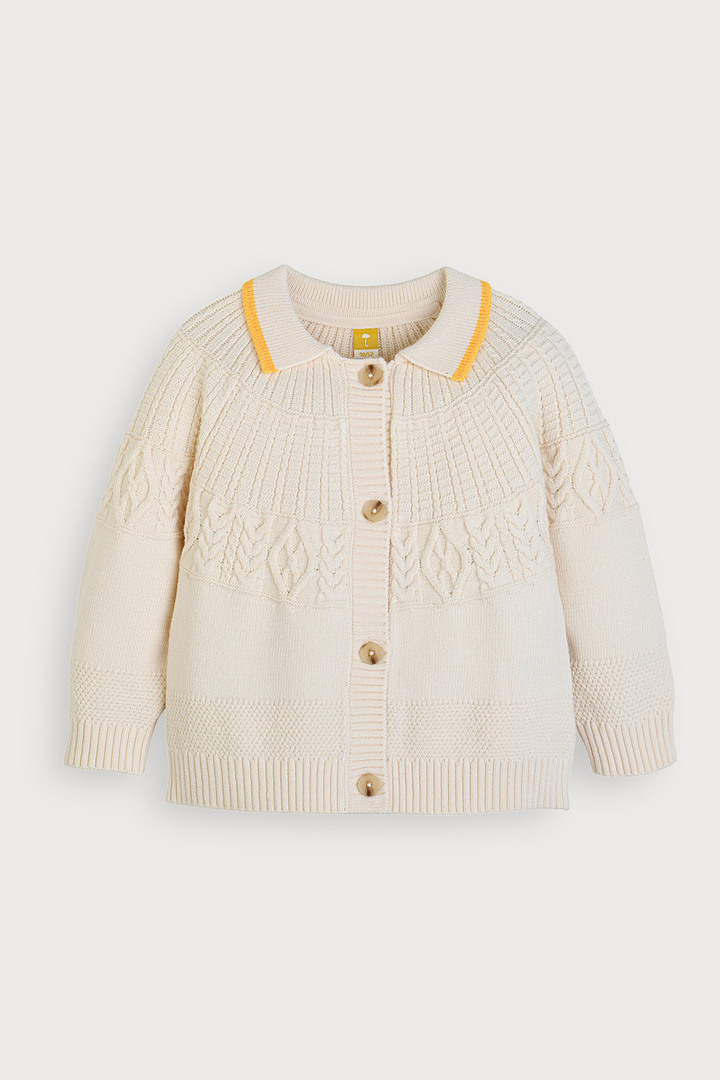 유니크한 조직감과 카라 끝 옐로우 포인트로 세련된 분위기를 주는 베이비·토들러용 가디건 상품 설명 입는 순간 일상이 달라지는 경험을 주는 유니크한 조직감의 니트 가디건 담백하지만 깊이 있는 스타일에 카라 끝 옐로우 컬러로 포인트 추가 오랫동안 사랑받는 이유가 있는 아이템이자 부드러운 촉감의 소프트 니트 웨어 디테일 설명 유니크한 조직감이 돋보이는 크림 컬러 솔리드 니트에 카라 끝 옐로우 배색 포인트 적용 부드럽고 소프트한 터치감으로 편안한 착용감 제공 사이즈별 단추 개수 차이 구성(90, 100호 4개 / 110, 120, 130호 5개) 울샴푸 사용 손세탁 권장 및 뉘어서 건조 필요 핏가이드 핏 보통 두께 보통 / 신축성 있음 / 비침 없음 90호부터 130호까지 폭넓은 구성으로 베이비부터 토들러까지 정사이즈 추천 소재 설명 겉감(레이온/폴리 혼용 7GG): 레이온 혼방의 소프트한 촉감과 적당한 신축성을 갖춘 7게이지 니트 소재