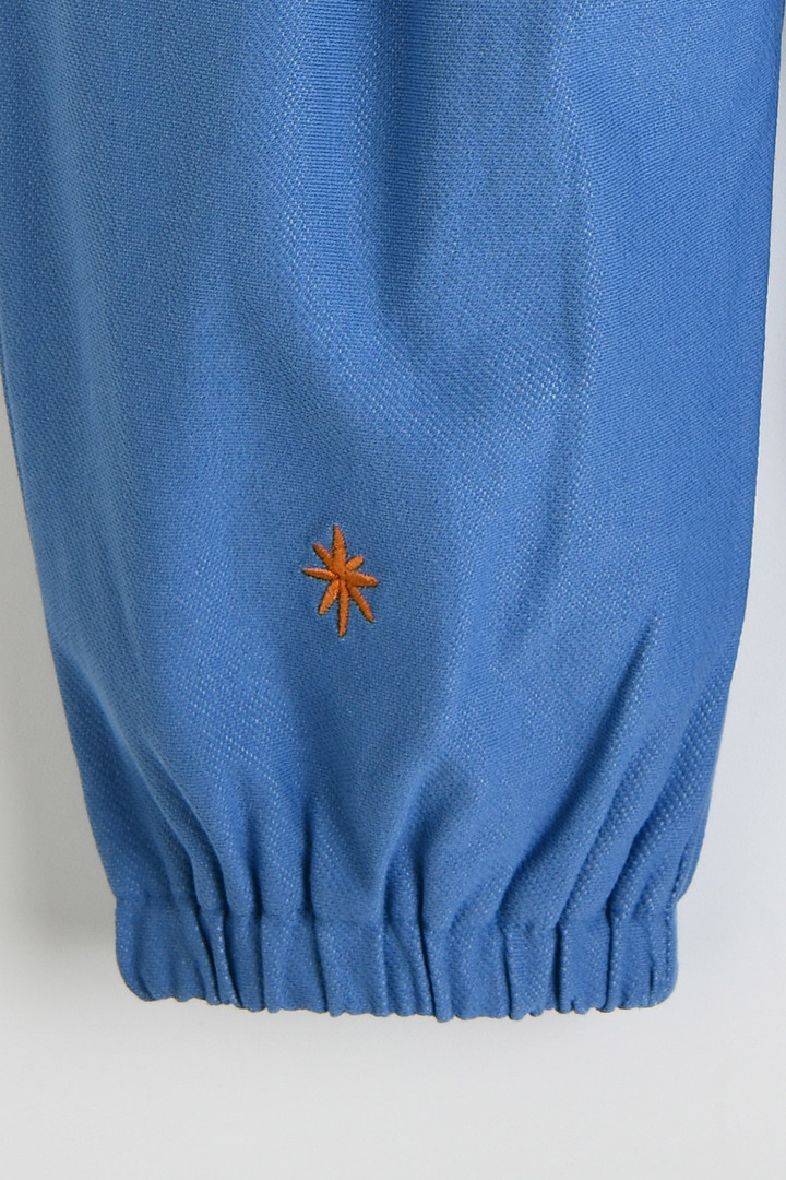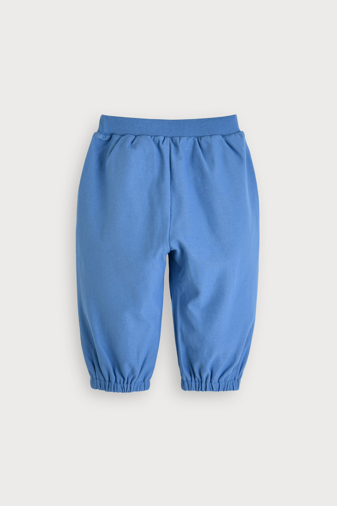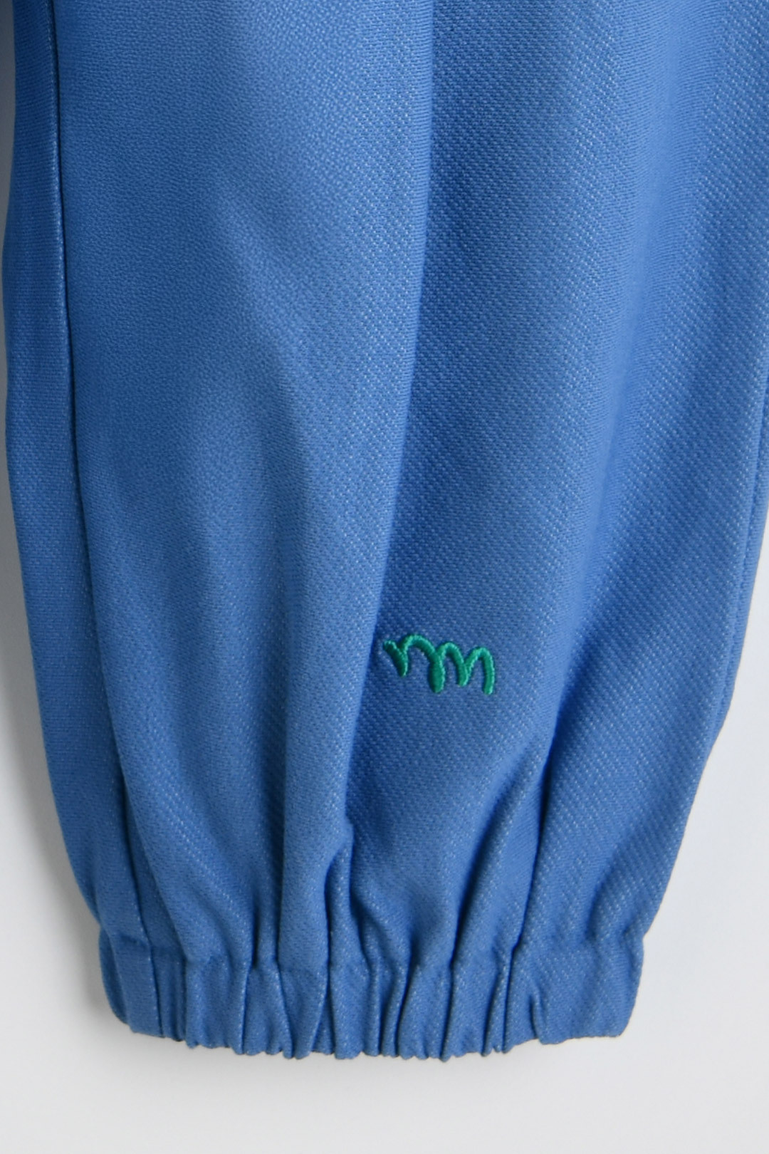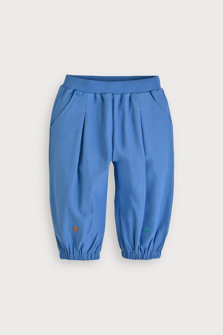 앞쪽 바지 하단에 좌우 컬러가 다른 작은 자수가 포인트인 디자인.