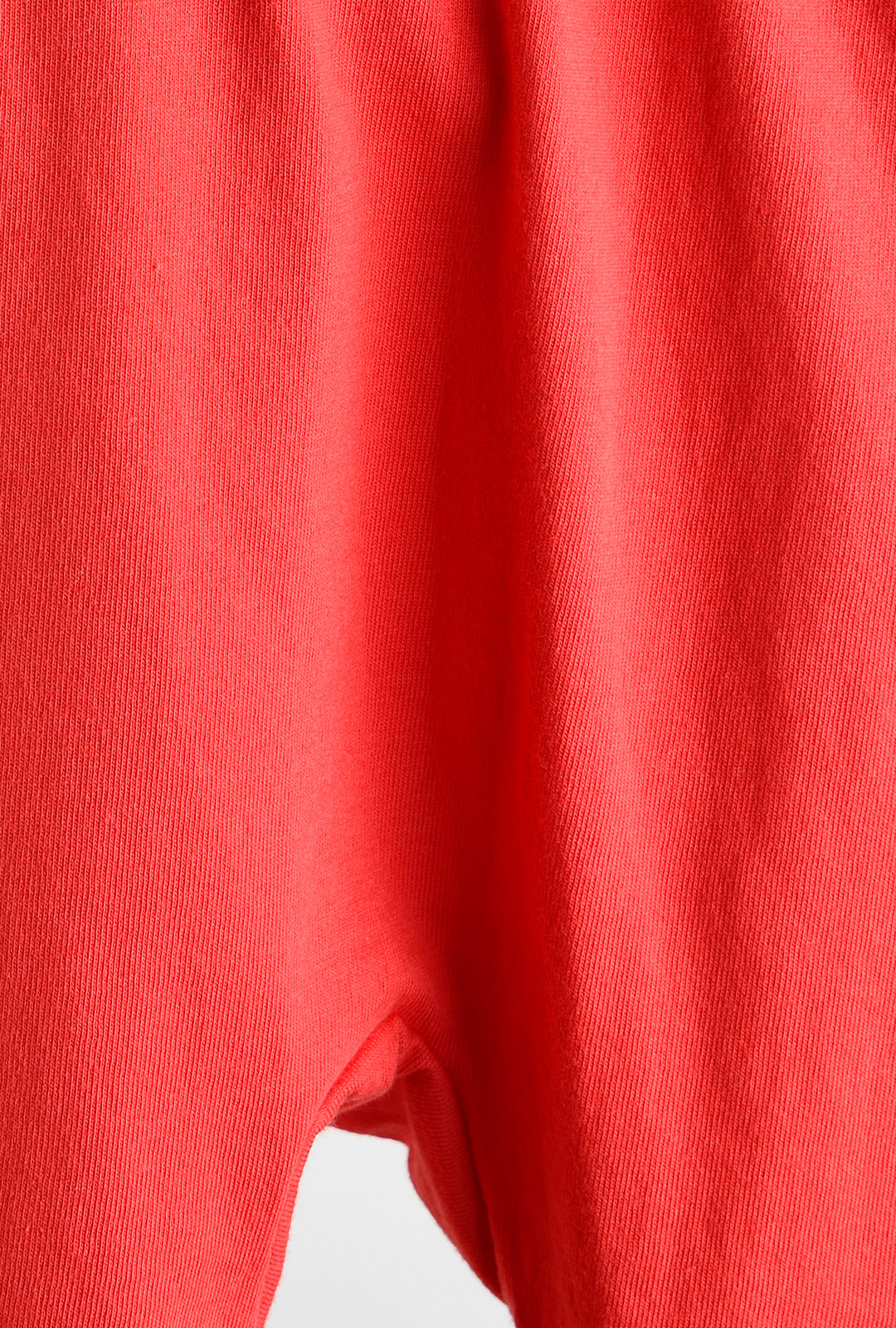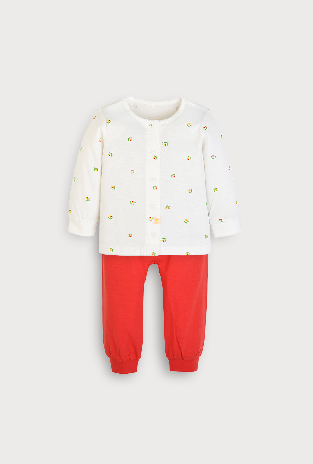 알록달록한 도형 플라워 모티브 상의와 레드 컬러 팬츠로 화사함을 더한 실내 상하