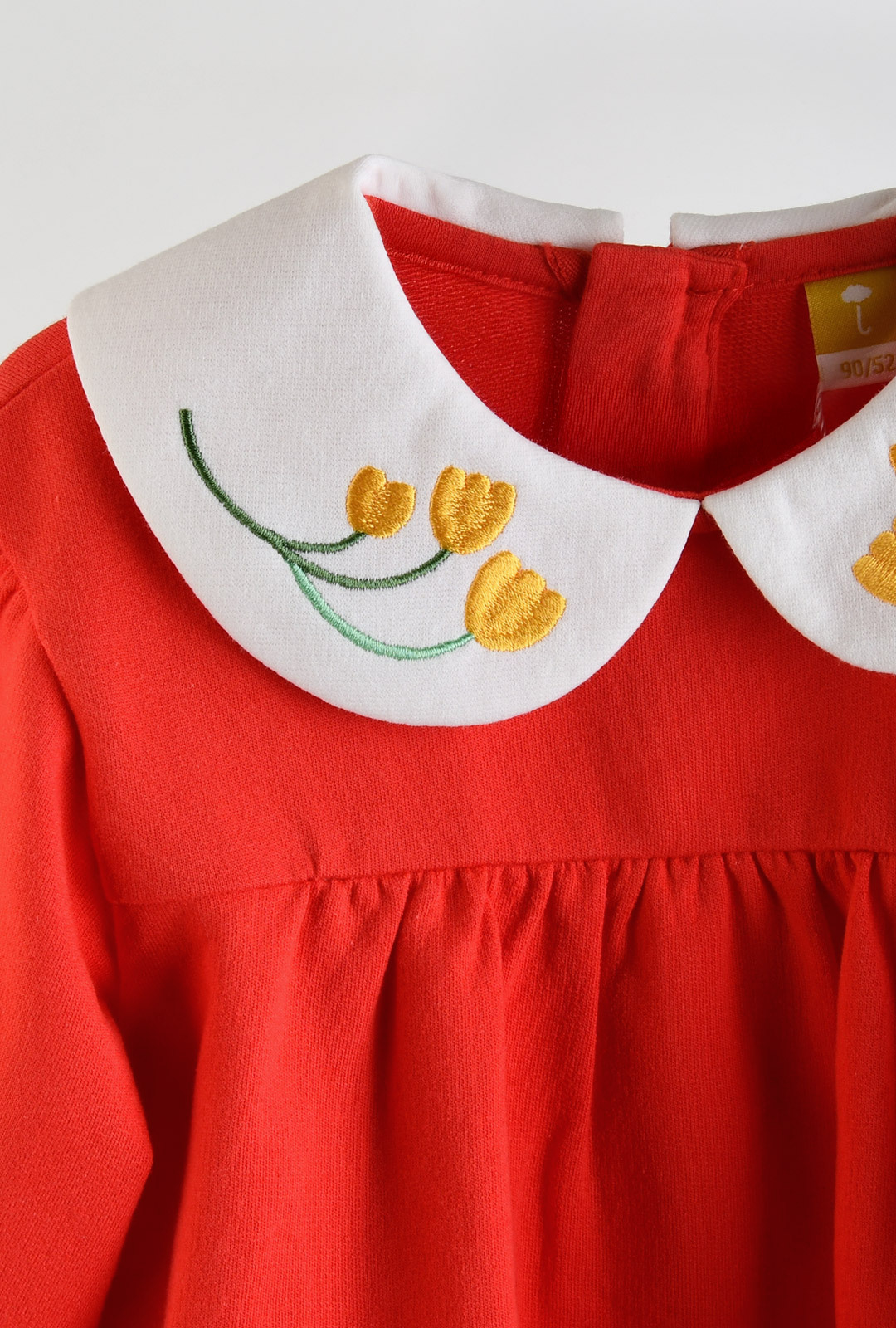 화사한 레드 컬러와 카라의 고급스러운 튤립 자수 포인트