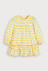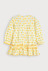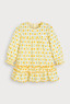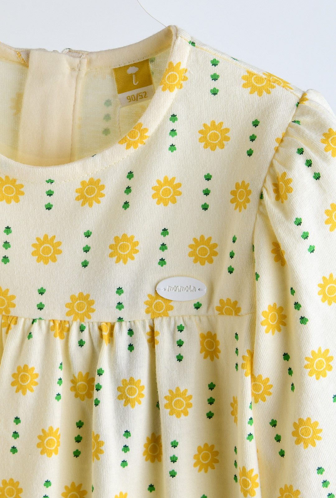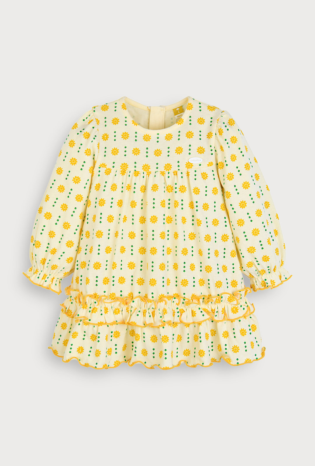 유니크한 플라워 그래픽 패턴에 소매 끝 프릴 디테일과 퍼프 소매 셔링이 포인트 스커트 밑단 옐로우 컬러 인터록 마감 처리로 러블리한 매력 추가 뒷면 지퍼 여밈 구조로 아이에게 입히고 벗기기 용이 단독 손세탁 권장