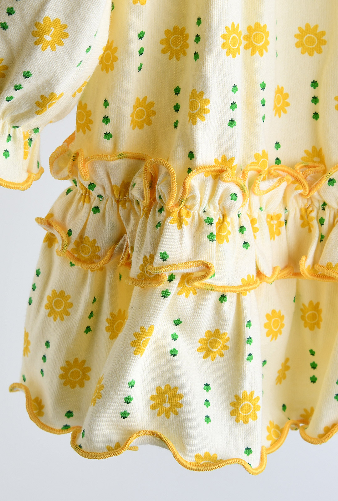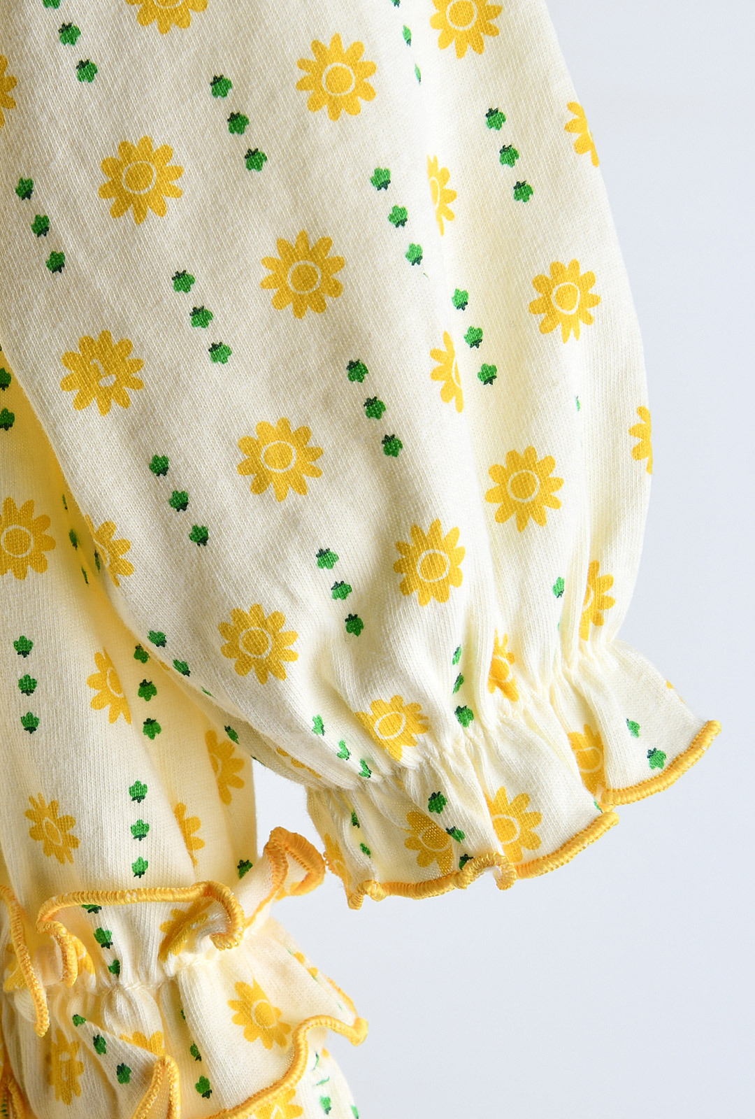 • 옐로우 인터록 마감의 러플단 디자인에 프릴 소매와 살짝 셔링 잡힌 퍼프 소매가 포인트
