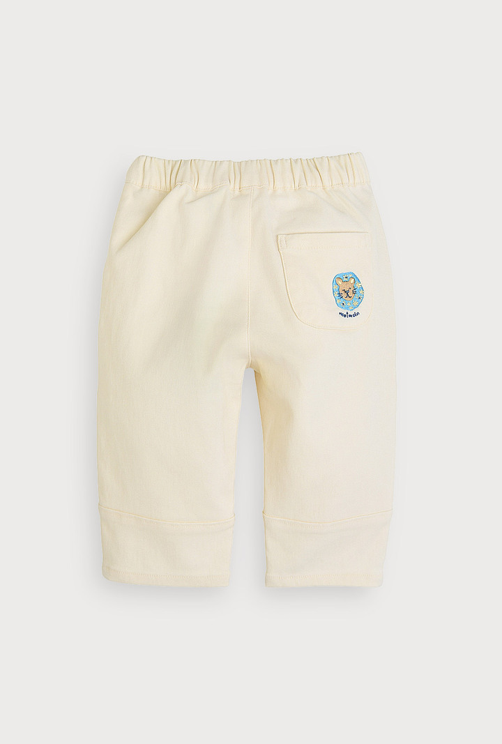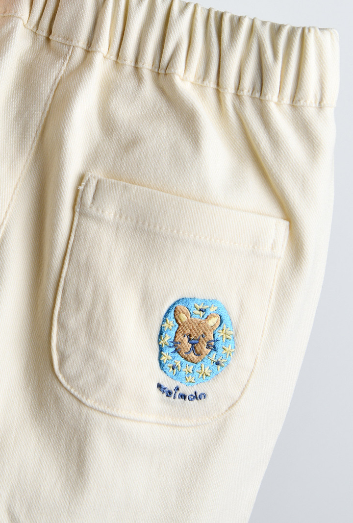 귀여운 실루엣을 연출하는 둥근 핏의 우븐 팬츠 뒤 포켓에 적용된 사자 모티브 자수 디테일