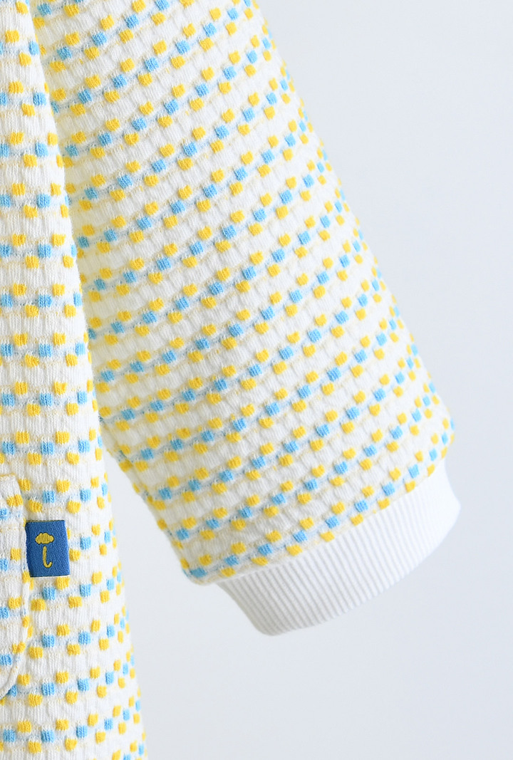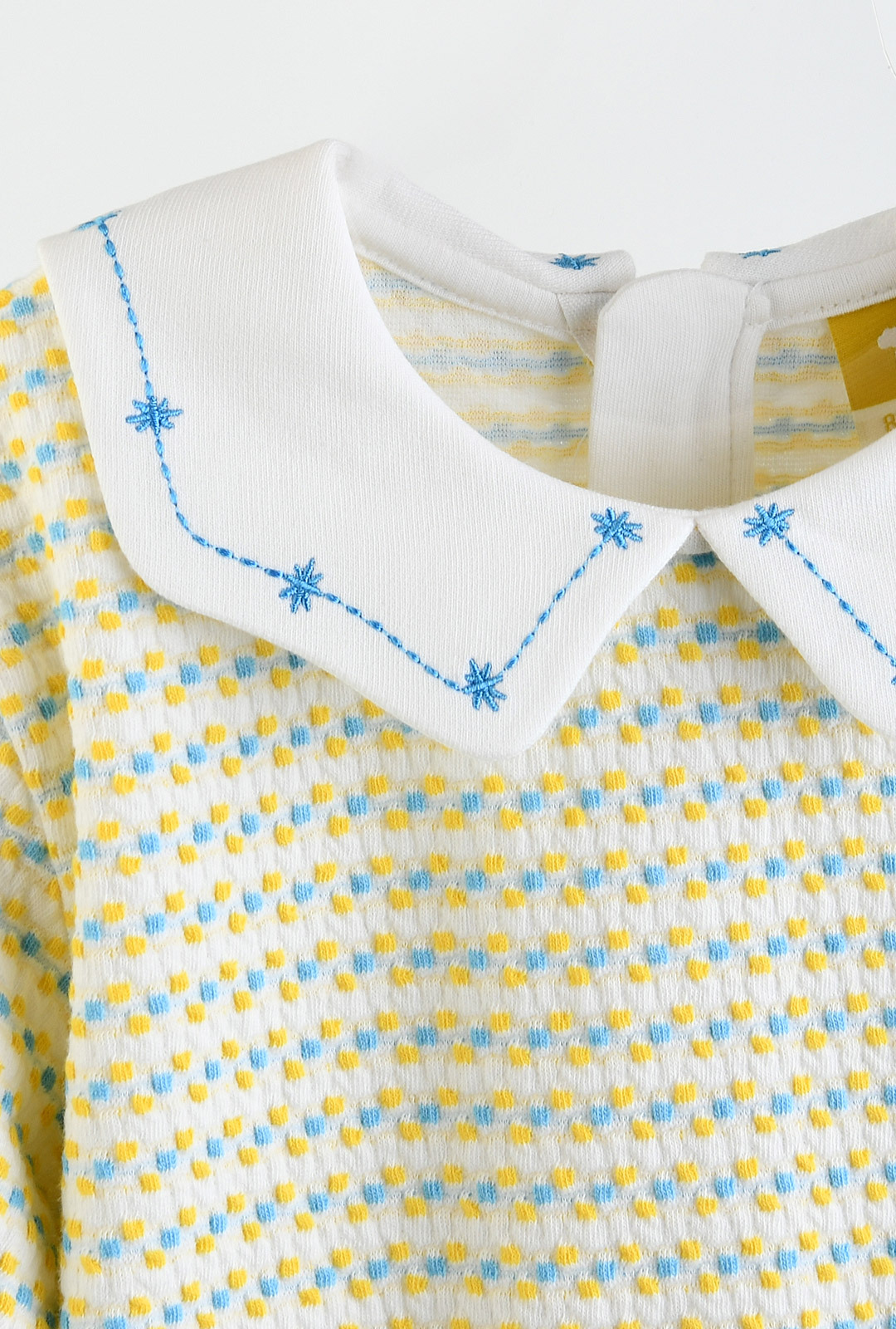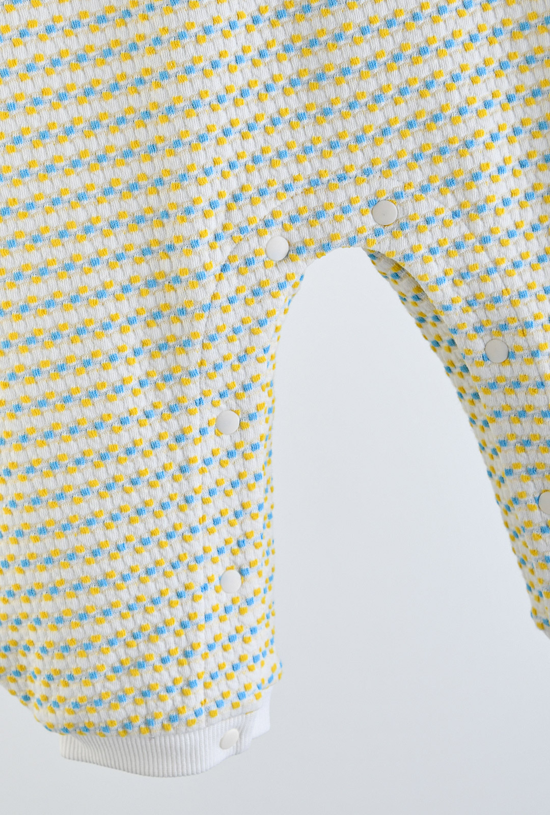 밝고 귀여운 컬러 조합과 니트 같은 조직감으로 고급스러움을 더한 우주복 세트