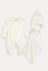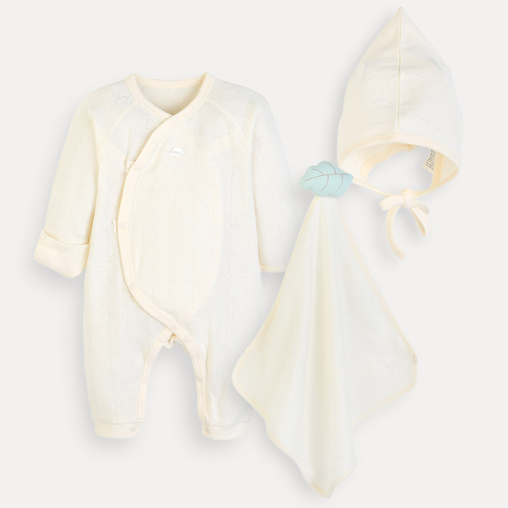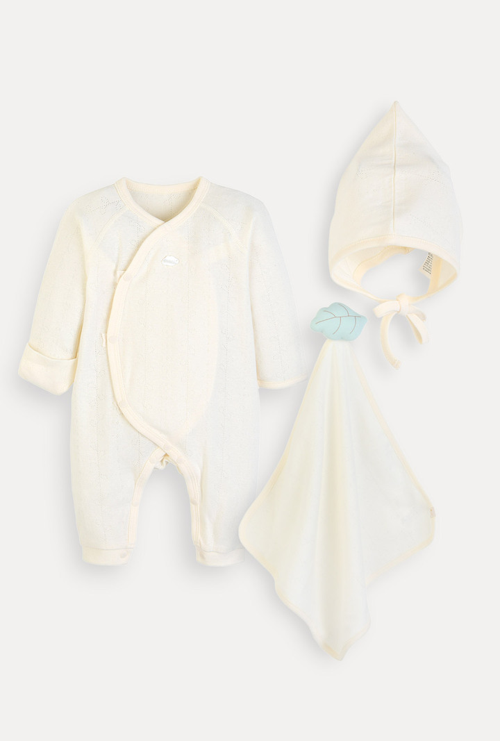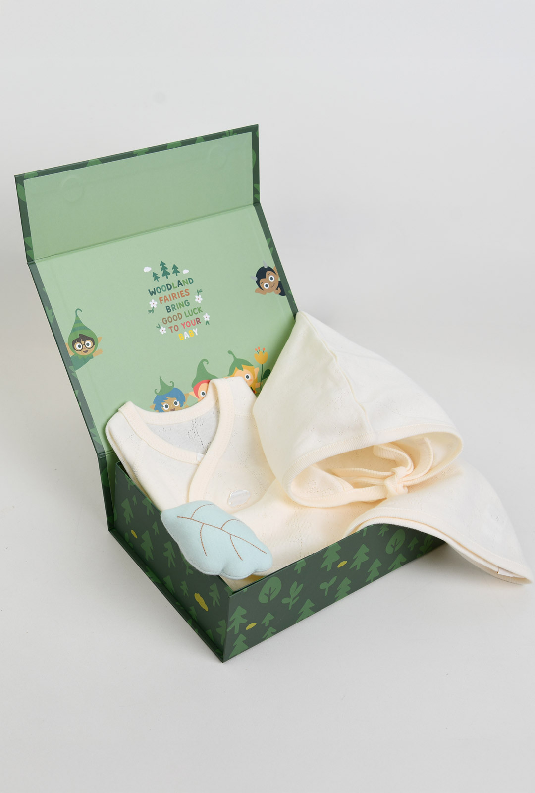뉴본 신생아를 위한 신규 라인, 미니모이에서 소중한 첫 순간. 푸릇푸릇한 리프 자카드 원단에 자개와함께 은은한 광택을 더해주었으며,귀여운 리프 인형이 달린 애착 손수건과 고깔모자가 함께 구성되어 소중한 아이의 첫 시간을 따뜻하게 감싸주는 실용적인 선물세트