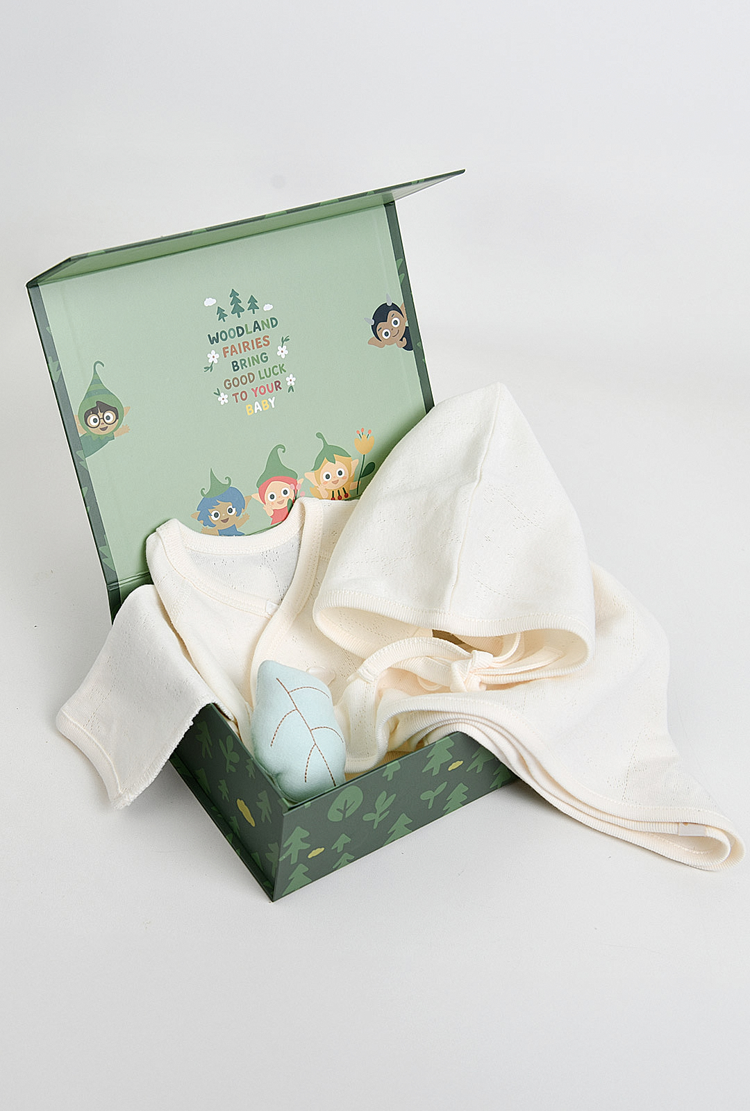 푸릇푸릇한 리프 자카드 원단에 애착 손수건과 고깔모자가 포함된 실용적인 선물 세트