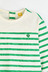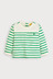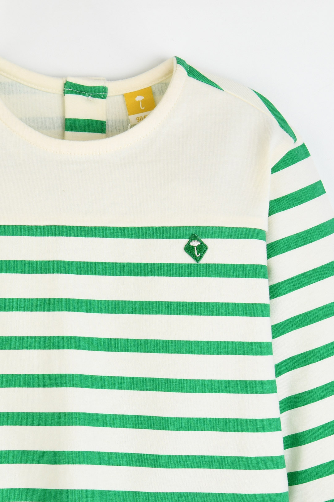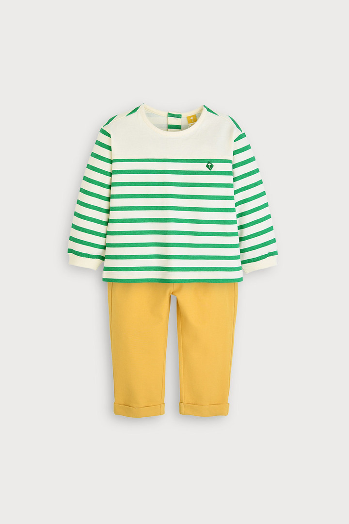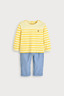 화사한 스트라이프 티셔츠와 데님 라이크 팬츠 구성으로 스타일과 활동성을 모두 잡은 상하복