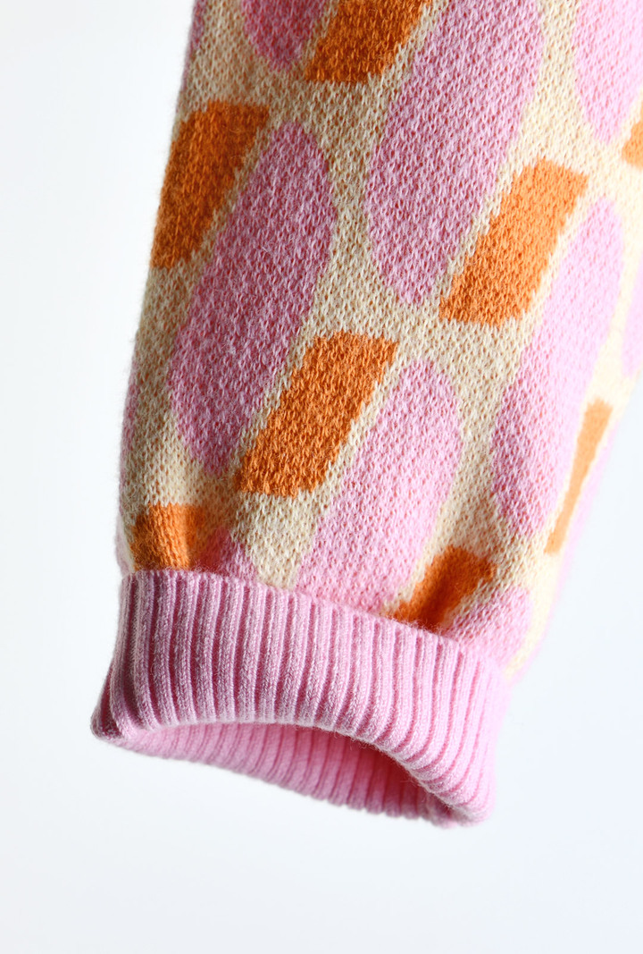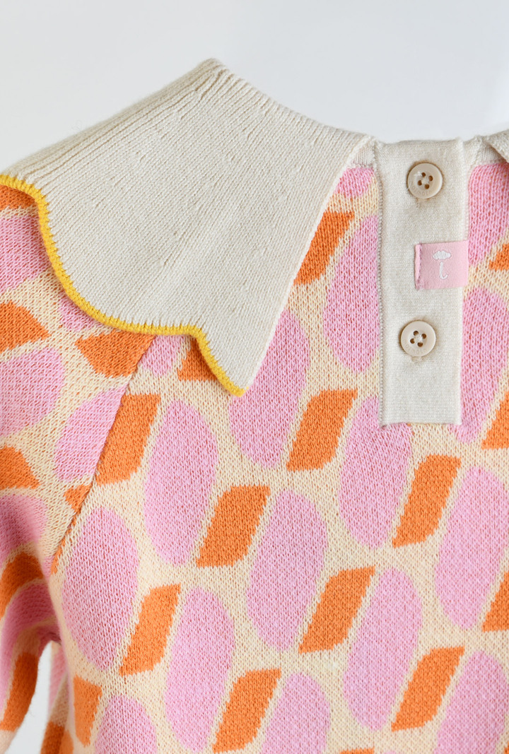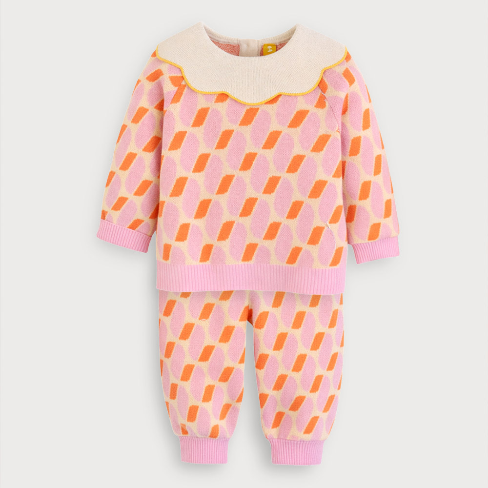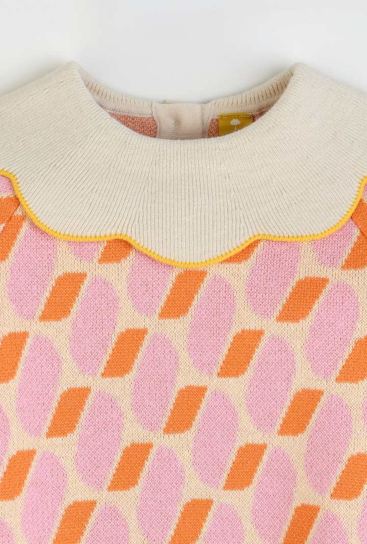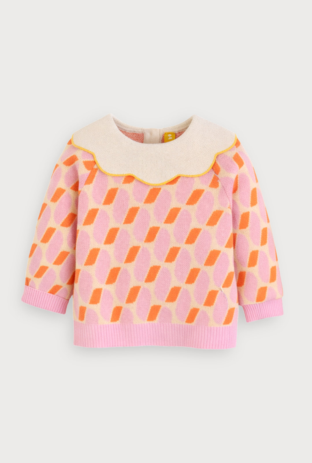 Q1. 주요 착용 연령대가 어떻게 되나요 A1. 80호부터 110호까지 구성되어 베이비부터 토들러 초반 연령대 아이들이 입기 좋습니다. Q2. 세탁 시 주의해야 할 점이 있나요 A2. 소재 특성상 건조기 사용은 피해주시고 울샴푸로 손세탁 후 뉘어서 건조해 주세요. Q3. 아이가 입었을 때 까슬거리지는 않나요 A3. 면이 혼용된 14GG 니트 소재로 제작되어 부드럽고 편안한 촉감을 제공합니다. Q4. 디자인 포인트가 무엇인가요 A4. 독특한 기하학 패턴과 큼지막한 스칼럽 카라가 디자인의 핵심 포인트입니다. Q5. 옷이 많이 비치는 편인가요 A5. 비침이 없는 소재로 제작되어 이너 걱정 없이 단독으로 착용하기 좋습니다. Q6. 신축성이 있어 활동하기 편한가요 A6. 보통 수준의 신축성을 갖추고 있어 아이들의 일상적인 활동에 무리가 없습니다.