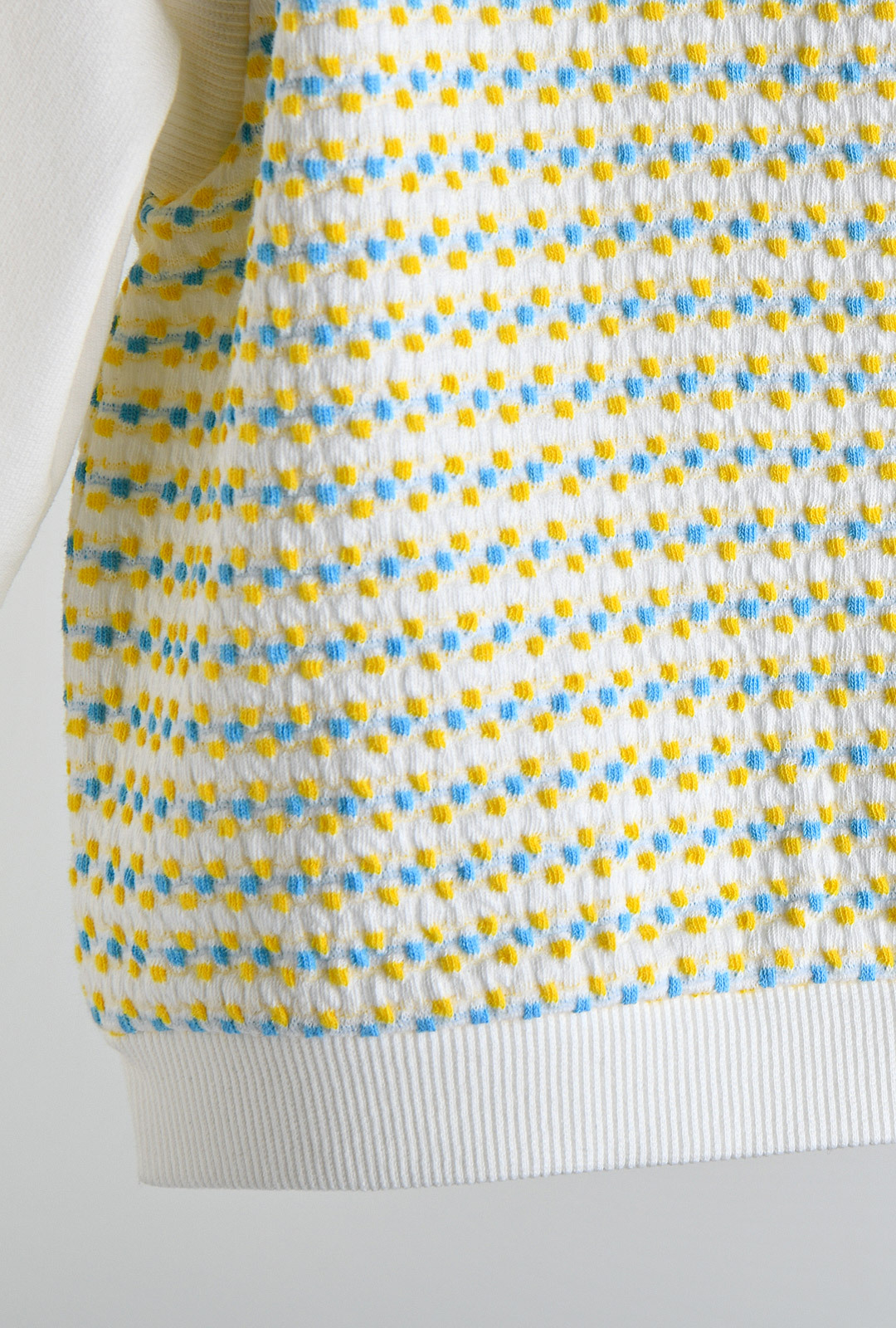 밝고 귀여운 컬러 조합의 블록 자카드 소재 레이어드 디자인 조끼를 겹쳐 입은 듯한 깔끔하고 단정한 무드 연출