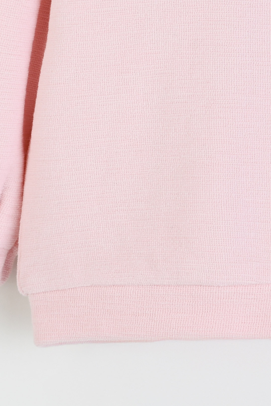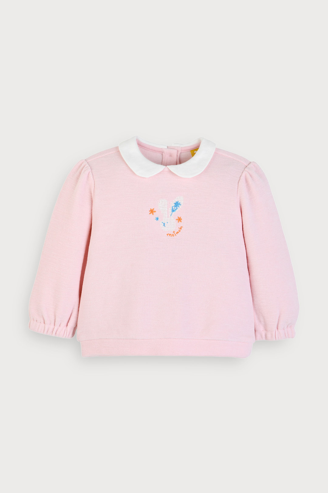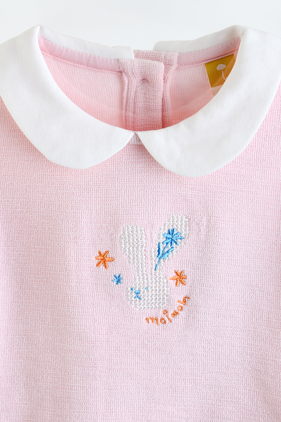 소프트하고 러블리한 컬러감과 신축성 좋은 조직감 소재의 쁘띠 카라 티셔츠. 십자수로 짠듯한 토끼 그래픽이 러블리하고 귀여움을 더해준 아이템
