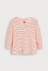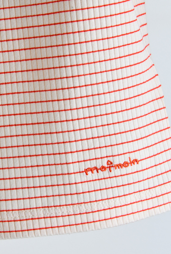 A. 묶어 놓은 듯한 입체적인 리본 디테일과 스퀘어 넥라인이 특징입니다. 선명한 레드 스트라이프가 얼굴을 더욱 화사하게 만들어줍니다.