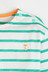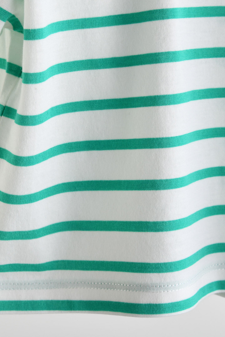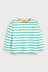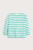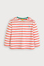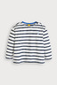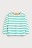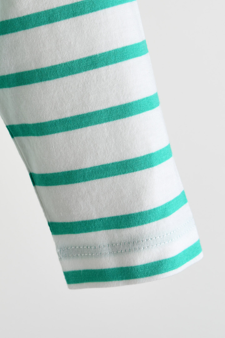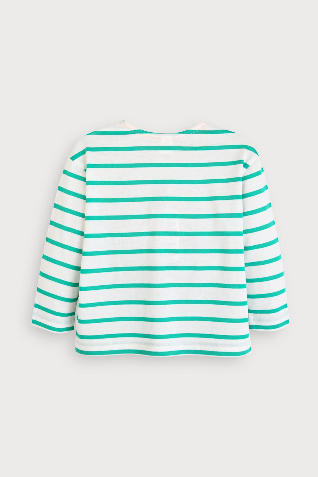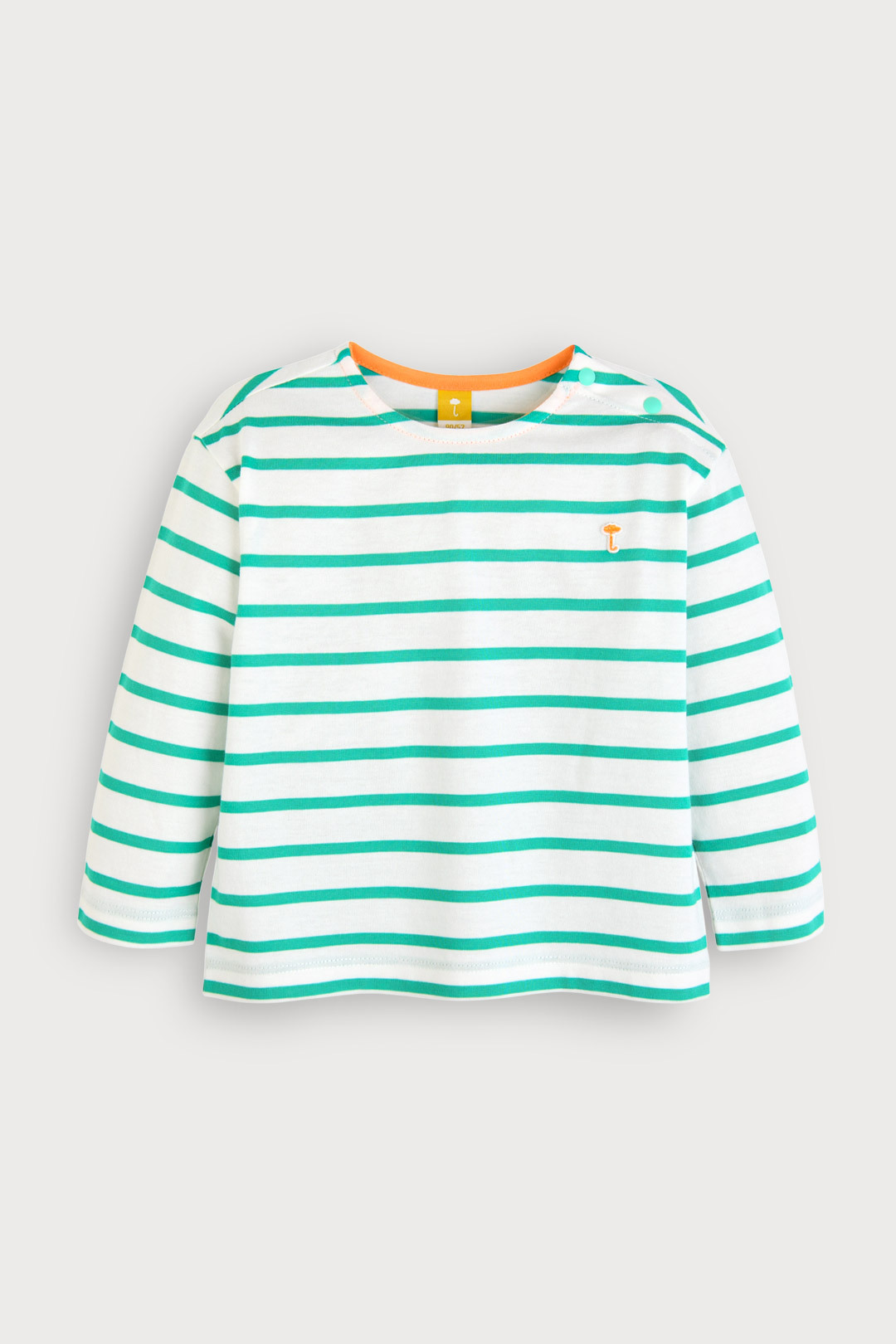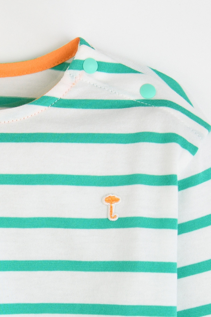 부드러운 모달소재를 사용한 봄에 입기 좋은 간절기 긴팔 티셔츠. 어깨 플라스틱 스냅 여밈이 있는 디자인. 선명한 스트라이프에 배색 심볼 와펜으로 포인트를 주어 다양한 하의와 코디하기 좋은 아이템
